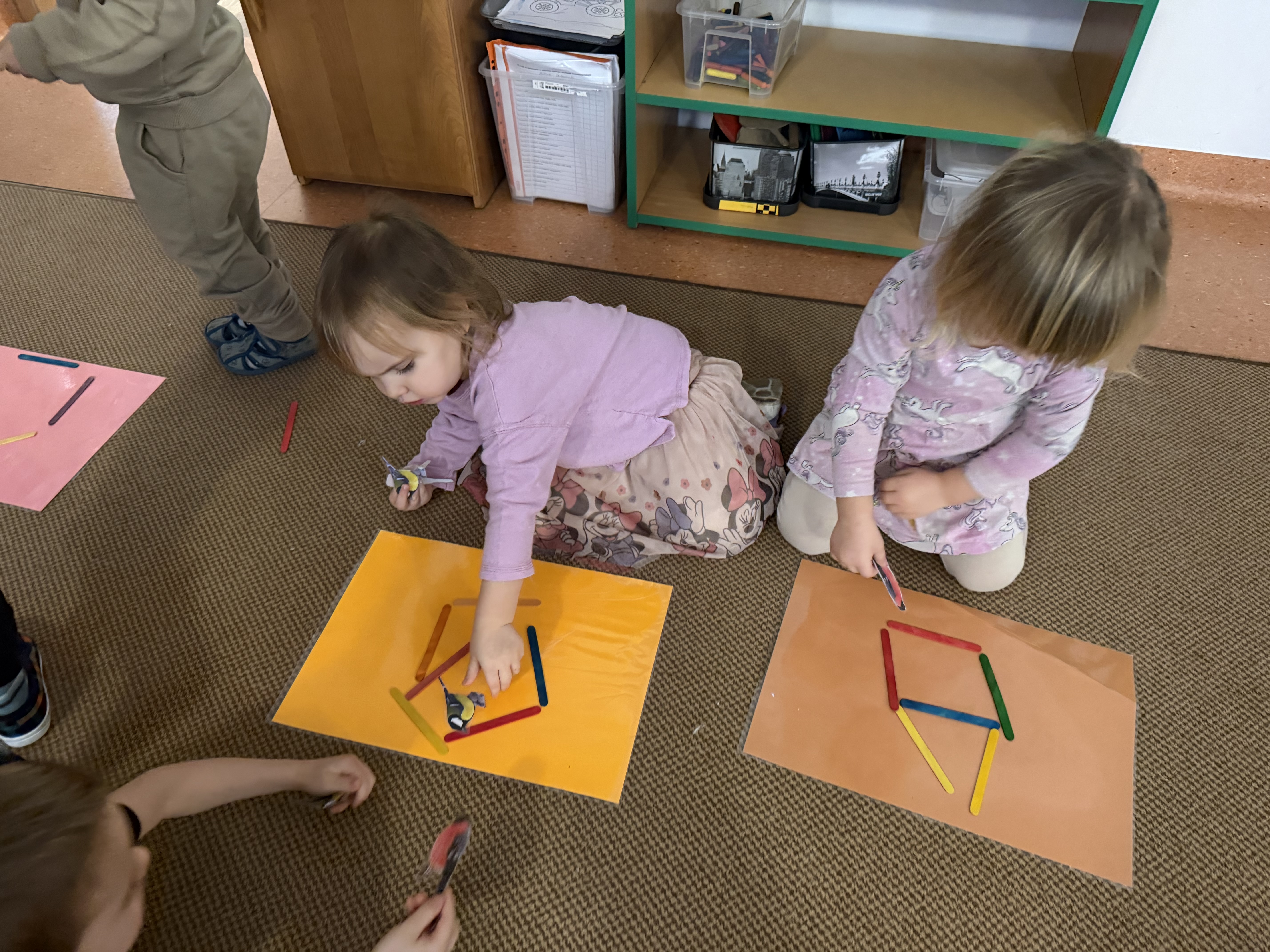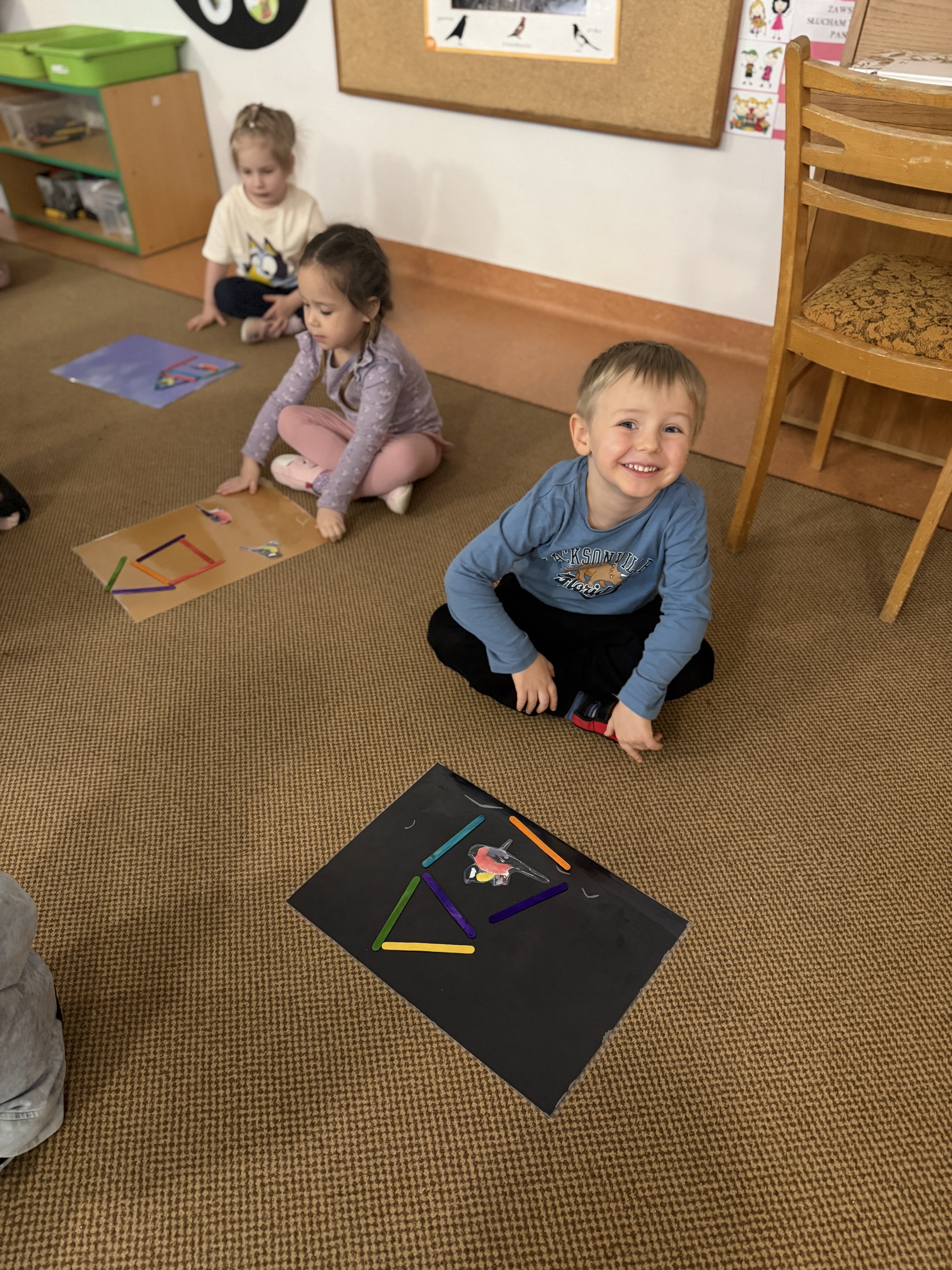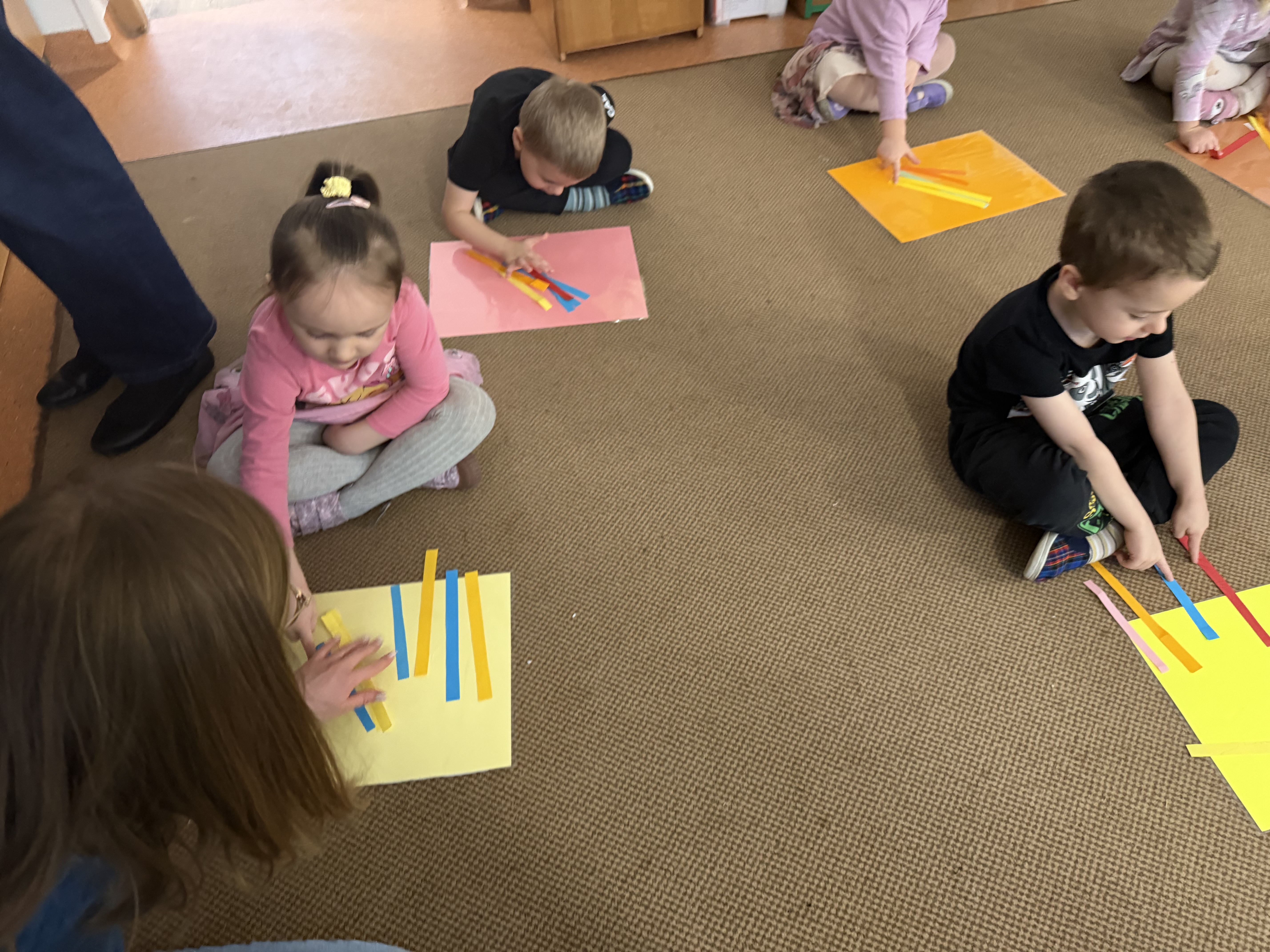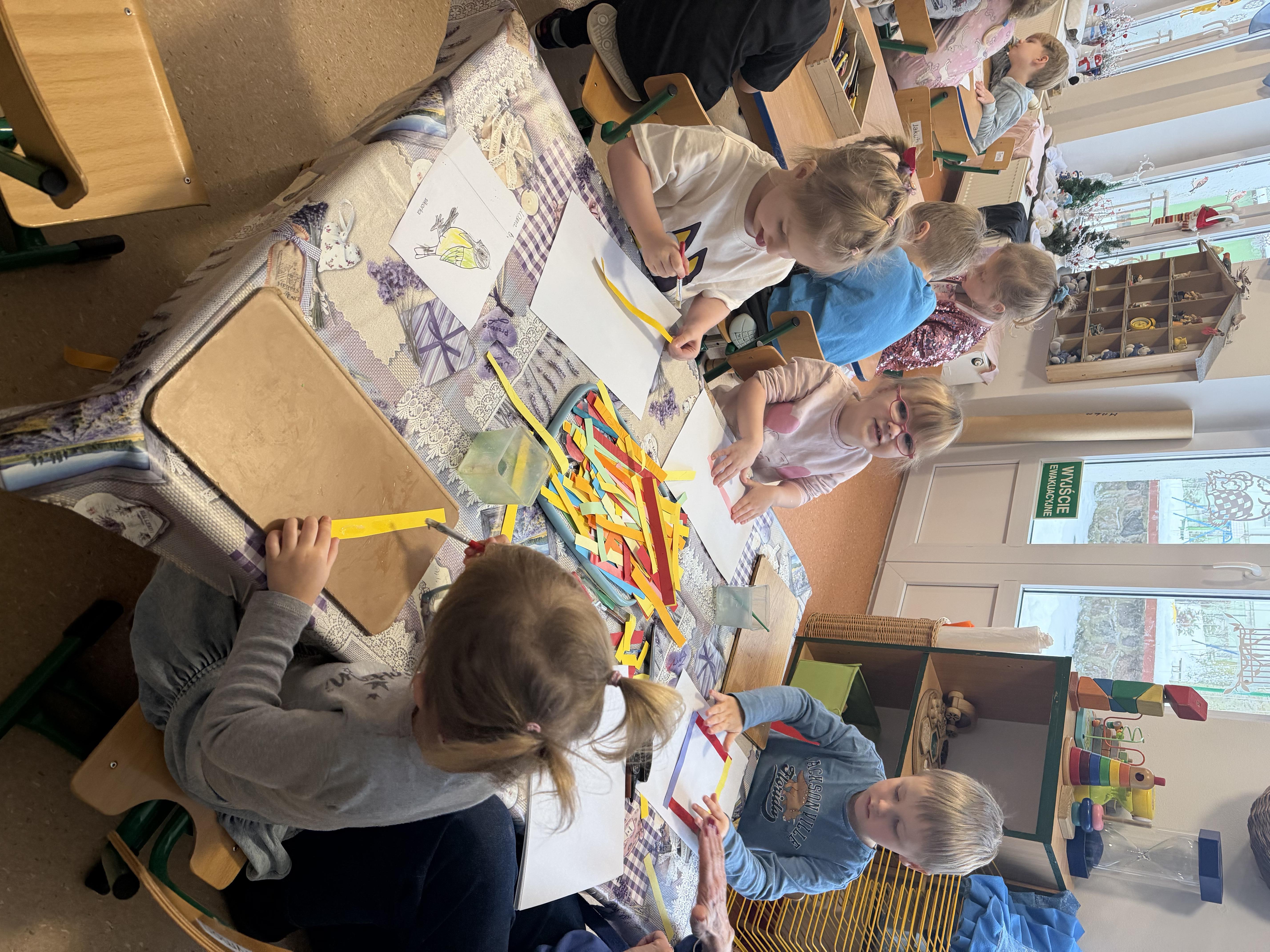 budowaliśmy karmniki z kolorowych patyczków i pasków, które następnie przenosiliśmy na kartkę – była to doskonała okazja do utrwalenia liczenia do 6;