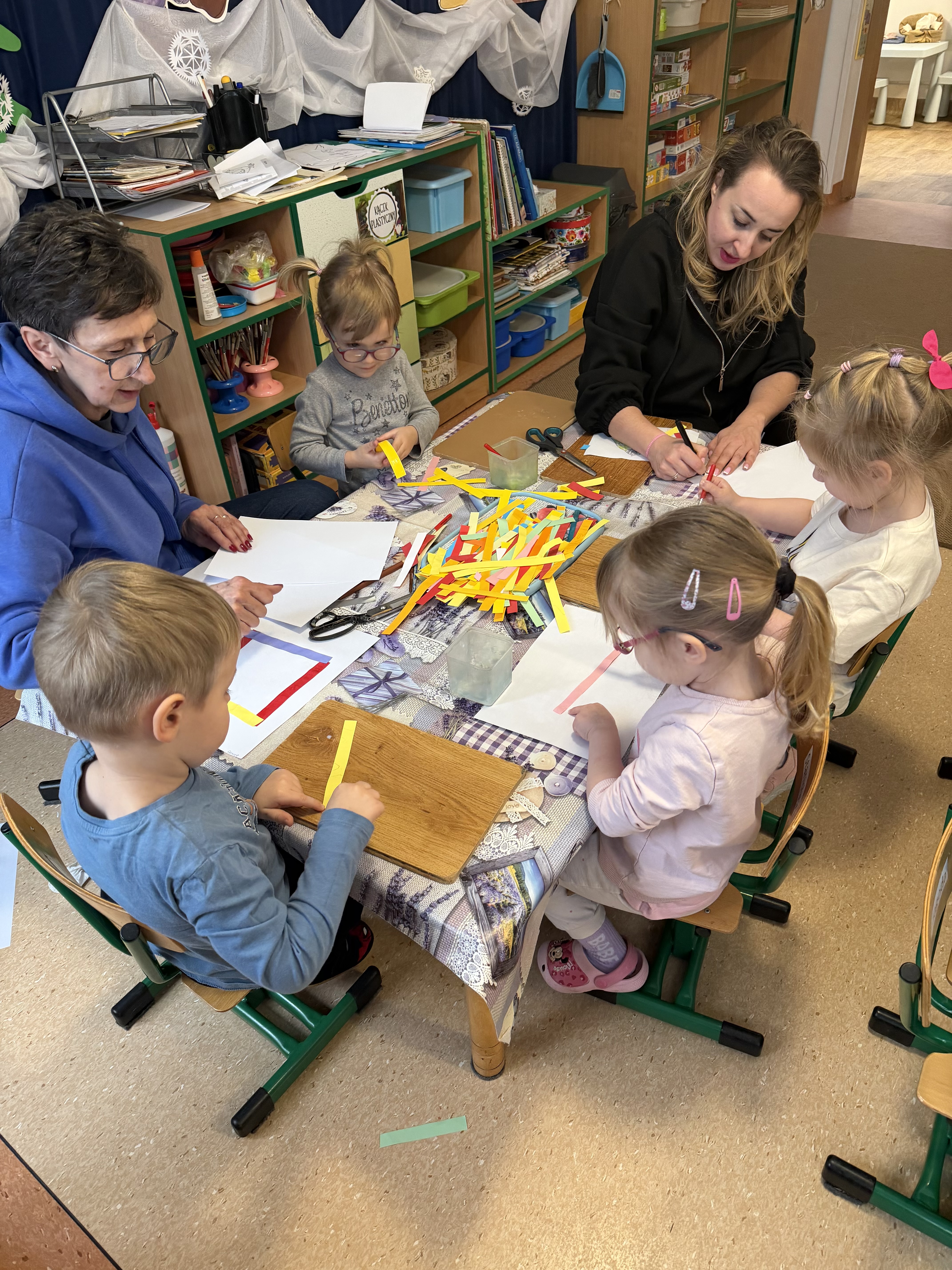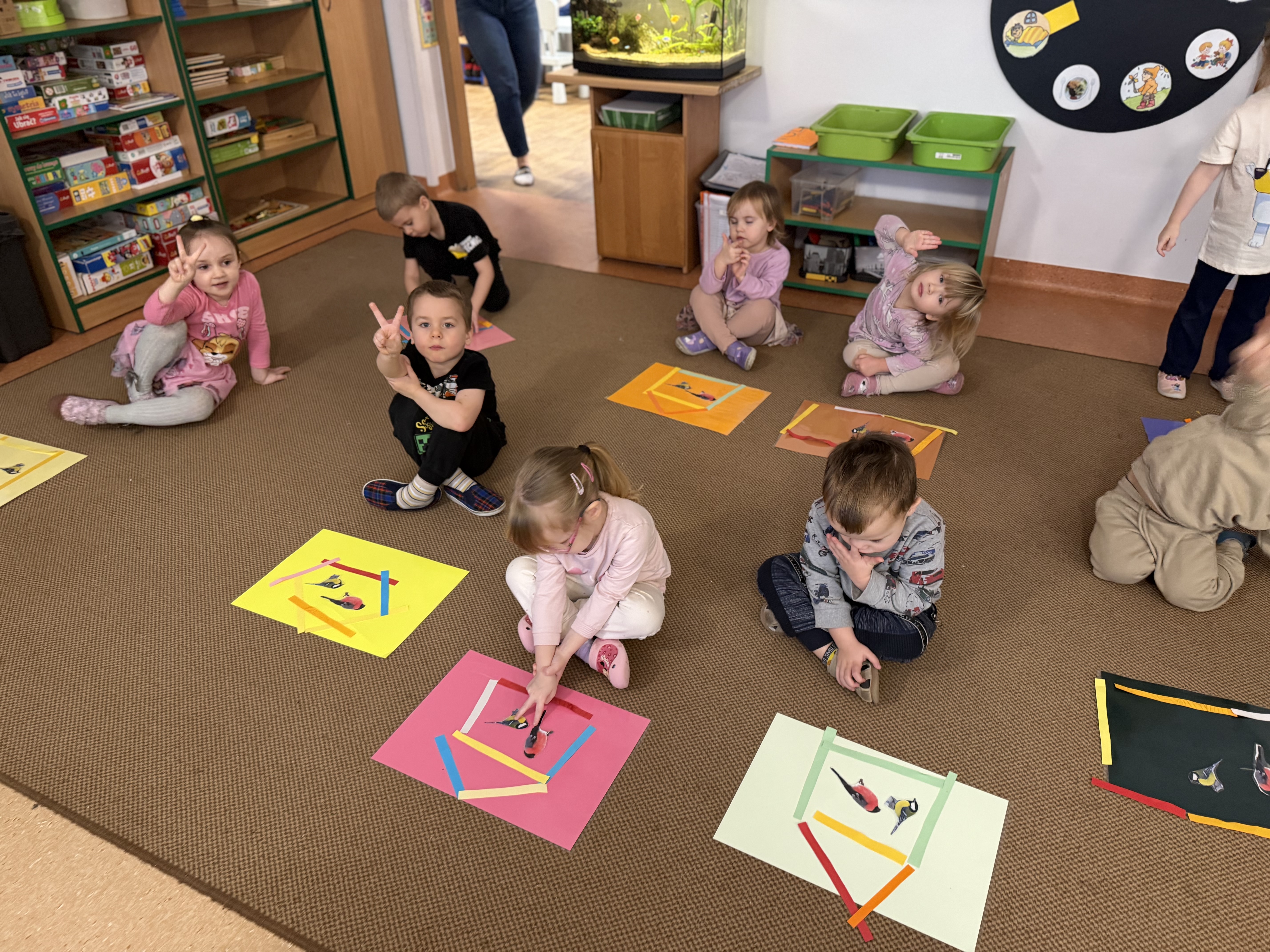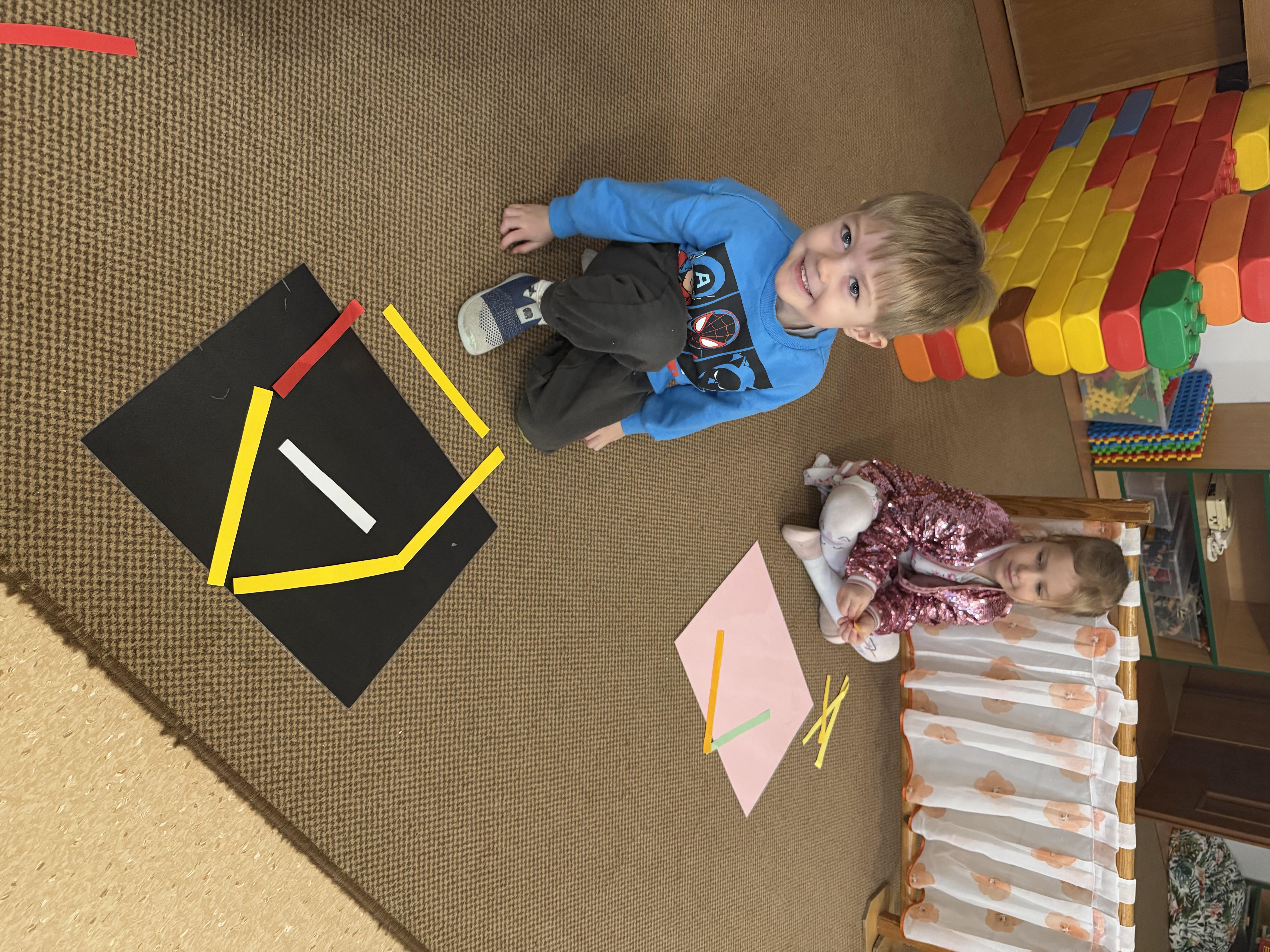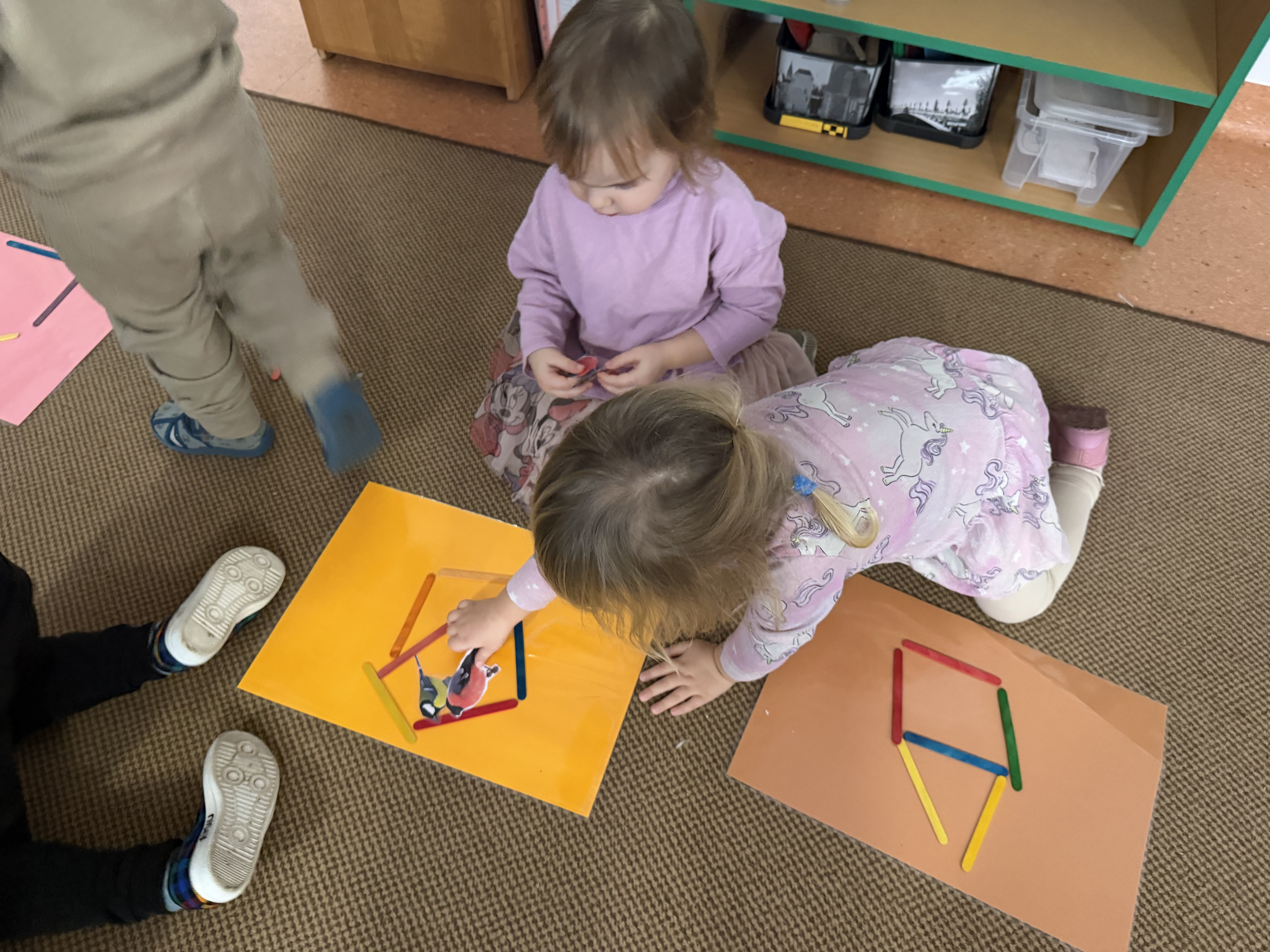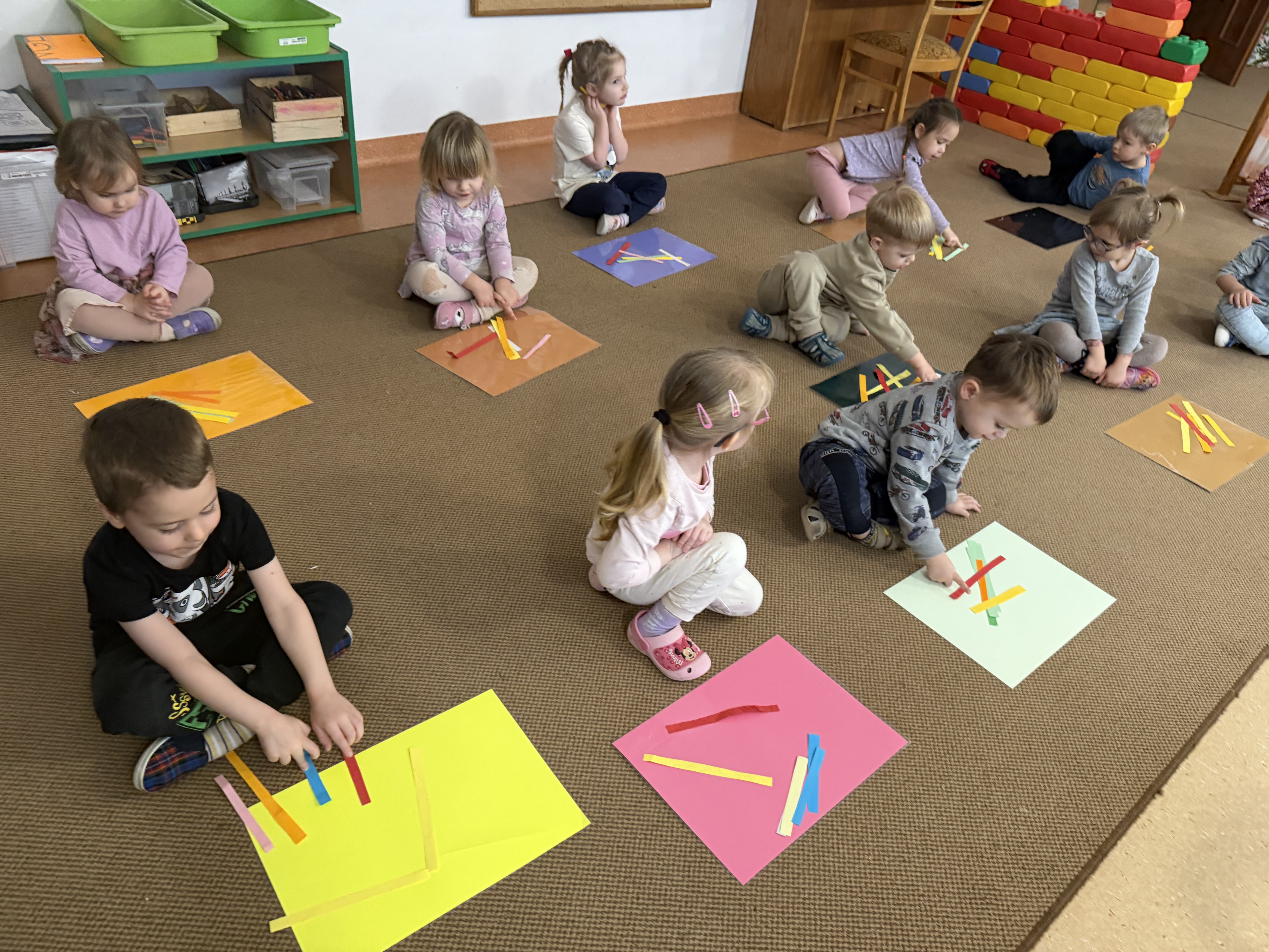 budowaliśmy karmniki z kolorowych patyczków i pasków, które następnie przenosiliśmy na kartkę – była to doskonała okazja do utrwalenia liczenia do 6;