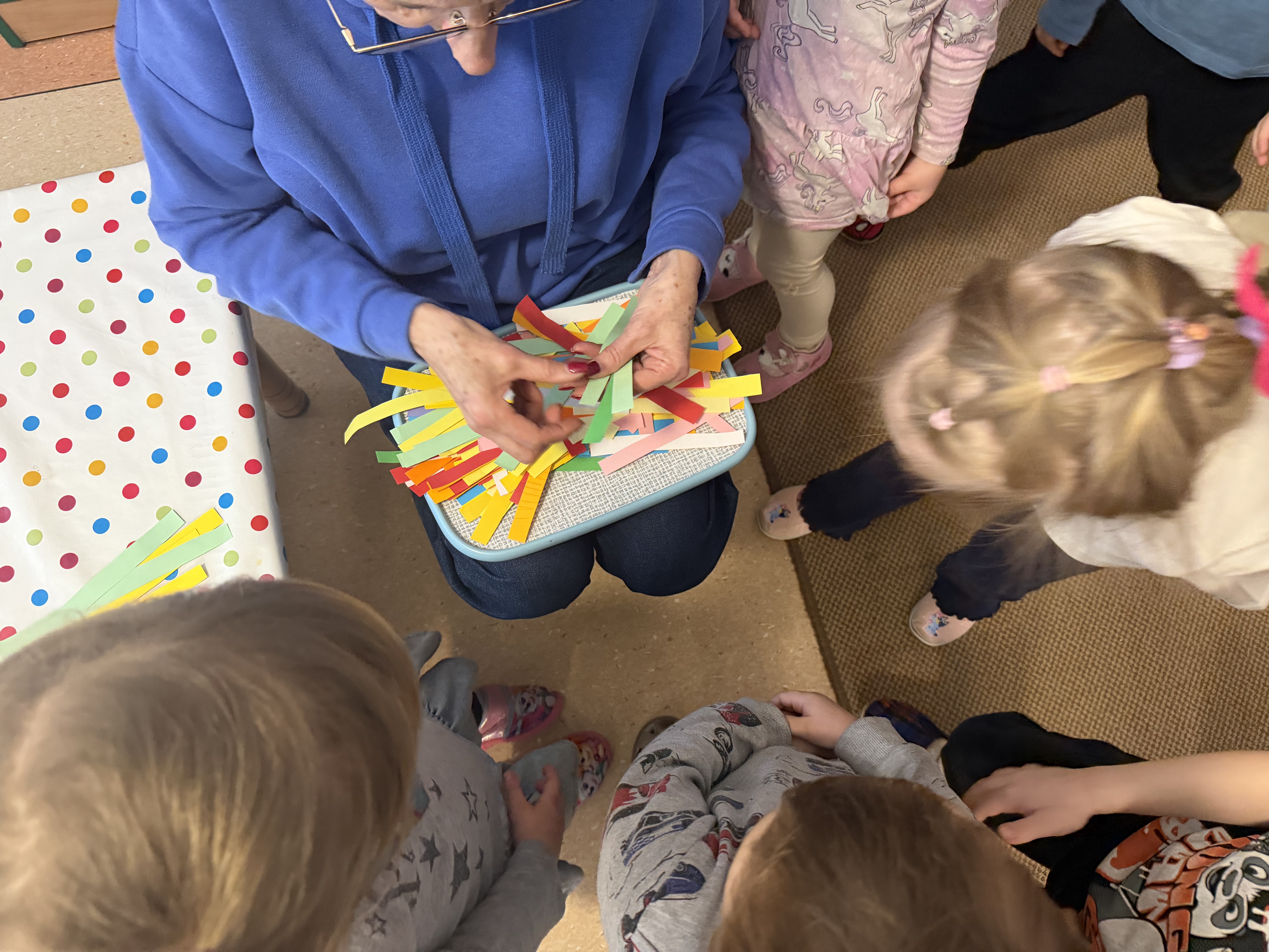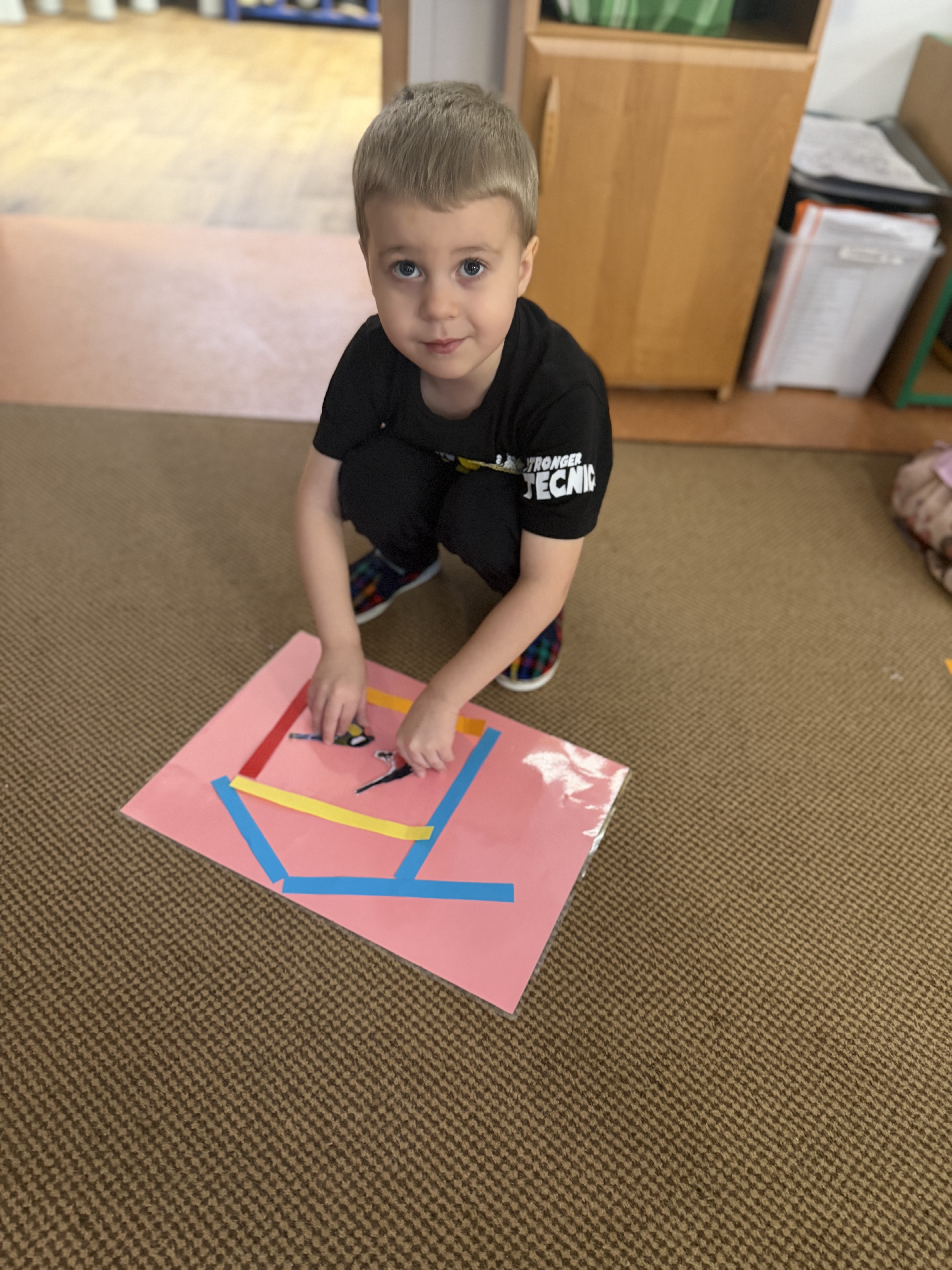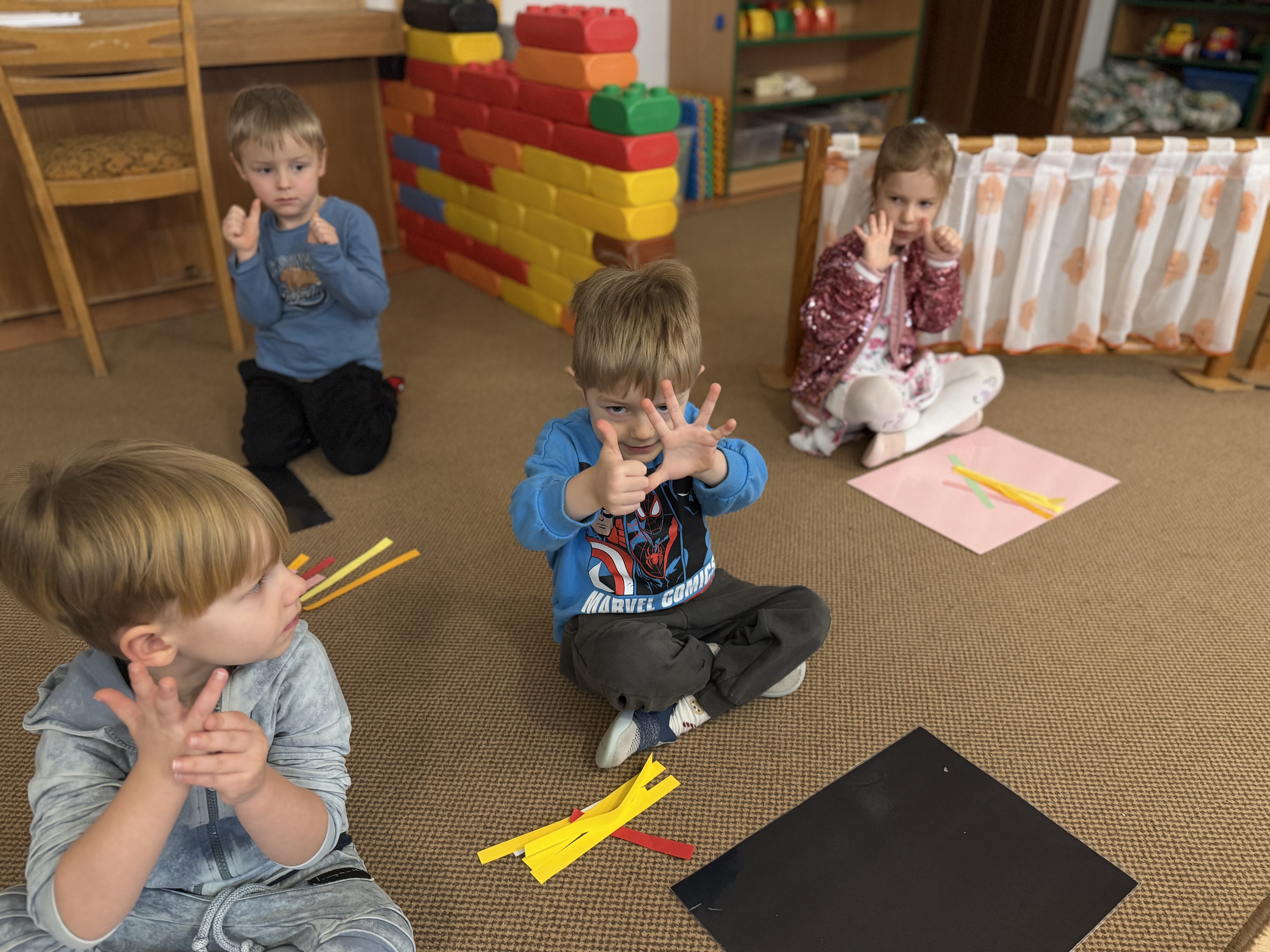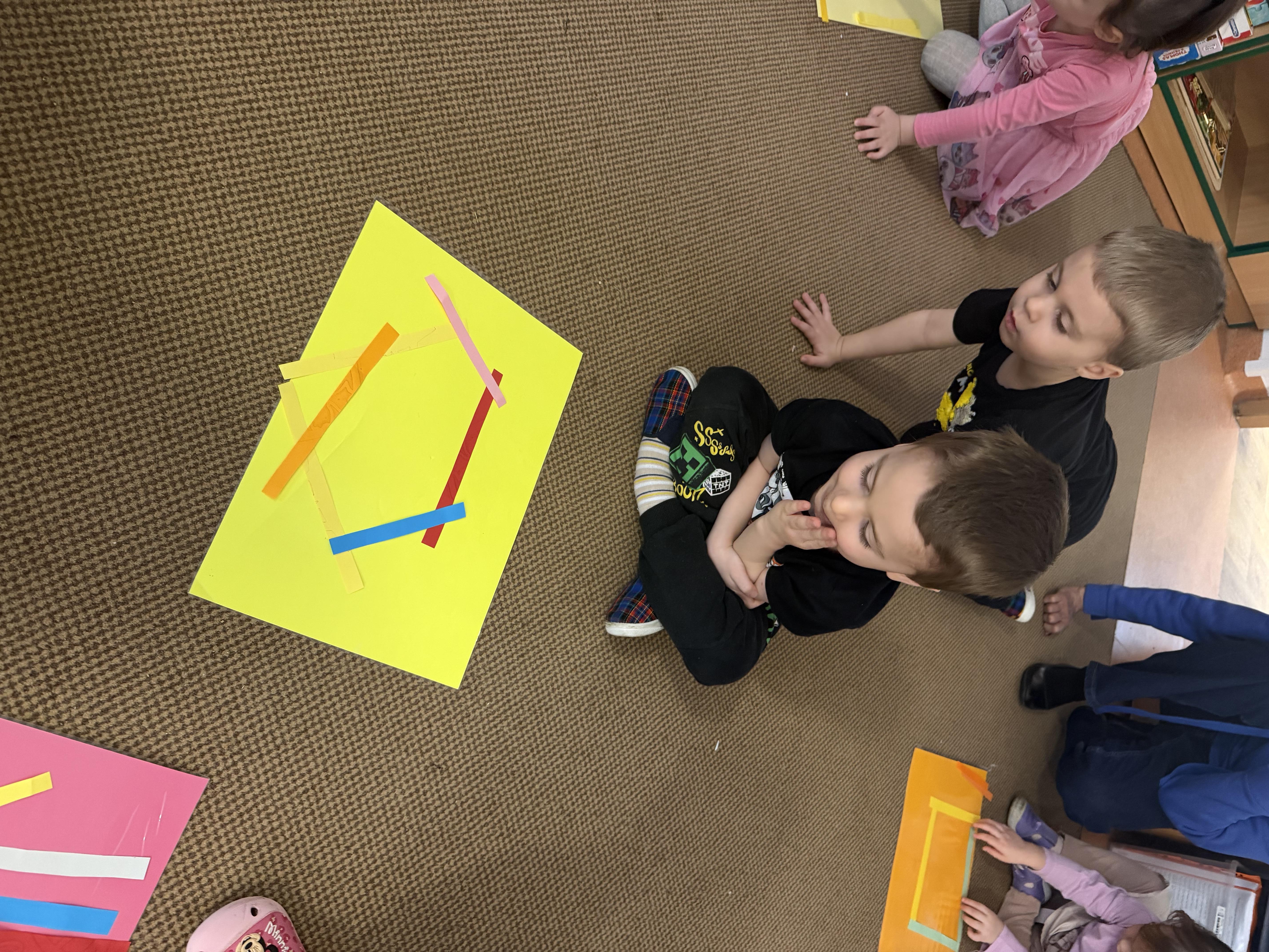 budowaliśmy karmniki z kolorowych patyczków i pasków, które następnie przenosiliśmy na kartkę – była to doskonała okazja do utrwalenia liczenia do 6;