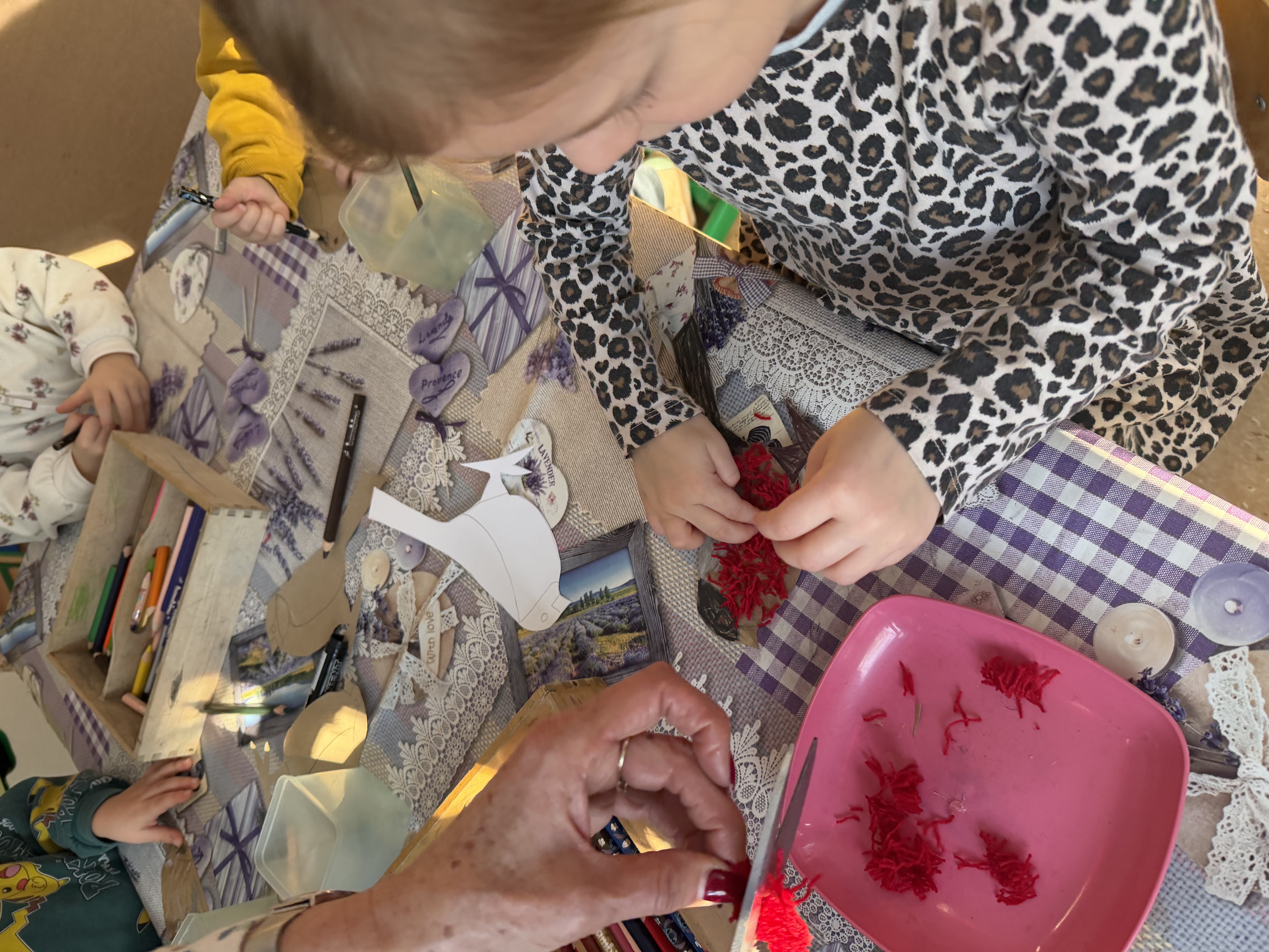 oraz ozdabialiśmy gile włóczką, ćwicząc przy tym sprawność rączek i kreatywność.