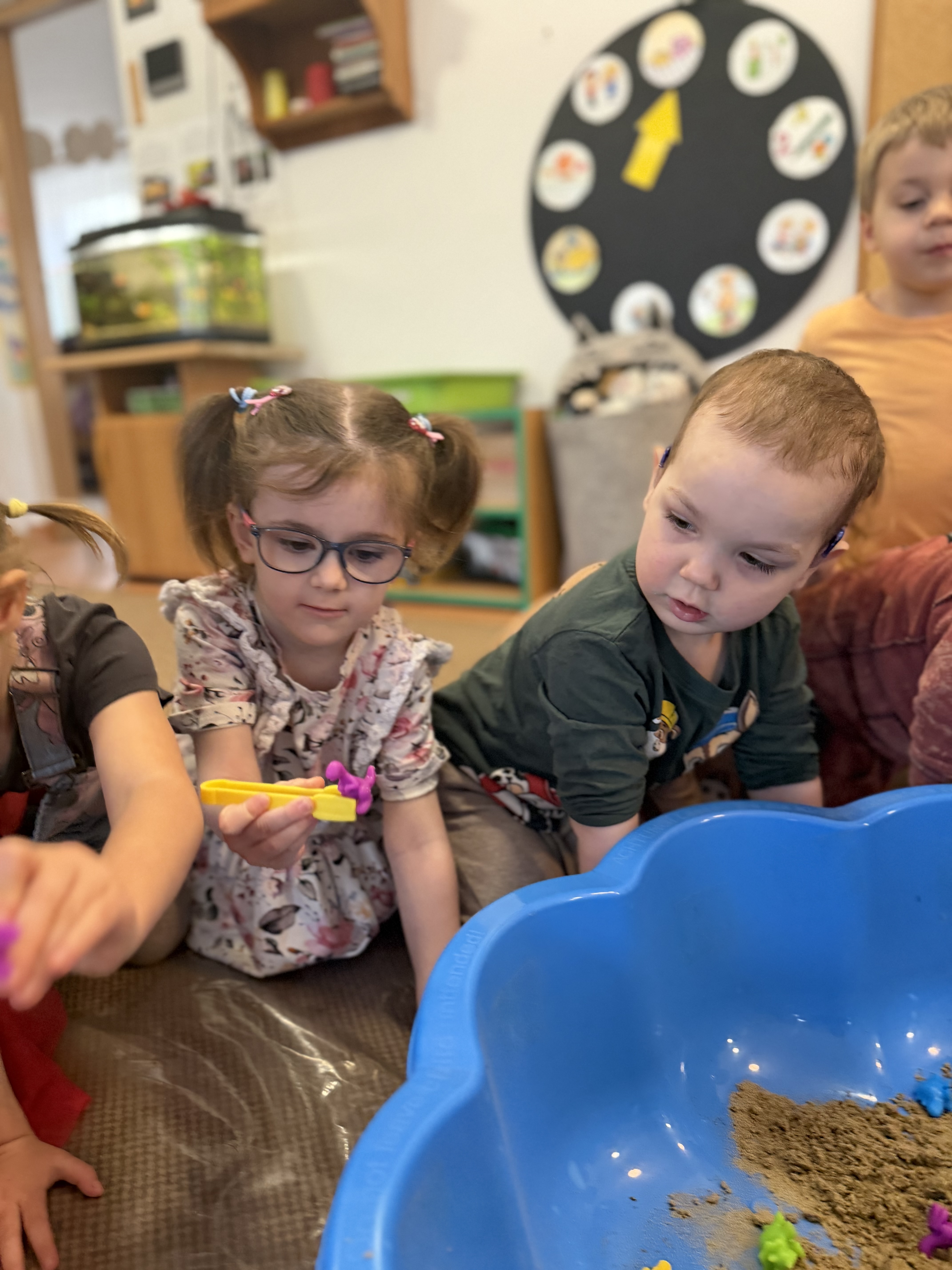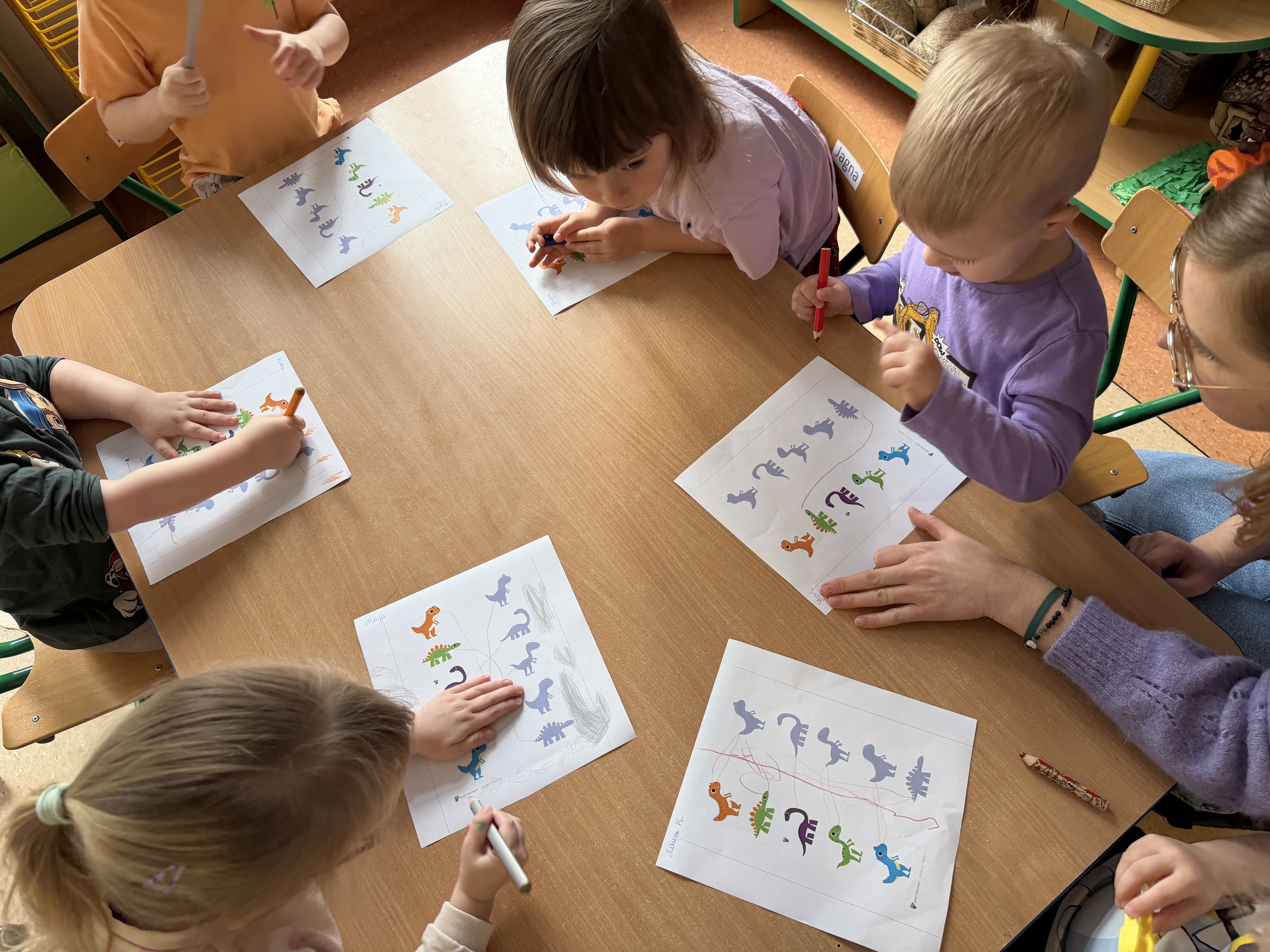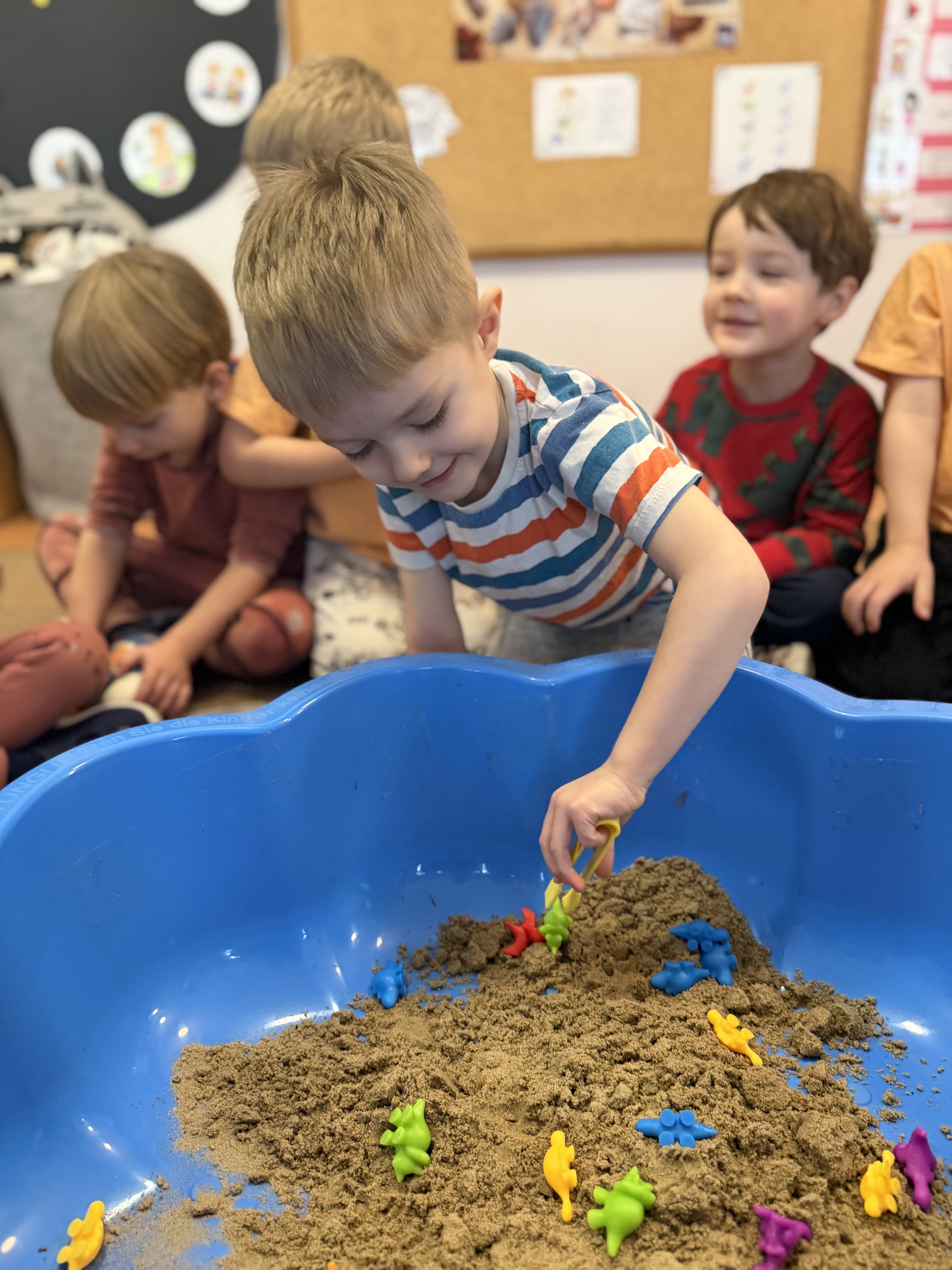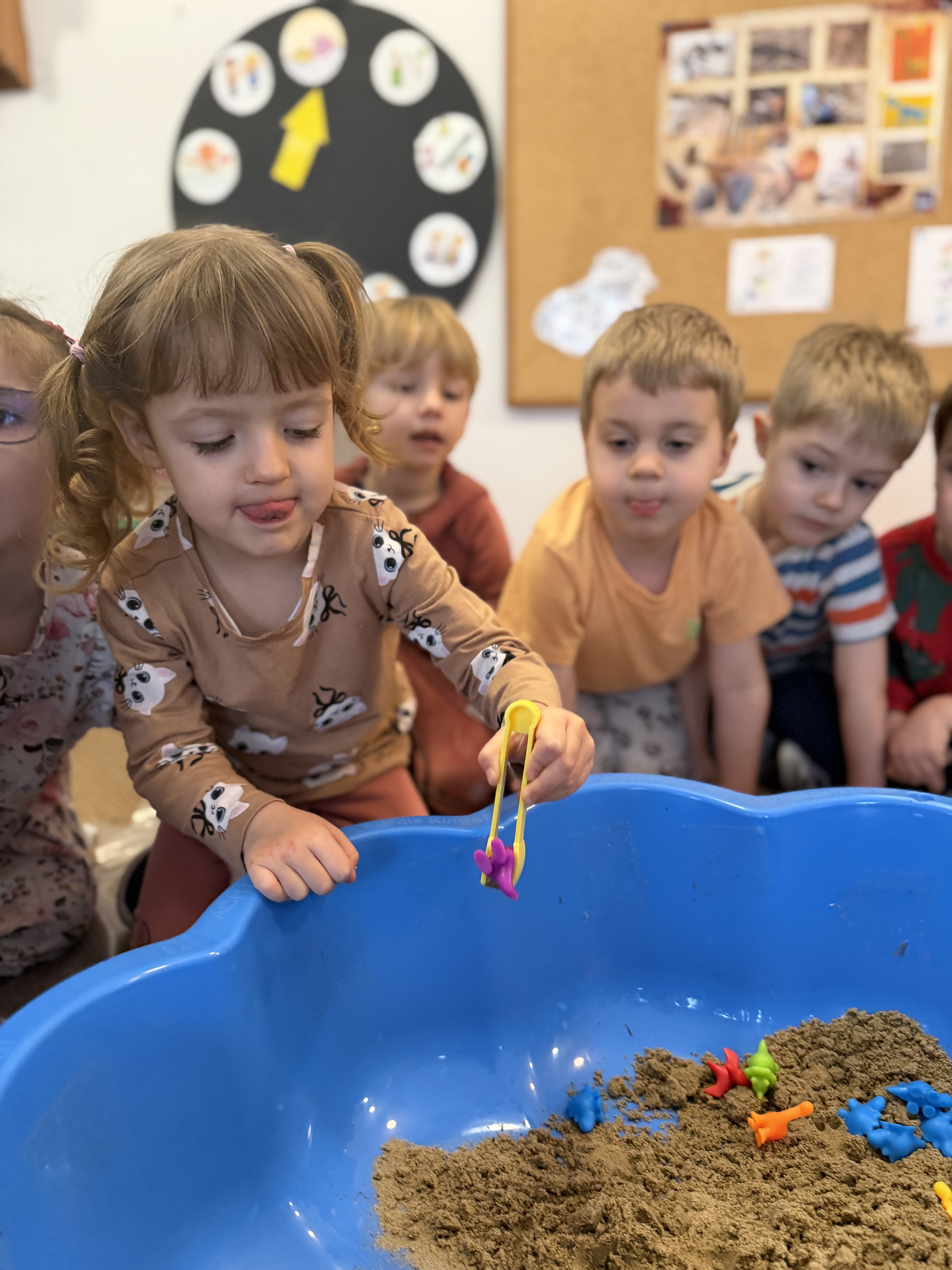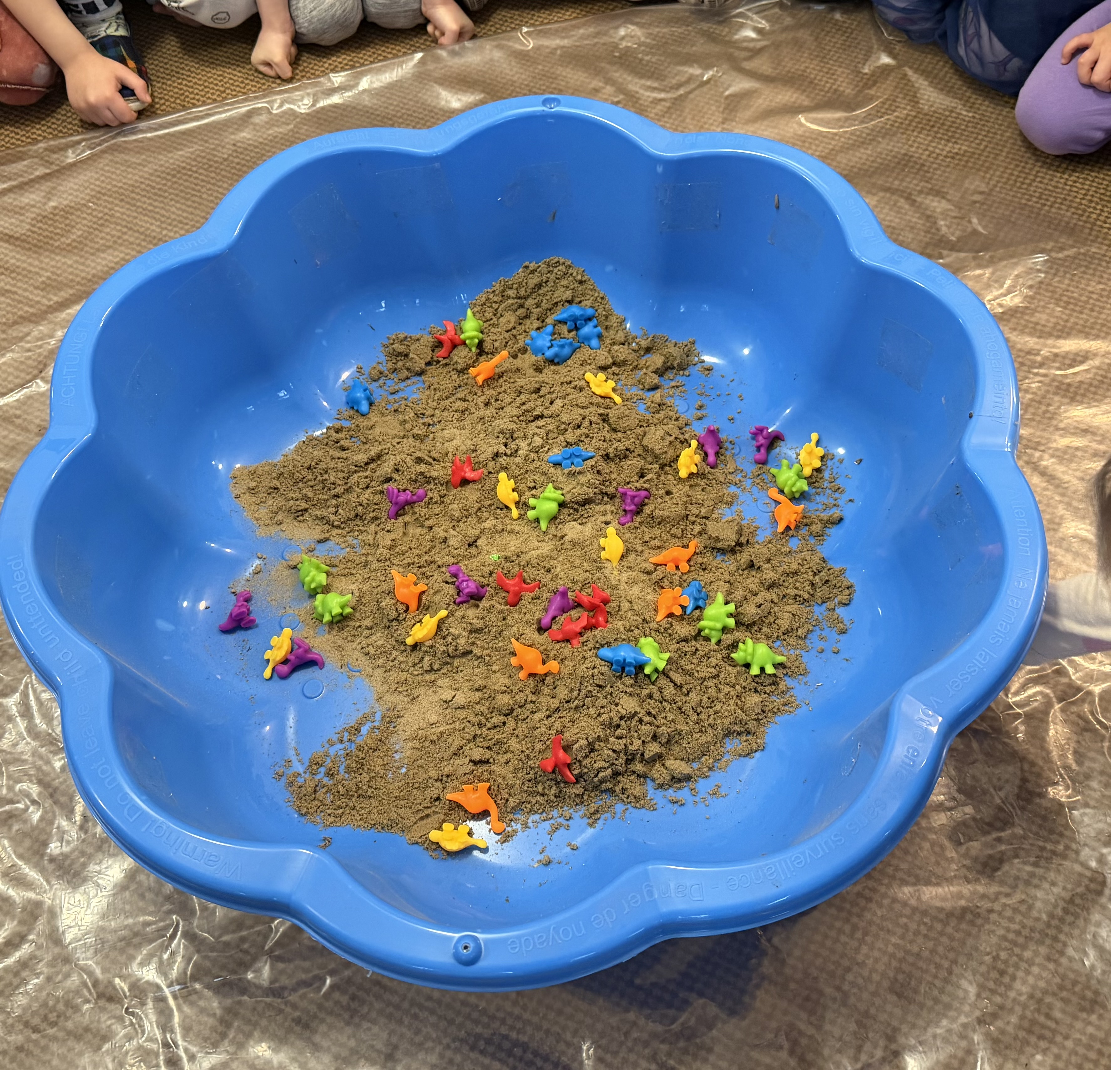 W tym tygodniu poznaliśmy dinozaury, rozmawialiśmy o pracy archeologów i wcieliliśmy się w ich role ćwicząc motorykę małą;).