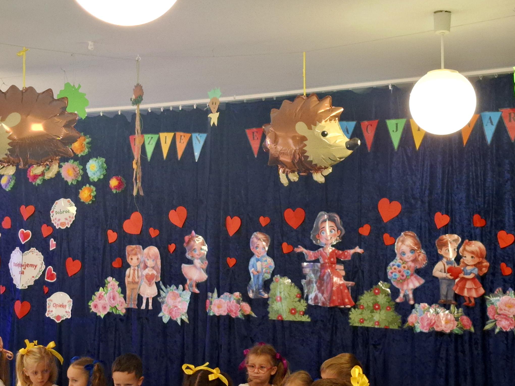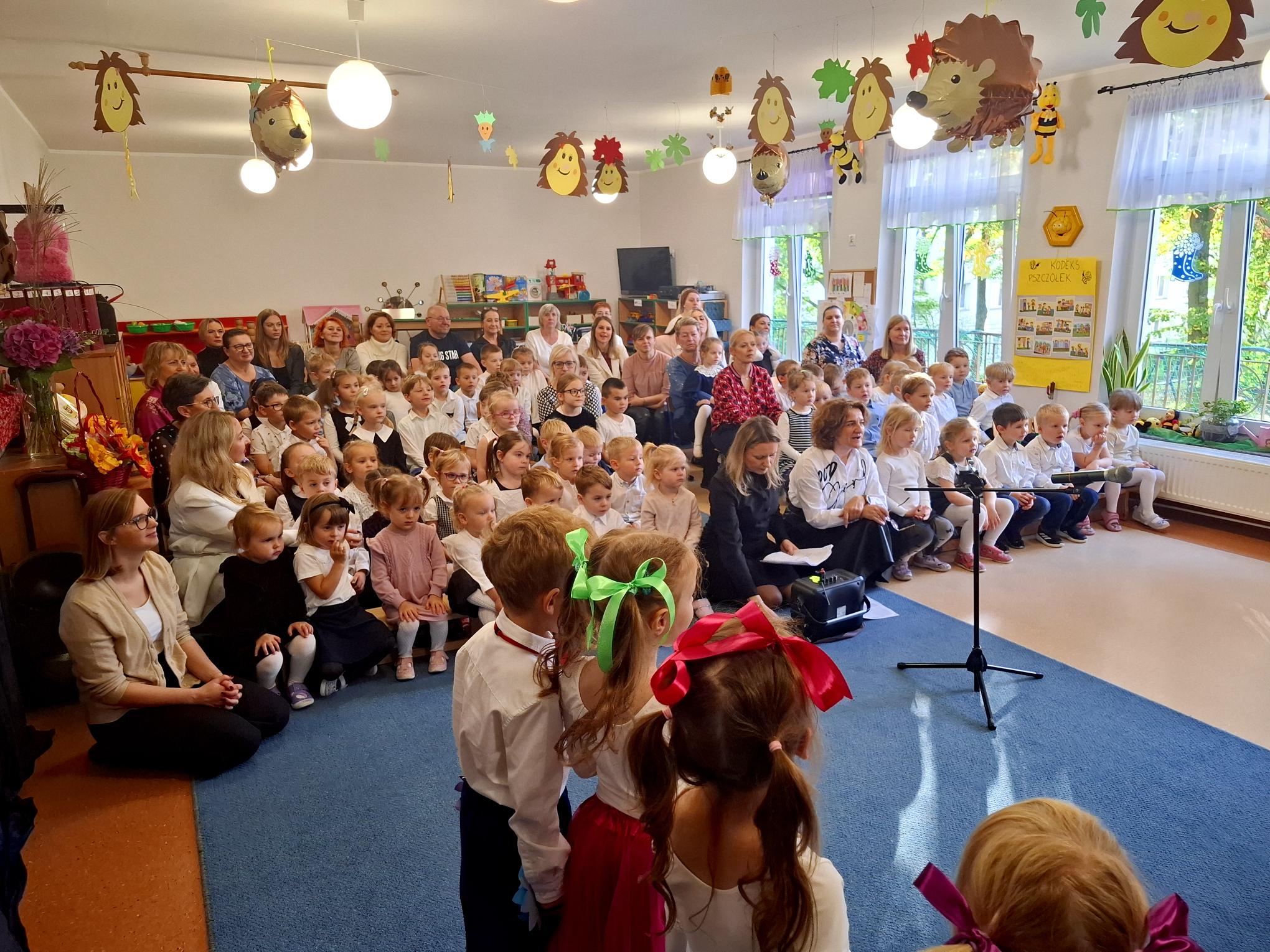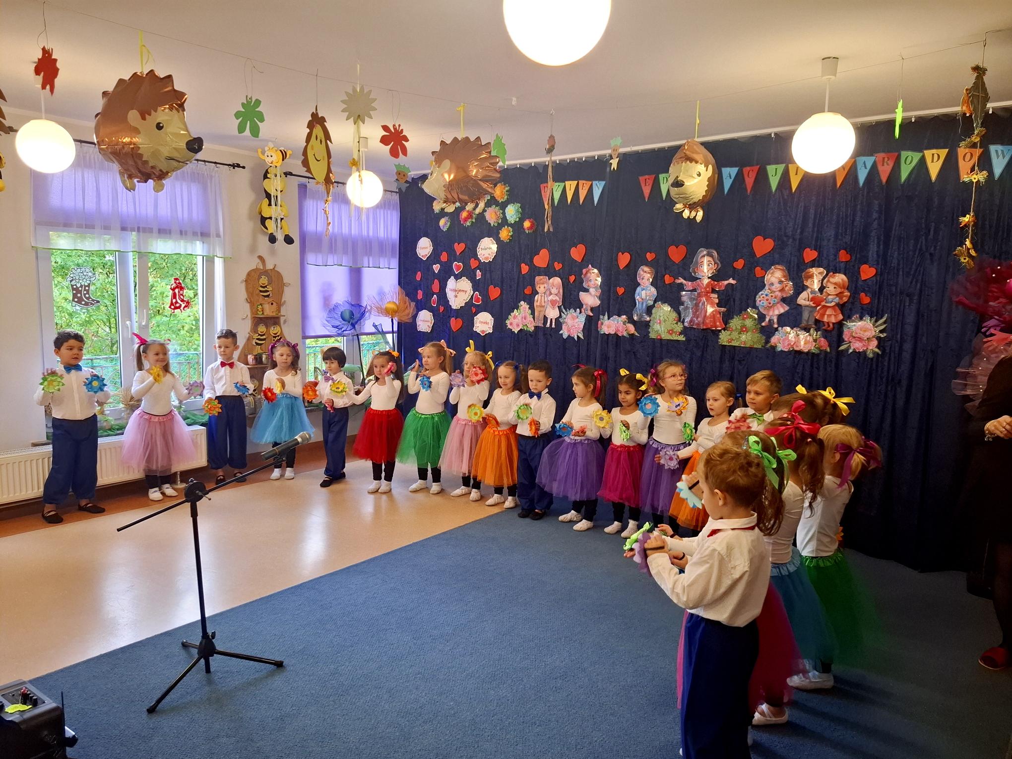 Dzisiaj uroczyście świętowaliśmy w naszym Przedszkolu Dzień Edukacji Narodowej. Wszystkie dzieci i pracownicy zostali zaproszeni do grupy "Pszczółek". Dzieci zaprezentowały nam przepiękny program artystyczny, w którym nie zabrakło elementów humoru, tańca, śpiewu i liryki. Każdy z pracowników został opisany i przedstawiony w wierszu lub piosence, co wywołało wiele uśmiechów i radości. W świętowaniu towarzyszyli nam przedstawiciele rady rodziców oraz goście, którzy związani są lub byli z naszym Przedszkolem. Panie z rady rodziców w imieniu wszystkich rodziców ze wzruszeniem złożyły pracownikom serdeczne życzenia. Dodatkowym elementem świątewania tego dnia była wystawa prac plastycznych "Kadra naszego Przedszkola w oczach dzieci". Mieliśmy okazję podziwiać talent dzieci i rodziców, ale przede wszytkim zobaczyć, co szczególnego widzą w nas dzieci. Bardzo dziękujemy Rodzicom i dzieciom za dostarczenie tak pięknych przeżyć w tym wyjątkowym dla nas dniu.