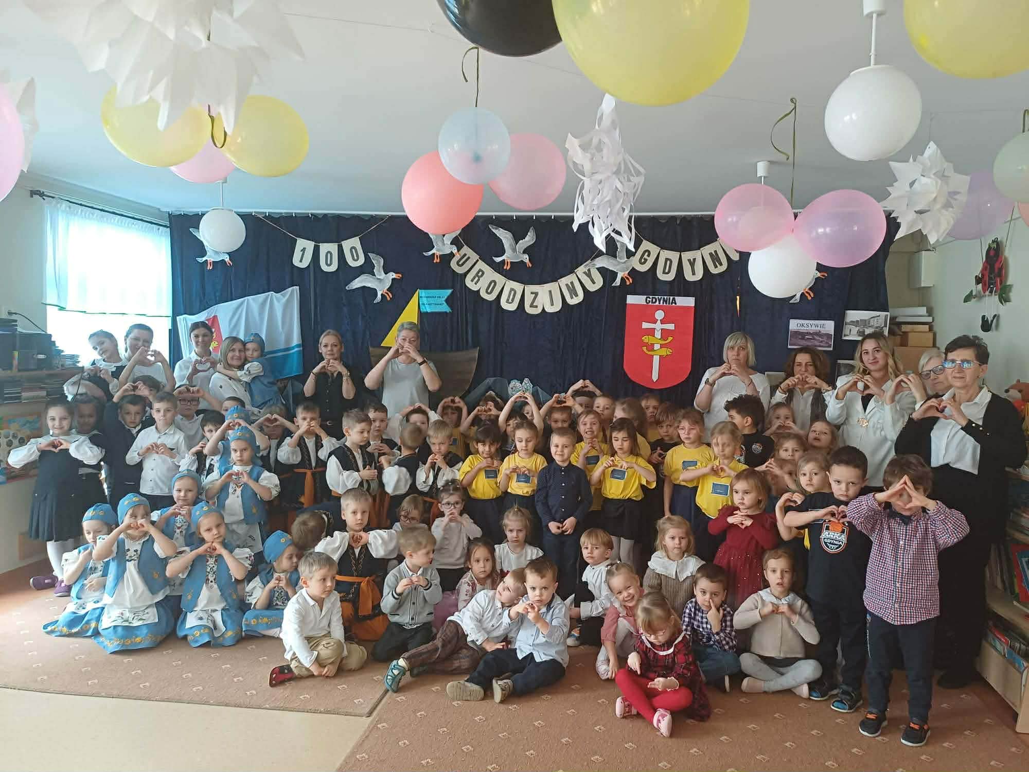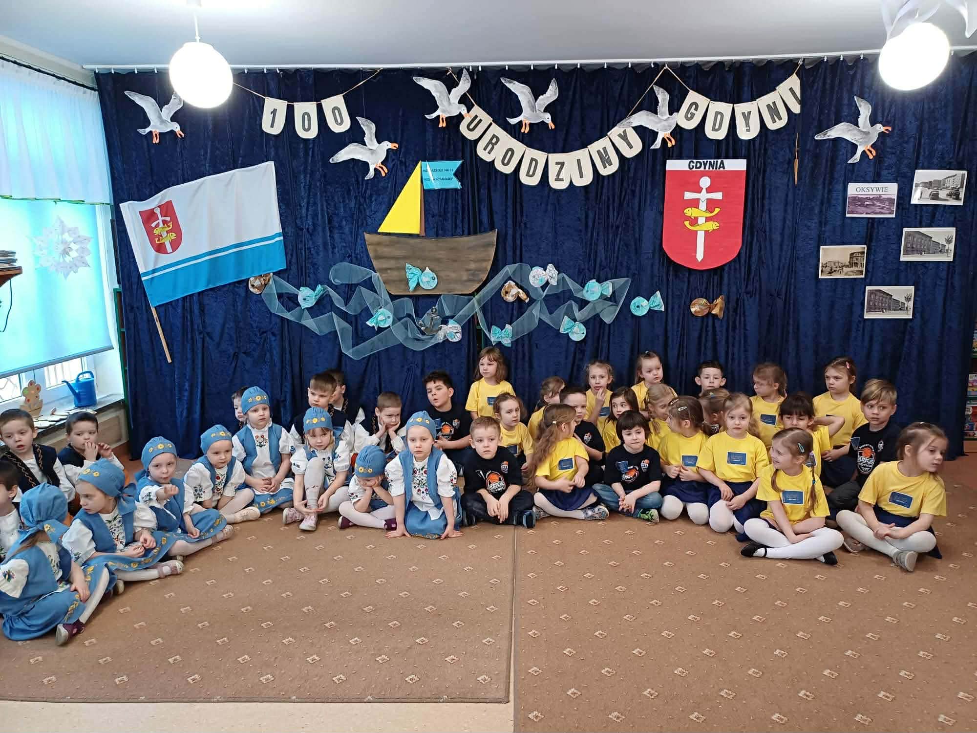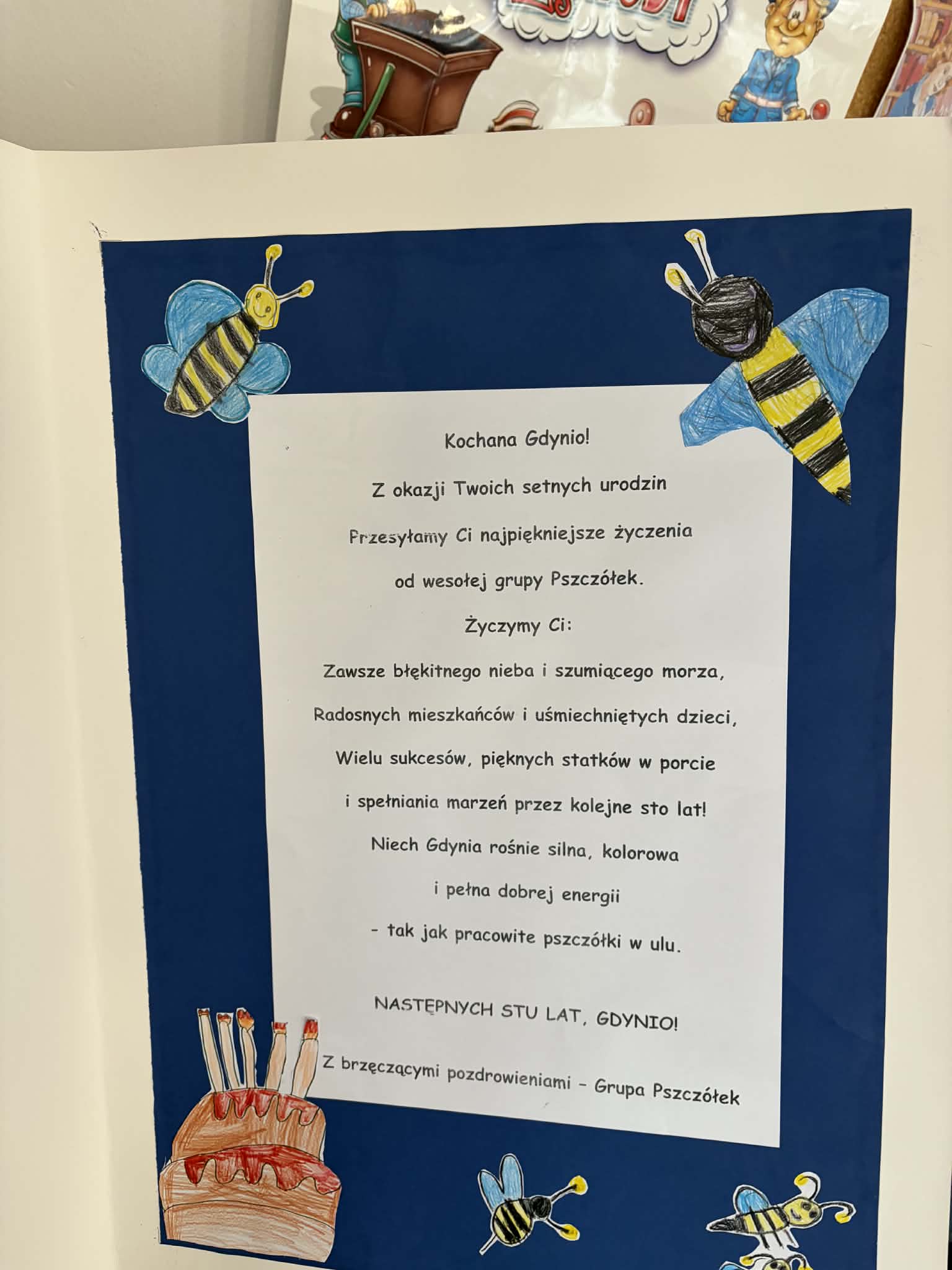 Z OKAZJI 100 ROCZNICY NASZEGO MIASTA – GDYNI – SPOTKALIŚMY SIĘ W GRUPIE BIEDRONEK, ABY WSPÓLNIE ŚWIĘTOWAĆ. PODCZAS SPOTKANIA SPRAWDZALIŚMY SWOJĄ WIEDZĘ O GDYNI, ODPOWIADAJĄC PYTANIA PRZEDSTAWIONE NA SLAJDACH. PSZCZÓŁKI WYKONAŁY RÓWNIEŻ KARTKĘ Z ŻYCZENIAMI DLA NASZEGO MIASTA.