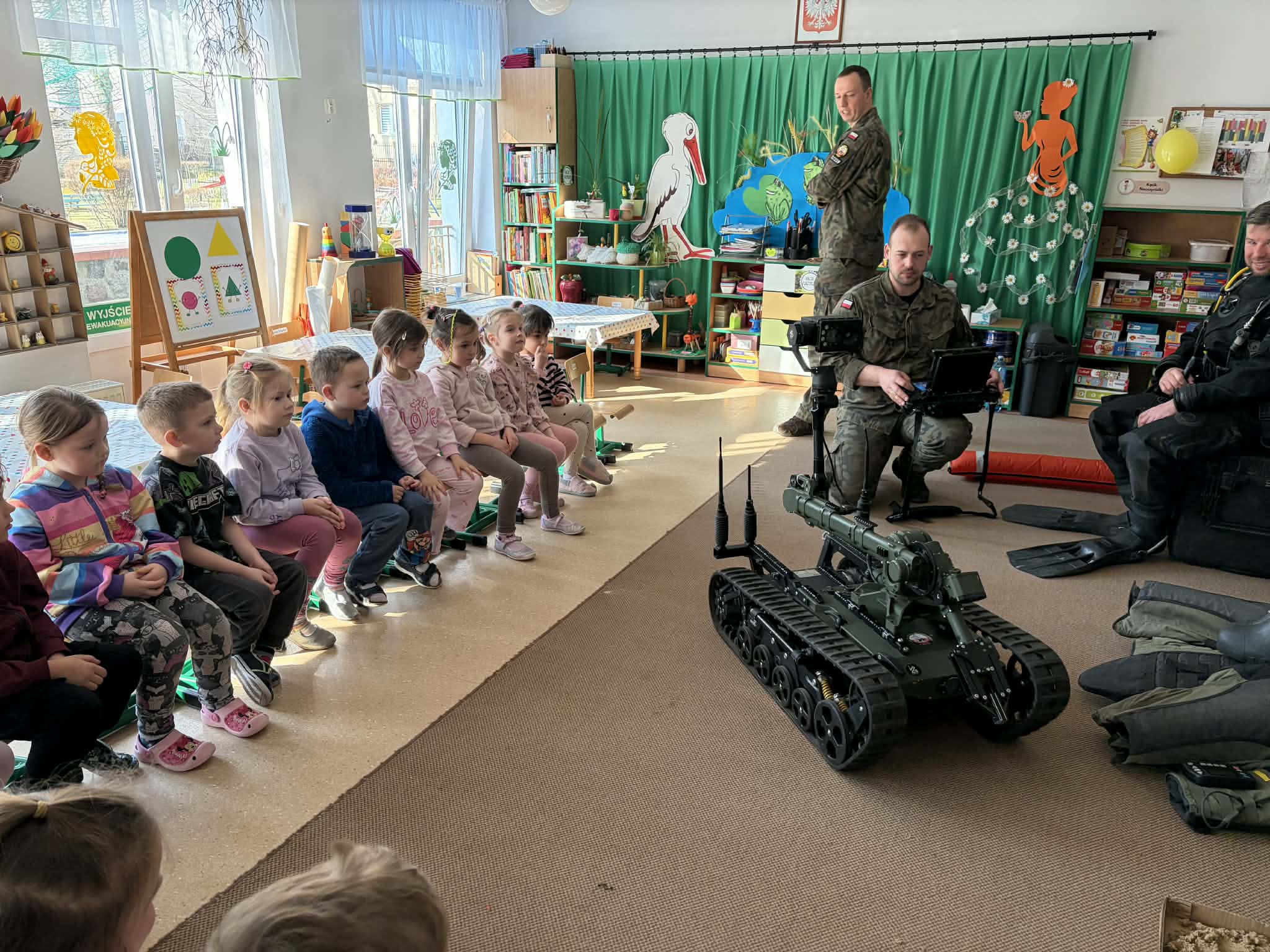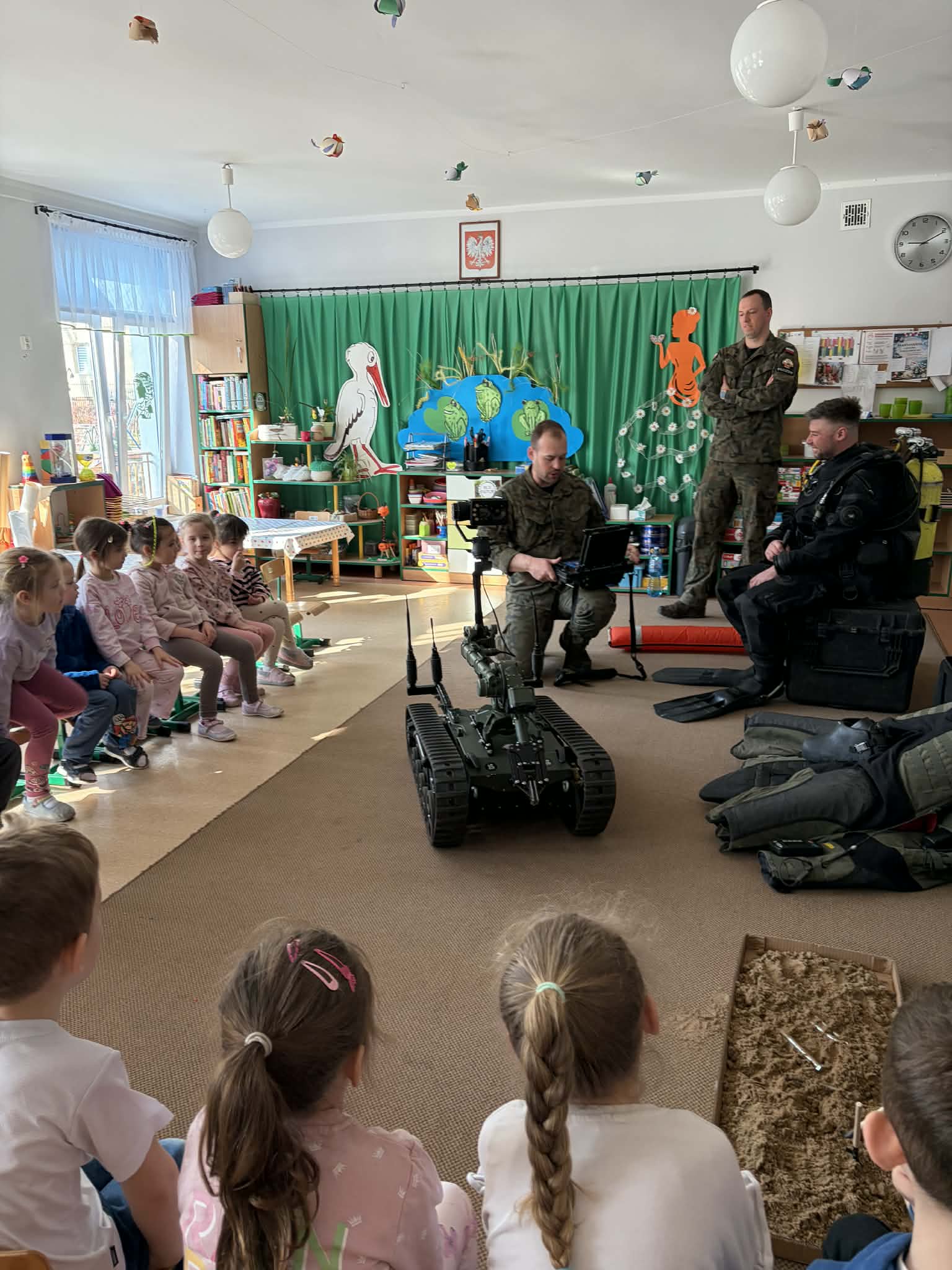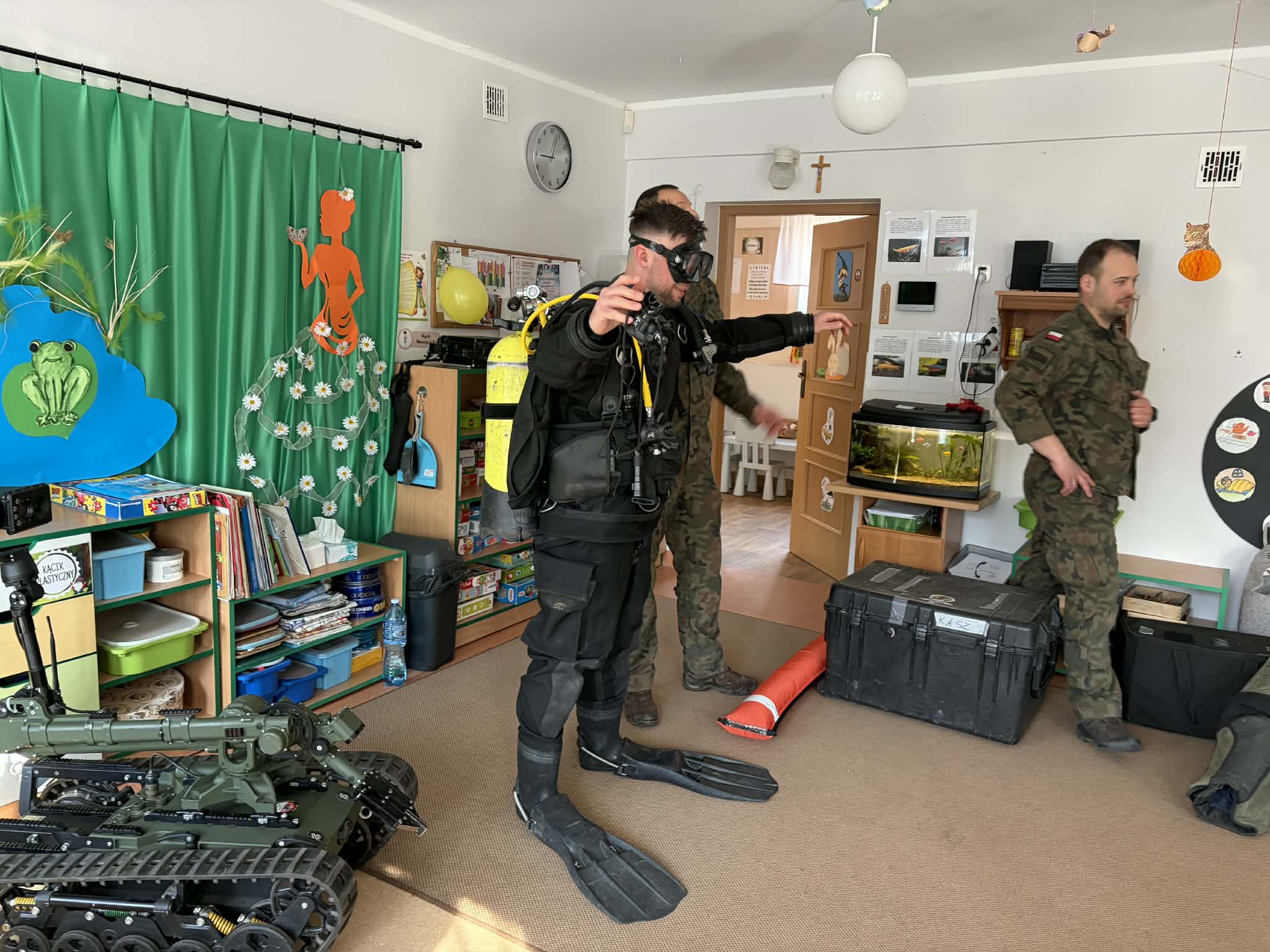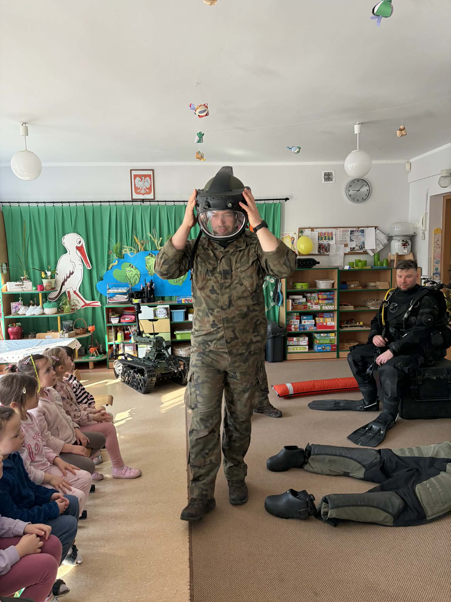 NASZE PSZCZÓŁKI MIAŁY OKAZJĘ POZNAĆ ZAWÓD NURKÓW MINERÓW. GOŚCIE OPOWIEDZIELI O SWOJEJ PRACY, ZAPREZENTOWALI SPECJALISTYCZNY SPRZĘT ORAZ PRZYBLIŻYLI TEMAT NIEWYBUCHÓW. DZIECI MOGŁY TAKŻE ZOBACZYĆ, GRANAT ĆWICZEBNY ORAZ ROBOTA, KTÓRY POMAGA IM W CODZIENNYCH DZIAŁANIACH. NA PAMIĄTKĘ SPOTKANIA KAŻDE DZIECKO OTRZYMAŁO NAKLEJKI I KOLOROWANKI. DZIĘKUJEMY ZA CIEKAWĄ WIZYTĘ I PRZYBLIŻENIE TEGO TRUDNEGO, ALE BARDZO WAŻNEGO ZAWODU.