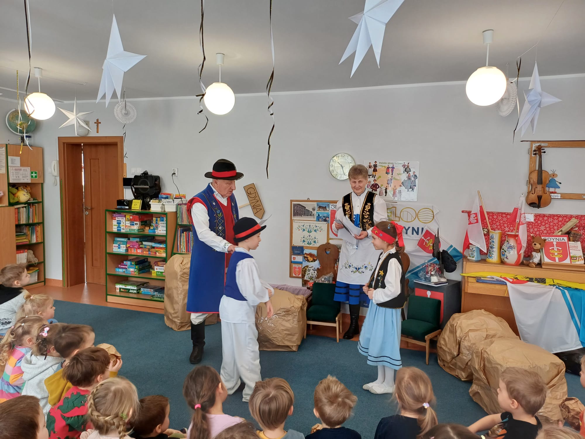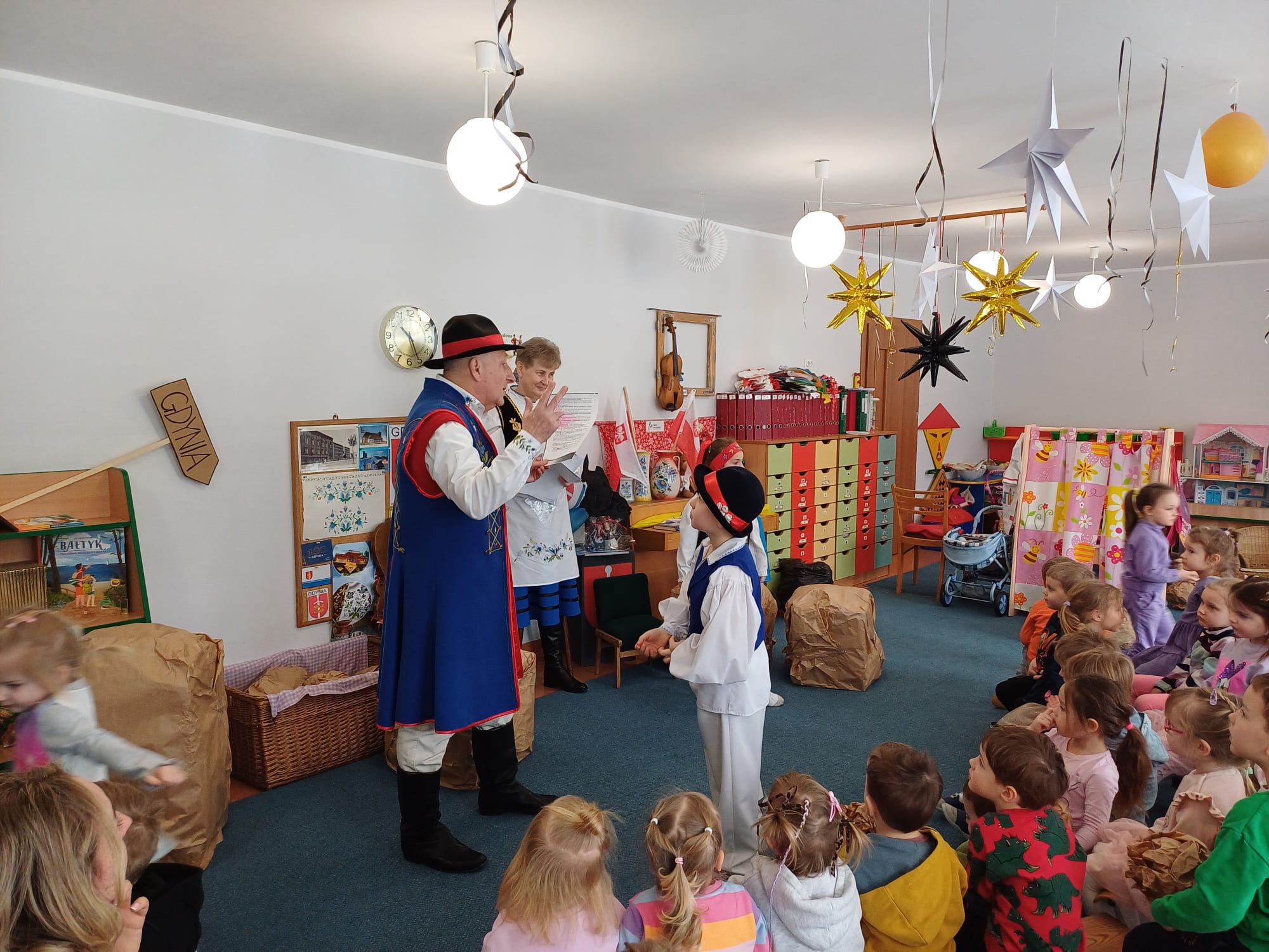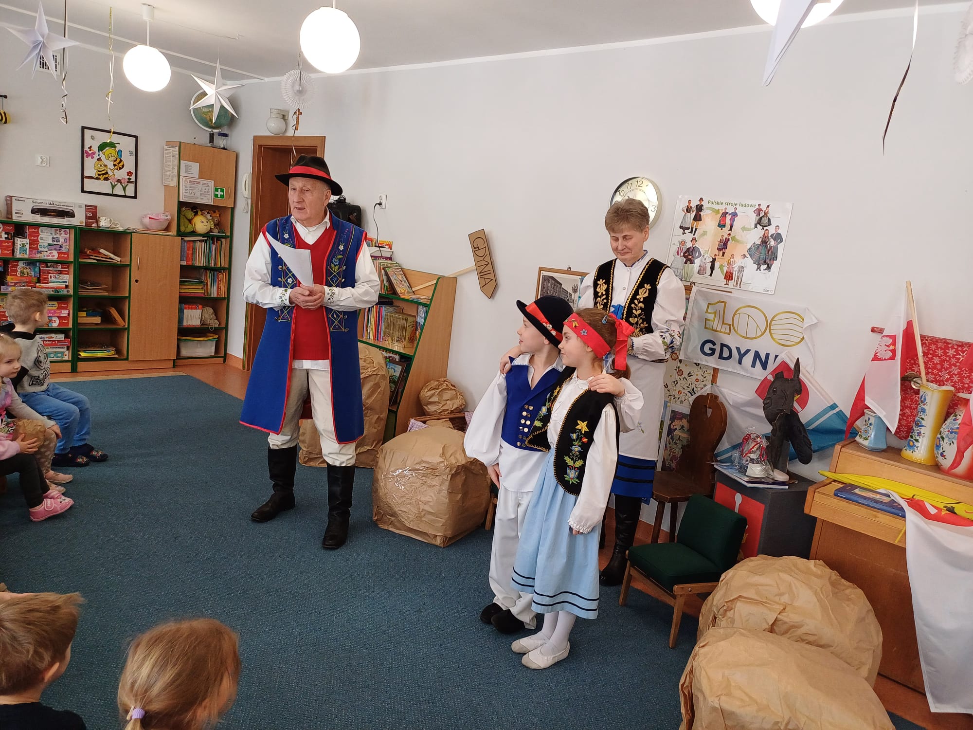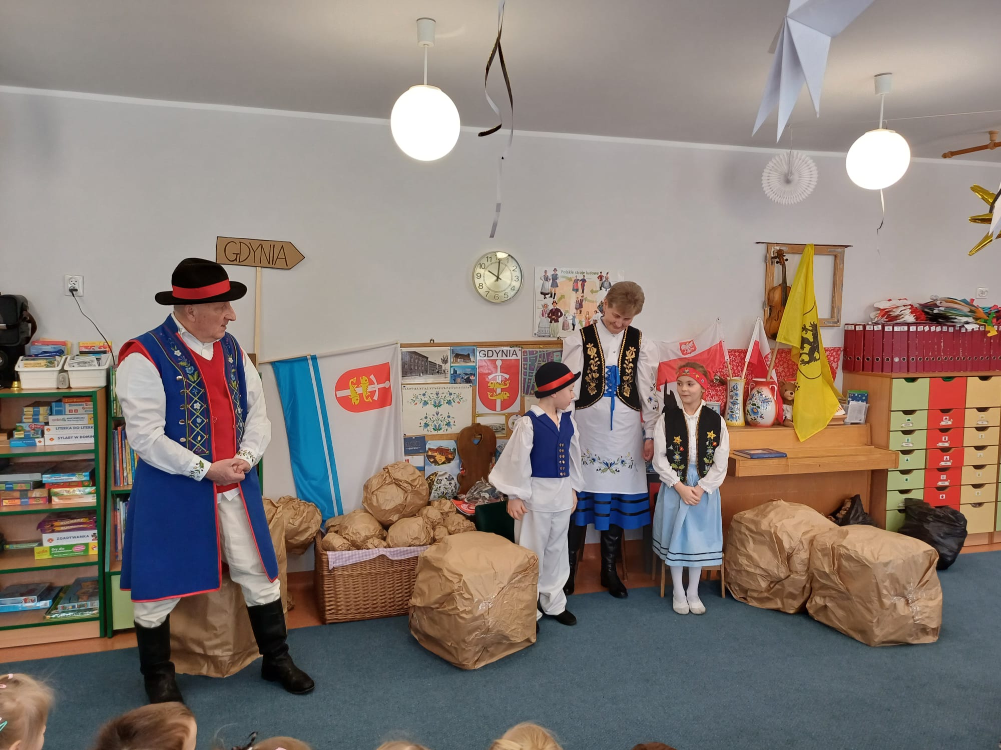 Zrzeszenie, do którego należą, to organizacja kulturalno-społeczna działająca na rzecz promocji kultury, języka i tradycji kaszubskiej w Gdyni. Nasi goście zaprezentowali dzieciom jedną z bajek gdyńskich, pt. Oksywie. Dzieci miały okazję posłuchać historii stolemów: Adama i Ewy, pobawić się ulubionymi zabawkami stolemów czyli głazami, które wrzucały do morza, rozpoznawały flagi w tym flagę Kaszub, miały okazję podziwiać piękne stroje kaszubskie dla dorosłych i dzieci. To był wyjątkowy, piękny i bogaty w wiedzę czas spotkania z kulturą Kaszub.