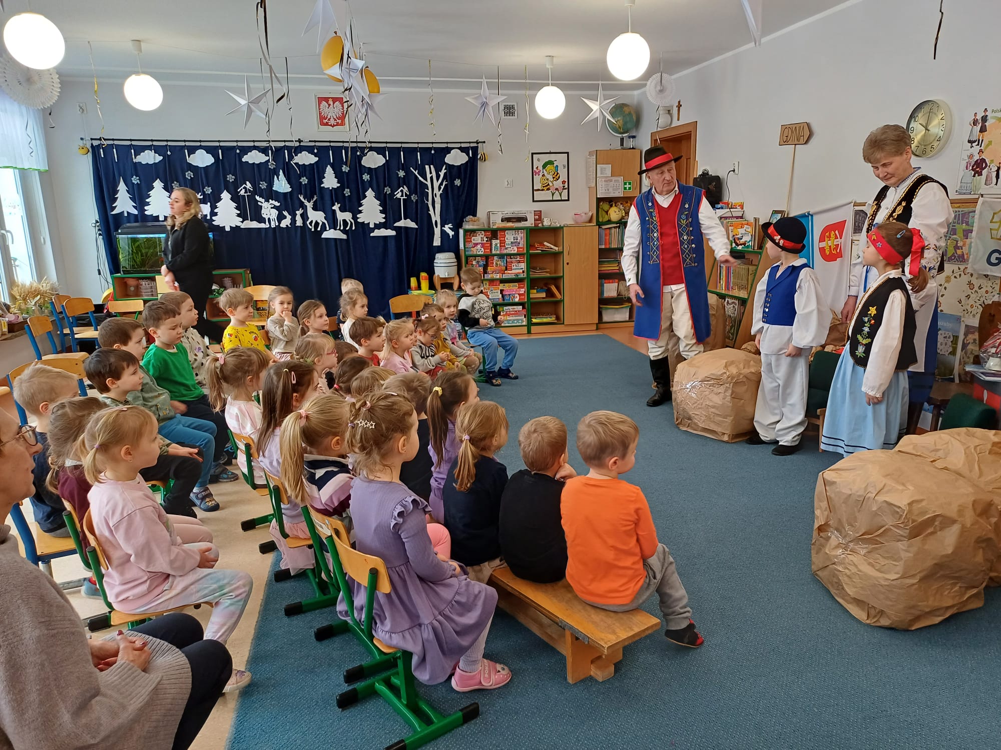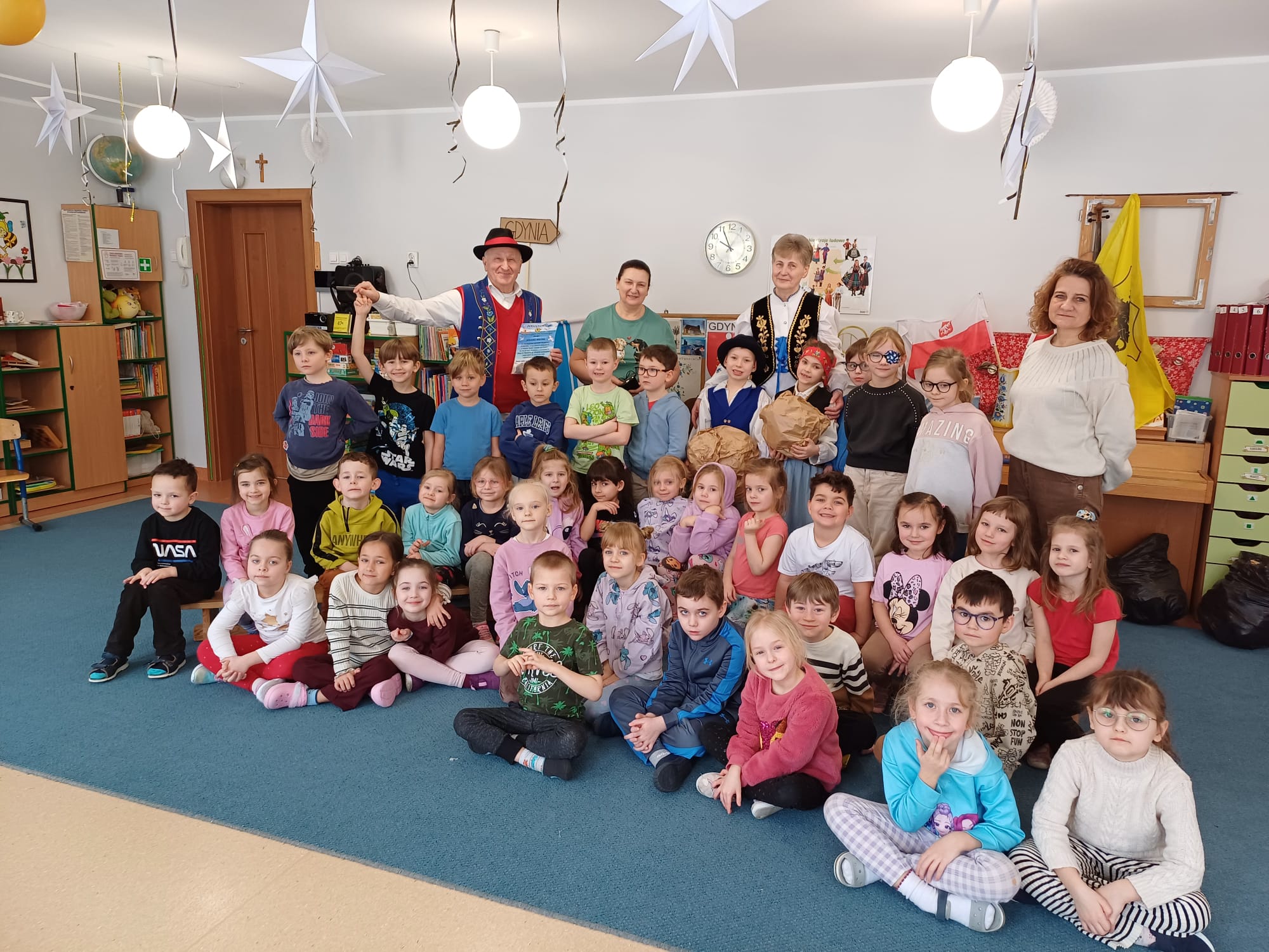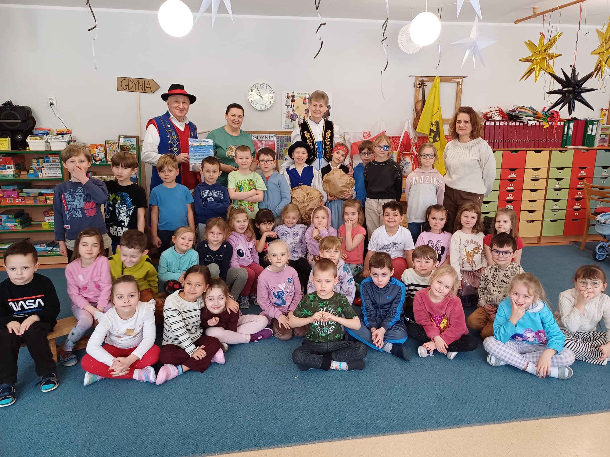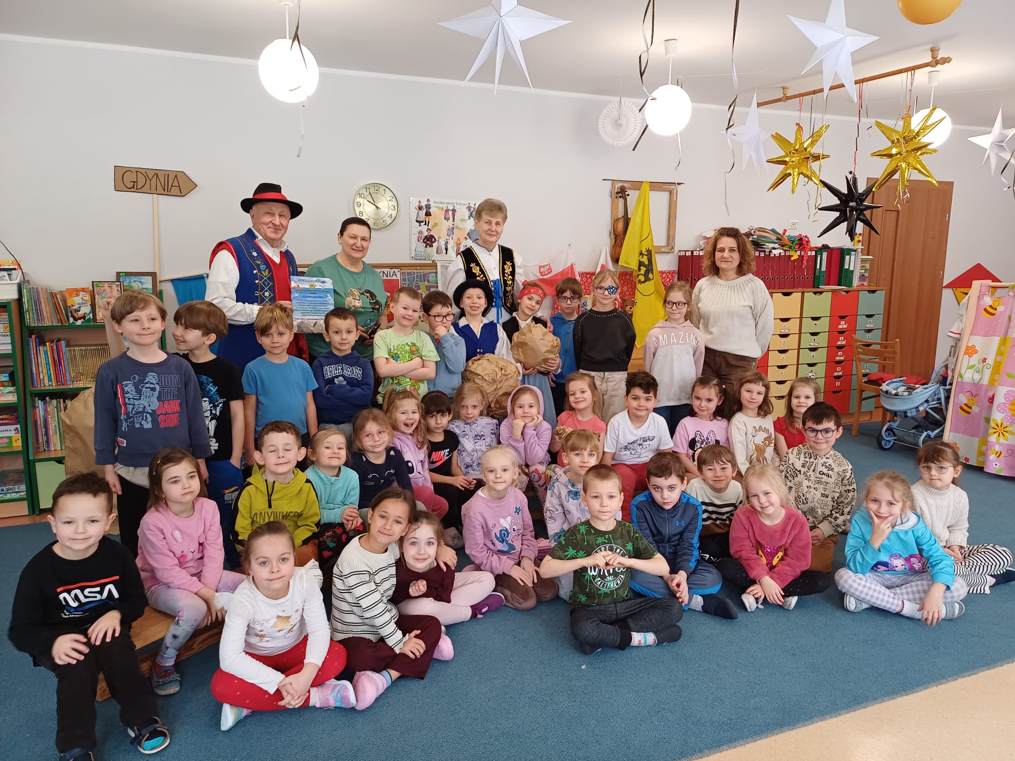 Zrzeszenie, do którego należą, to organizacja kulturalno-społeczna działająca na rzecz promocji kultury, języka i tradycji kaszubskiej w Gdyni. Nasi goście zaprezentowali dzieciom jedną z bajek gdyńskich, pt. Oksywie. Dzieci miały okazję posłuchać historii stolemów: Adama i Ewy, pobawić się ulubionymi zabawkami stolemów czyli głazami, które wrzucały do morza, rozpoznawały flagi w tym flagę Kaszub, miały okazję podziwiać piękne stroje kaszubskie dla dorosłych i dzieci. To był wyjątkowy, piękny i bogaty w wiedzę czas spotkania z kulturą Kaszub.