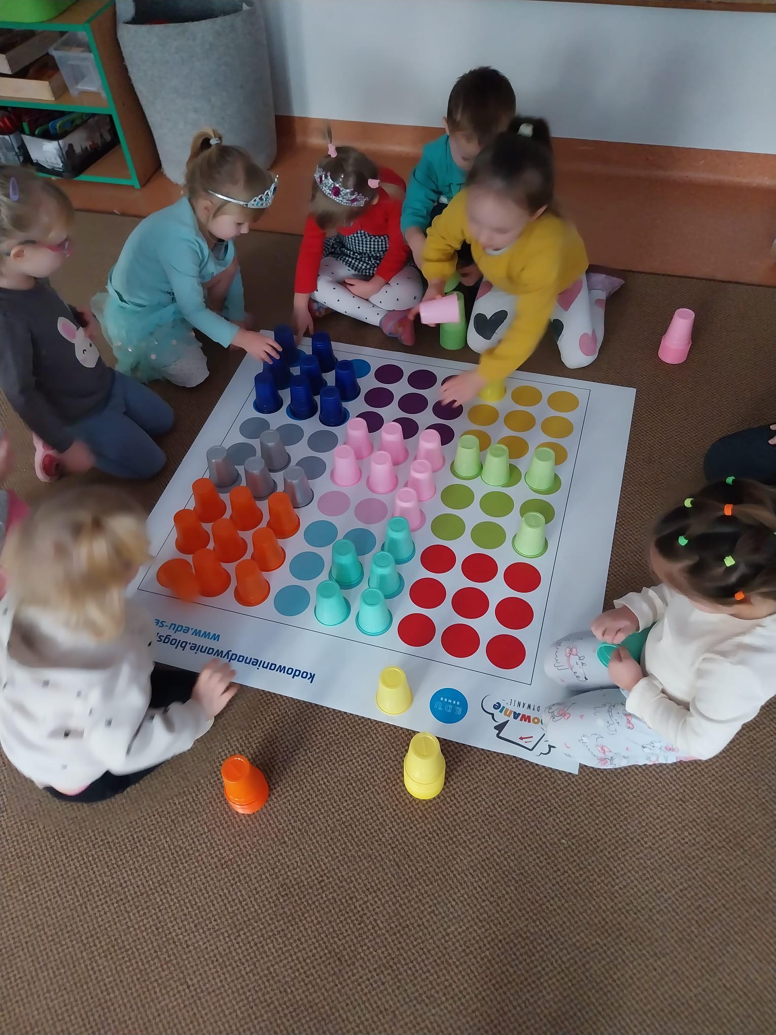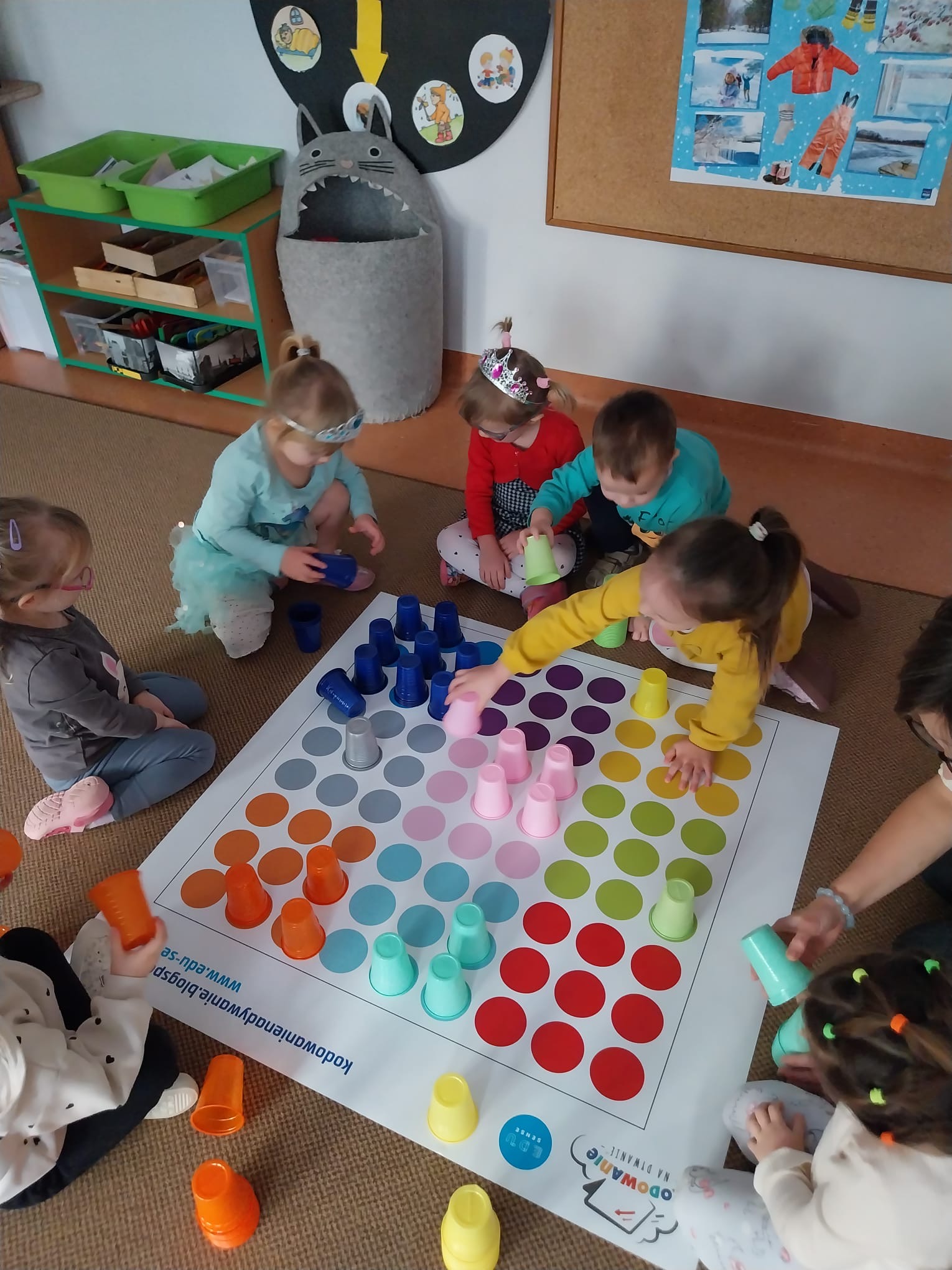 Kodowanie na dywanie z kubkami dla 3-latków to zabawy matematyczne rozwijÄ…ce logiczne myÅ›lenie, orientacjÄ™ przestrzennÄ… oraz umiejÄ™tność wspóÅ‚pracy poprzez zabawÄ™.