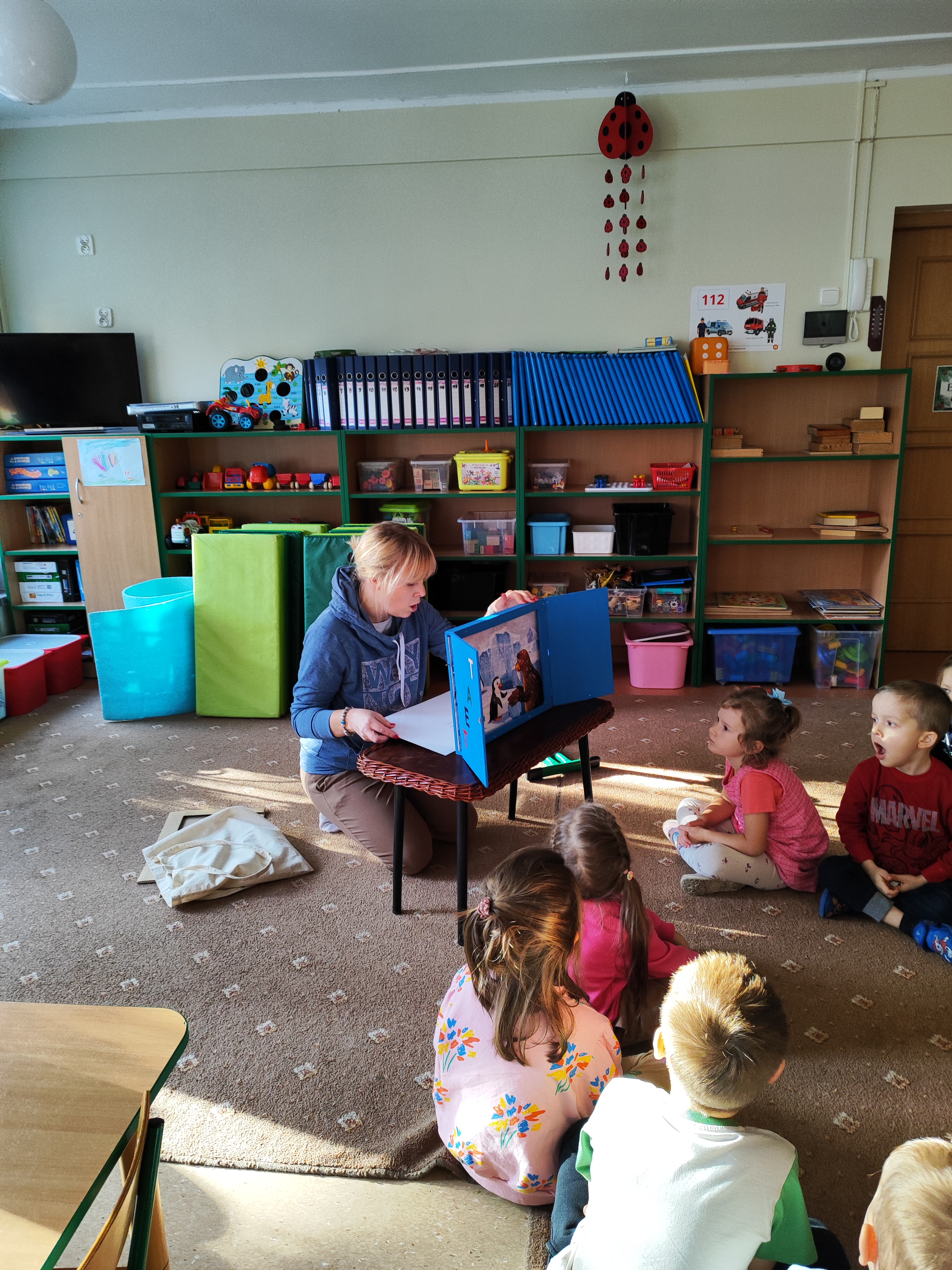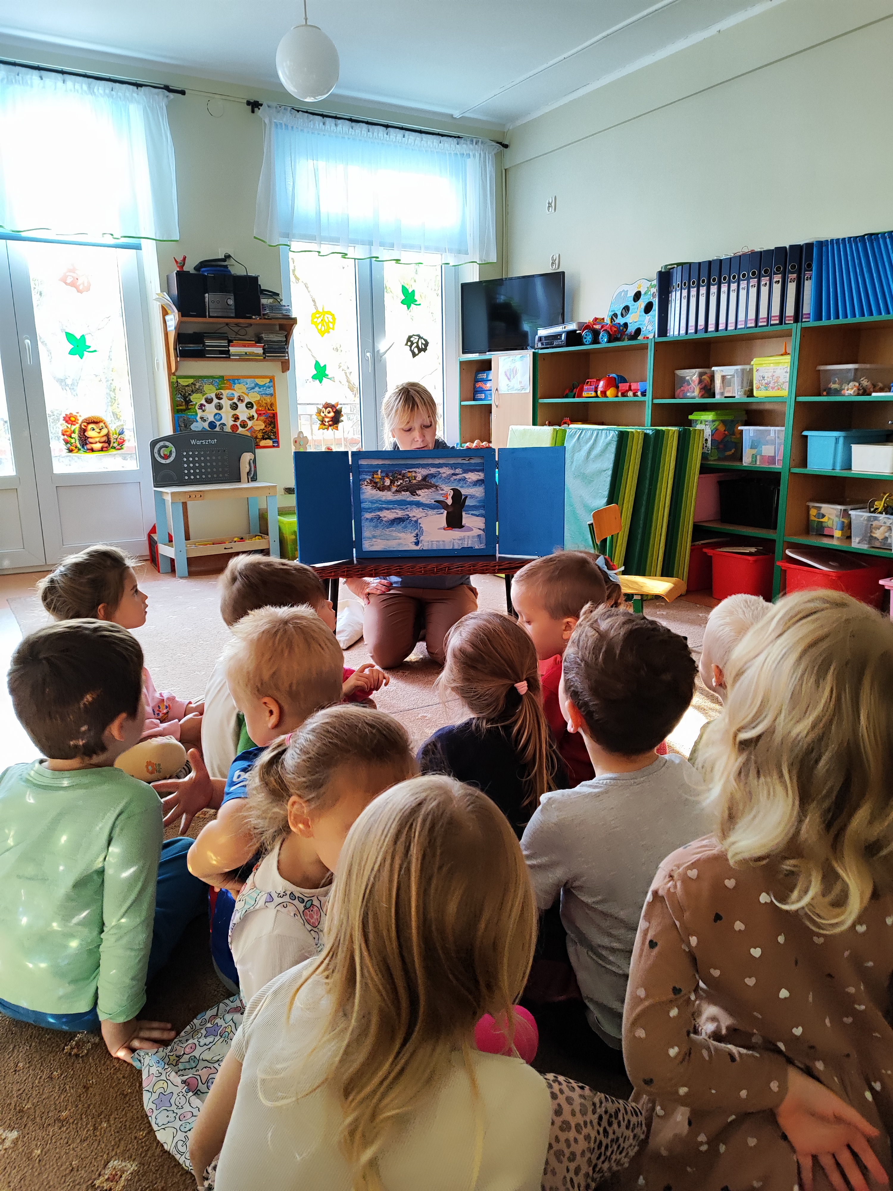 Po raz kolejny odwiedziła nas mama Stasia prezentując lubiany przez dzieci teatrzyk Kamishibai. Tym razem zaprezentowała dzieciom bajkę o przygodach pingwina Pingo. Przy okazji wysłuchanej treści bajki z pięknymi ilustracjami dzieci dyskutowały na temat segregacji śmieci oraz czystości naszej planety.
