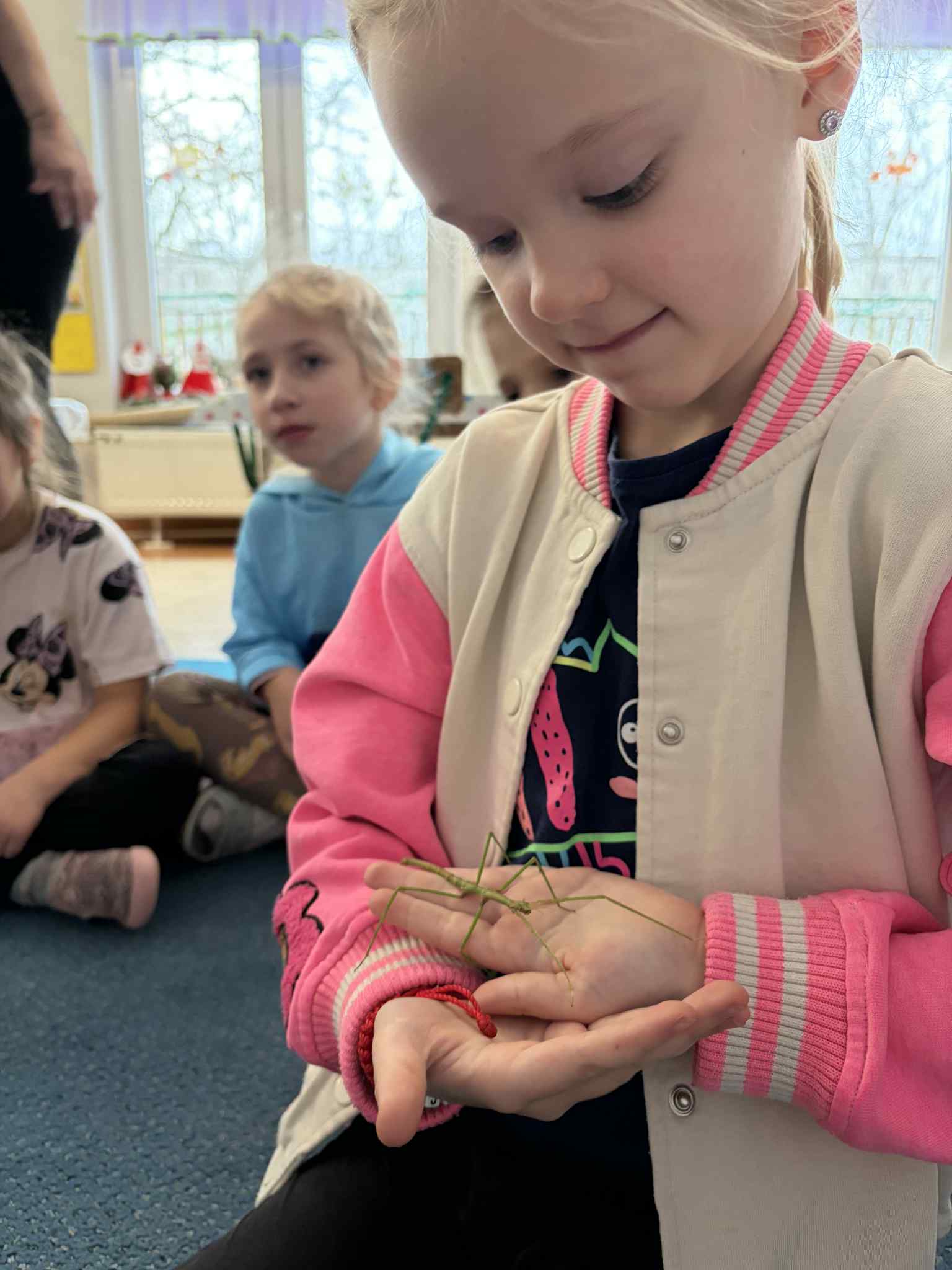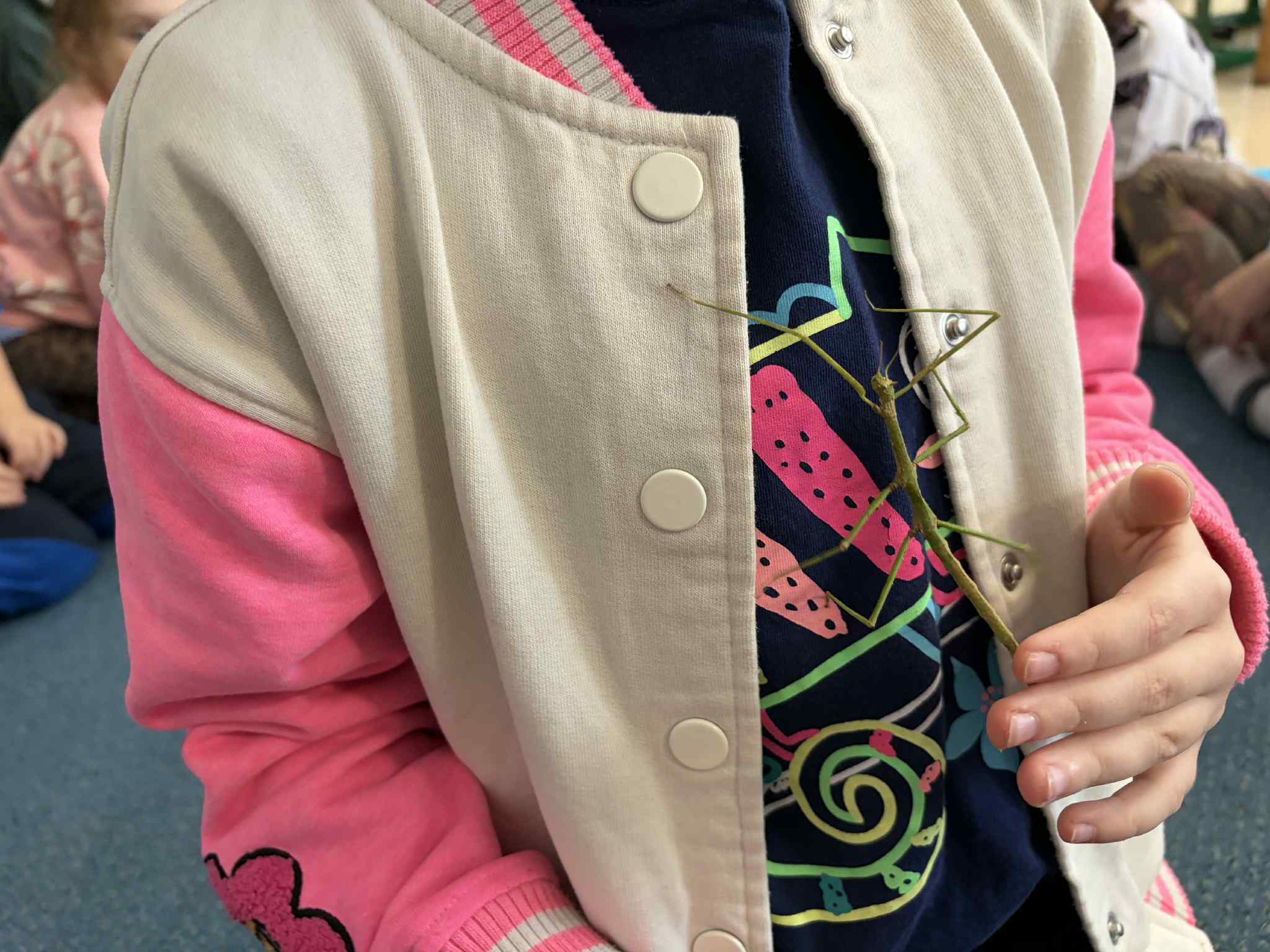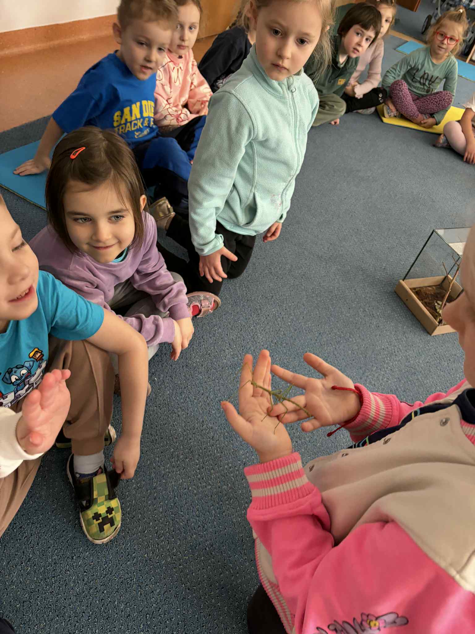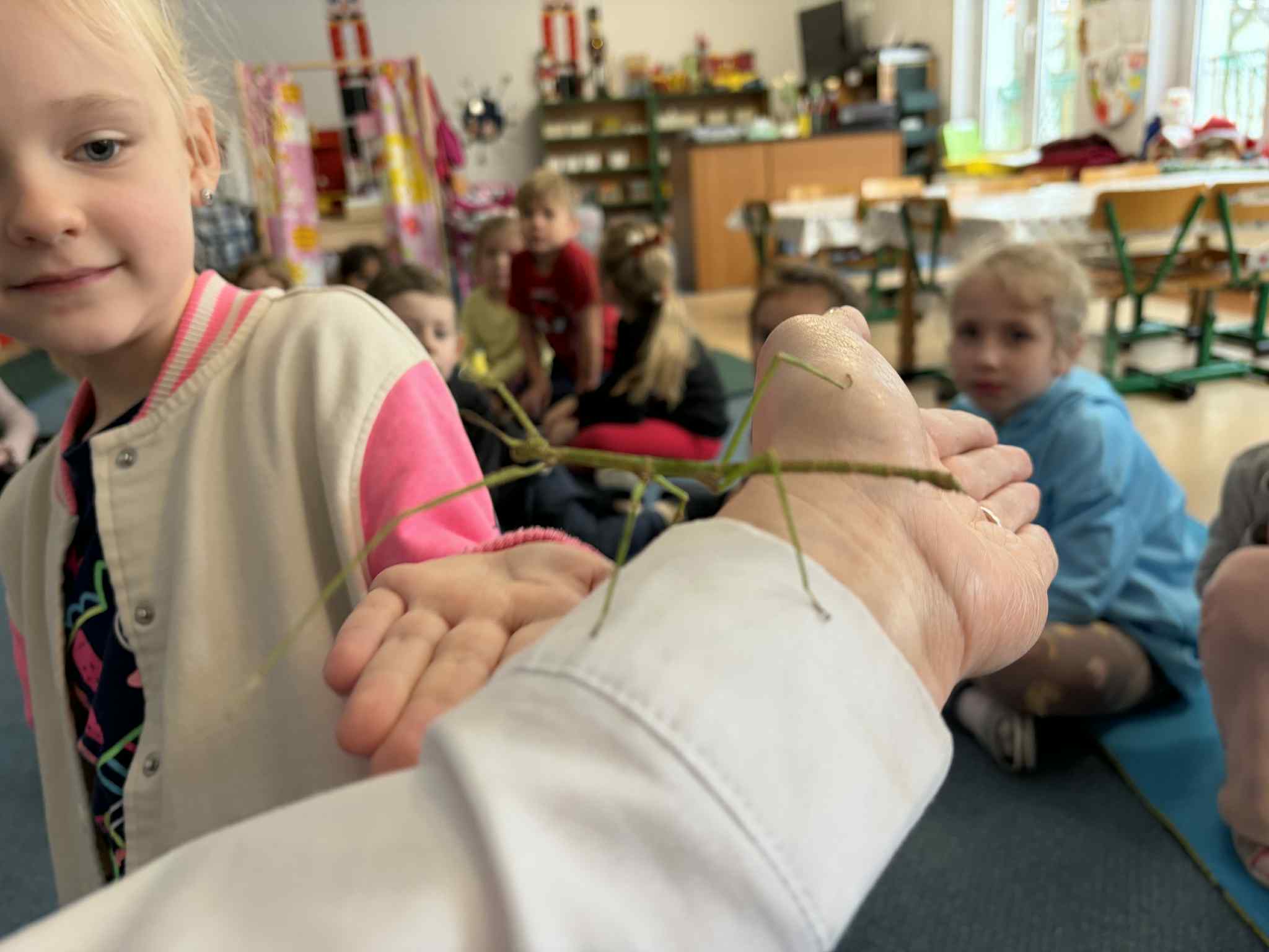 OSTATNIO ODWIEDZIŁ NAS WYJĄTKOWY GOŚĆ – PATYCZAK. PRZYSZEDŁ DO NAS DZIĘKI NASZEJ NAJSTARSZEJ KOLEŻANCE MAI Z GRUPY CZWARTEJ, KTÓRA PRZYNIOSŁA GO I OPOWIEDZIAŁA WIELE CIEKAWYCH INFORMACJI NA JEGO TEMAT. DOWIEDZIELIŚMY SIĘ, CZYM SIĘ ŻYWI, JAK WYGLĄDA JEGO CODZIENNE ŻYCIE ORAZ CZEGO POTRZEBUJE, ABY ZDROWO ROSNĄĆ I CZUĆ SIĘ BEZPIECZNIE. SPOTKANIE BYŁO ŚWIETNĄ OKAZJĄ DO NAUKI PRZEZ BEZPOŚREDNI KONTAKT Z PRZYRODĄ, ZADAWANIA PYTAŃ I ROZWIJANIA CIEKAWOŚCI ŚWIATA. DZIECI BYŁY BARDZO ZACIEKAWIONE I Z DUŻYM ZAINTERESOWANIEM OBSERWOWAŁY PATYCZAKA ORAZ SŁUCHAŁY OPOWIEŚCI MAI. TO BYŁA DLA NAS WSZYSTKICH BARDZO MIŁA I POUCZAJĄCA WIZYTA.