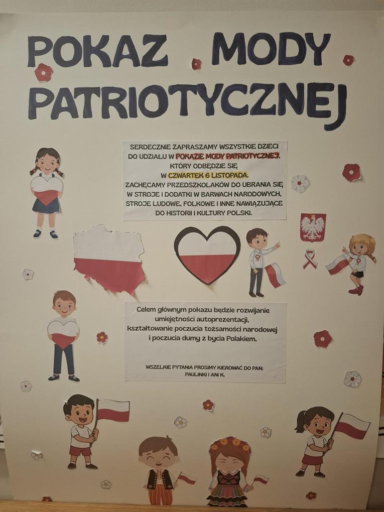W ramach obchodów Święta Niepodległości Panie: Paulinka i Ania zaprosiły wszystkich do uczestnictwa w pokazie mody patriotycznej. Profesjonalnie przygotowany "wybieg" z prawdziwym, czerwonym dywanem zachęcał wszystkich do przejścia przed koleżankami i kolegami. Dzieci prezentowaly się z wrodzonym wdziękiem, pomagajac sobie gestem, mimiką i słowem.