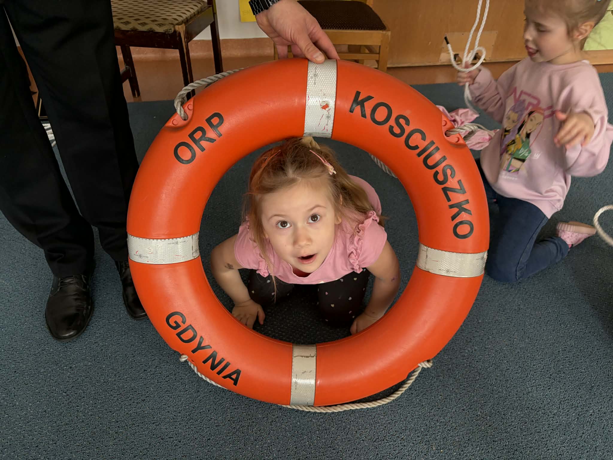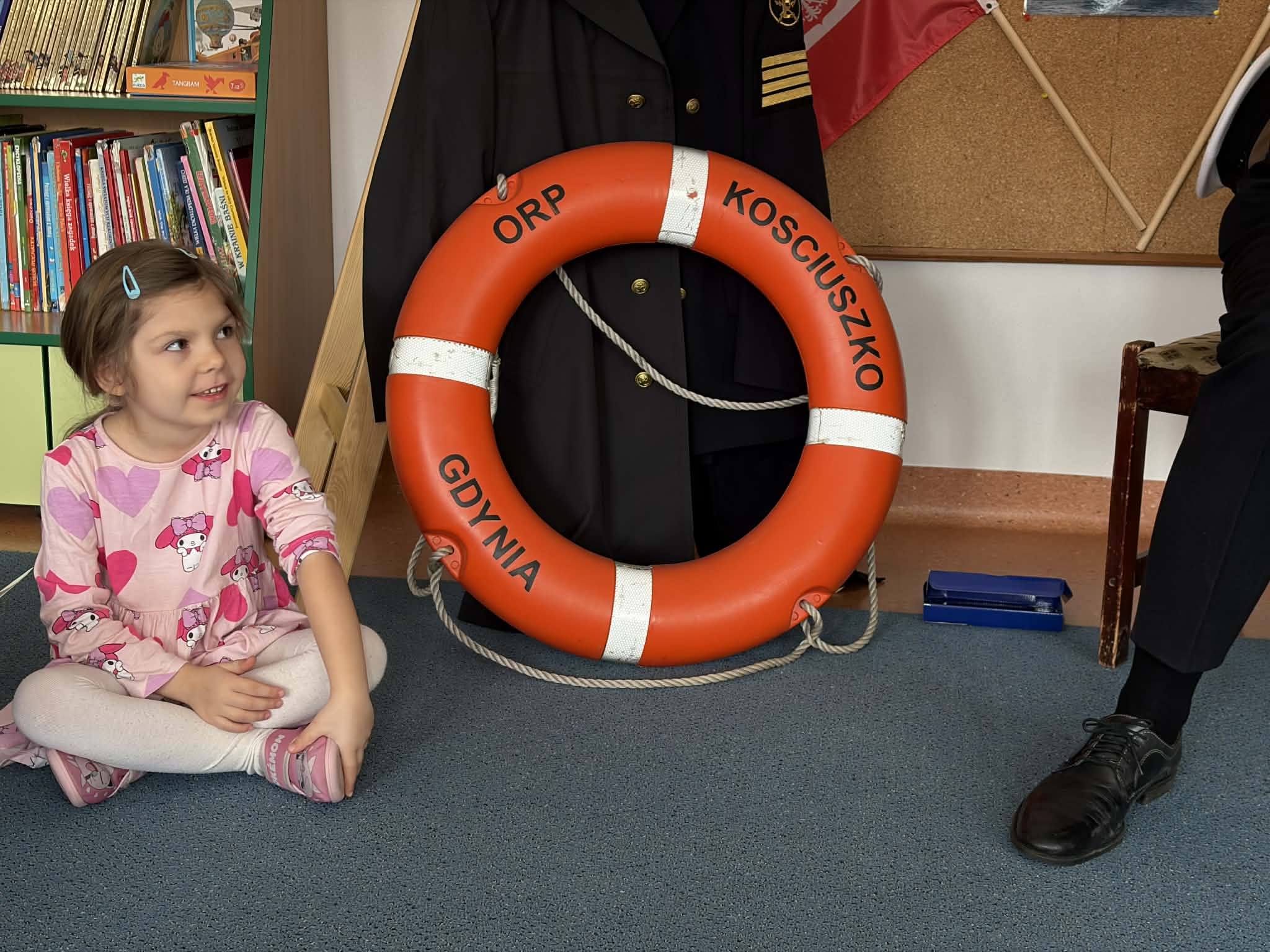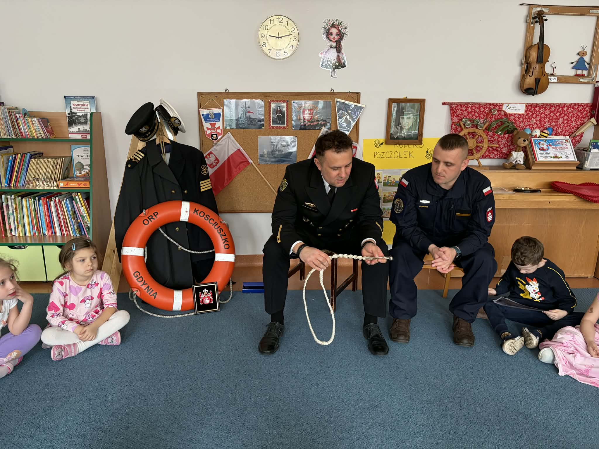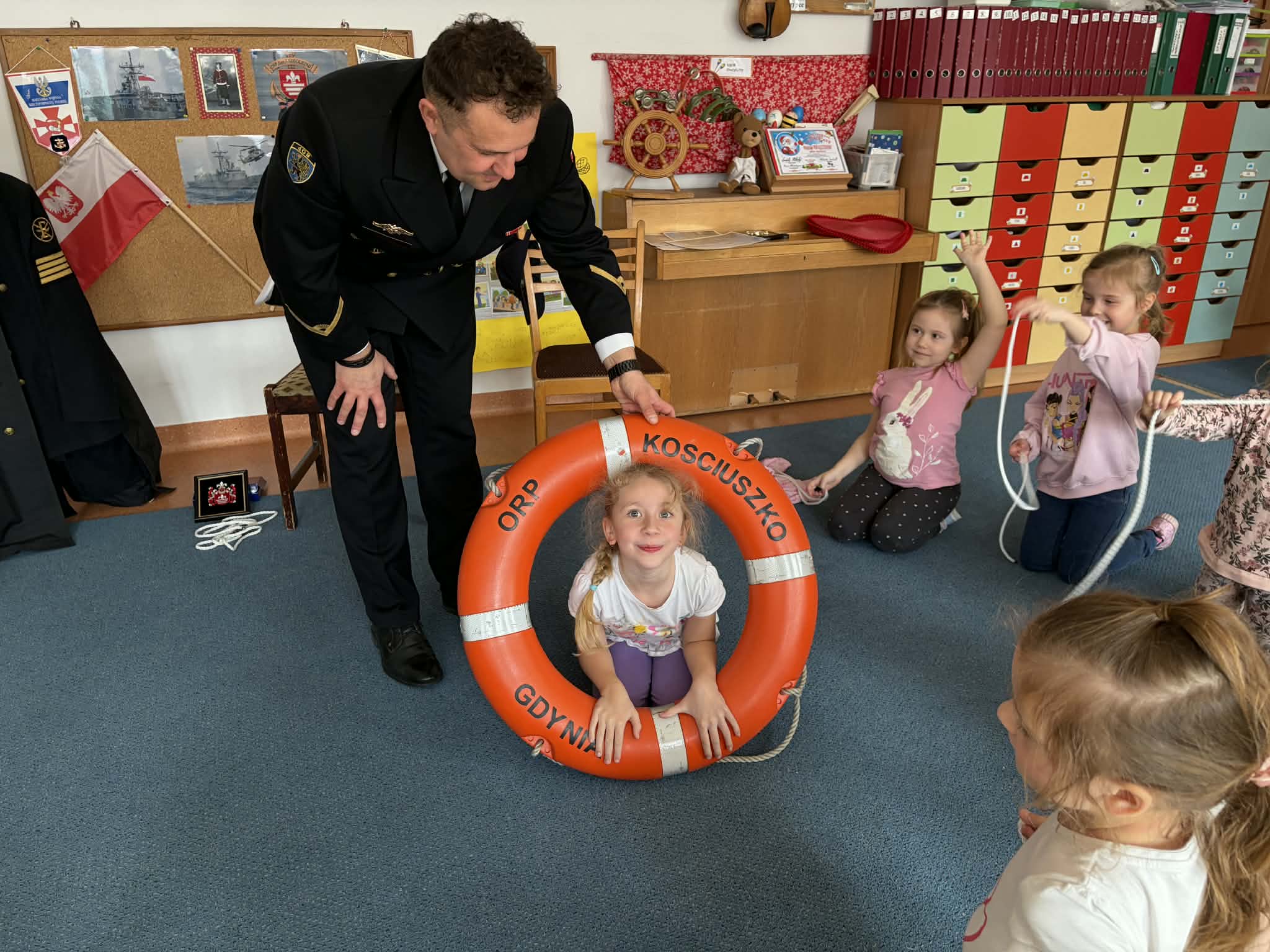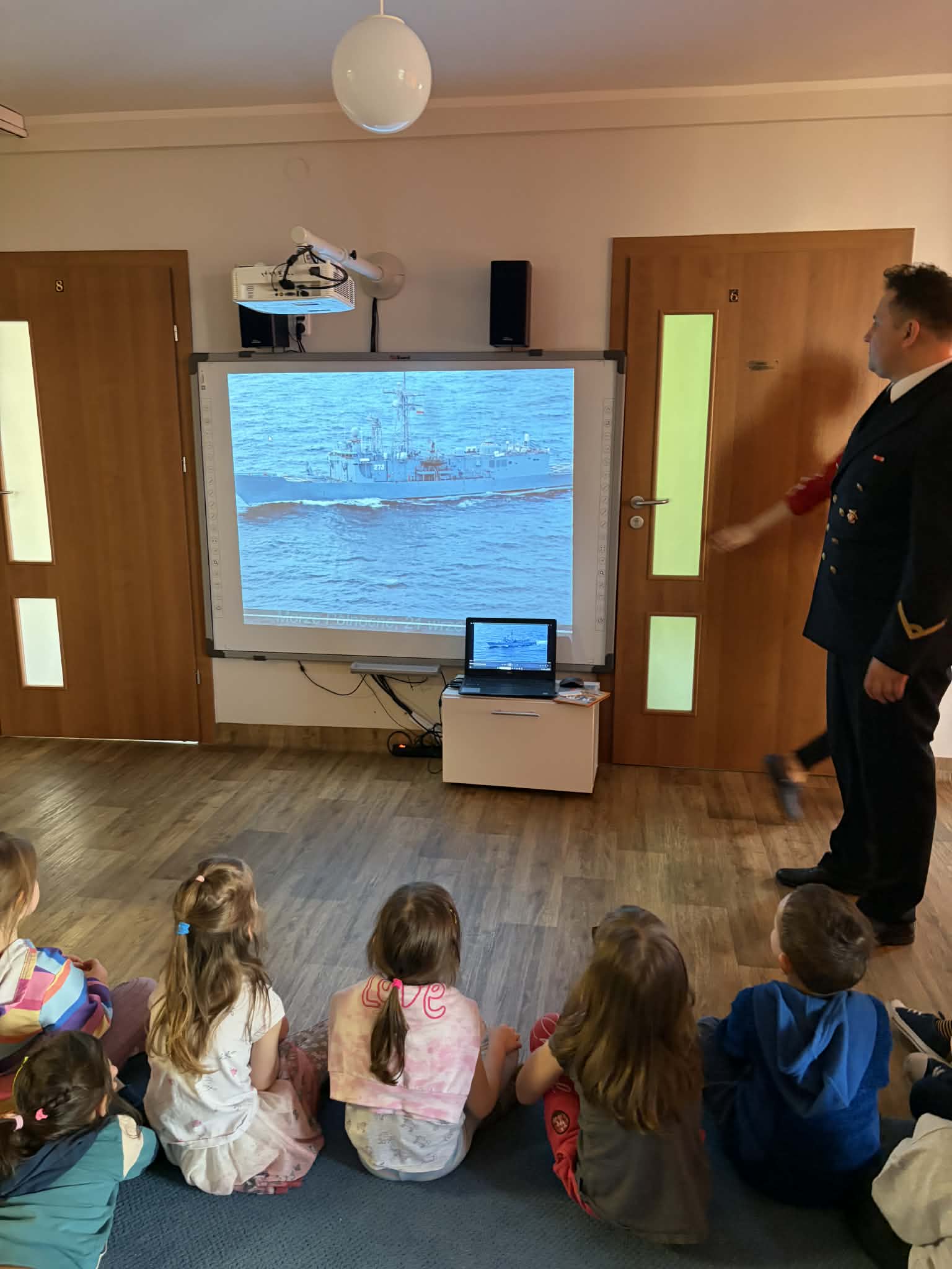 PSZCZÓŁKI MIAŁY OKAZJĘ POZNAĆ ZAŁOGĘ OKRĘTU ORP GEN. TADEUSZ KOŚCIUSZKO, KTÓRA OPOWIEDZIAŁA O SWOJEJ PRACY I SŁUŻBIE NA MORZU. DZIECI DOWIEDZIAŁY SIĘ: JAK WYGLĄDA CODZIENNE ŻYCIE NA OKRĘCIE, CO TO JEST " ŚWIST TRAPOWY", OBEJRZAŁY CIEKAWE FILMY I ZDJĘCIA ORAZ ZOBACZYŁY SPRZĘT RATOWNICZY. PODCZAS SPOTKANIA NAUCZYŁY SIĘ TAKŻE WIĄZAĆ PROSTY WĘZEŁ I WZIĘŁY UDZIAŁ W „CHRZCIE MORSKIM” Z ZABAWAMI, TAKIMI JAK: RZUCANIE DO CELU CZY PRZECIĄGANIE LINY. POZNAŁY RÓWNIEŻ PODSTAWOWE CZĘŚCI OKRĘTU: DZIÓB, RUFA I ŚRÓDOKRĘCIE. SERDECZNIE DZIĘKUJEMY ZAŁODZE ZA POŚWIĘCONY CZAS I INTERESUJĄCE SPOTKANIE.
