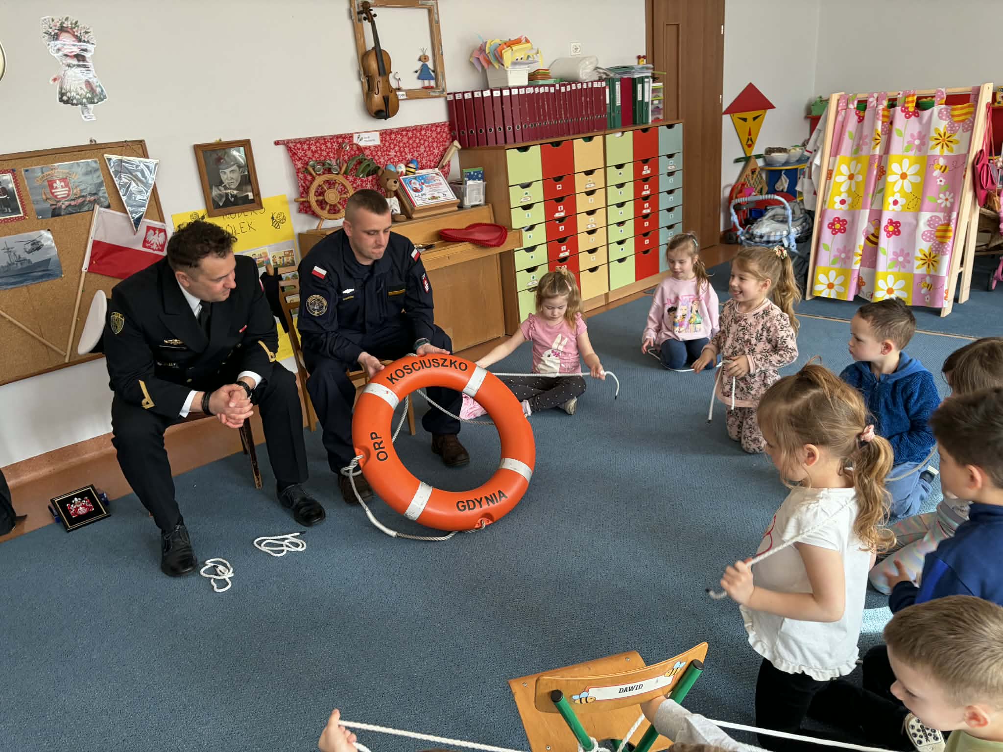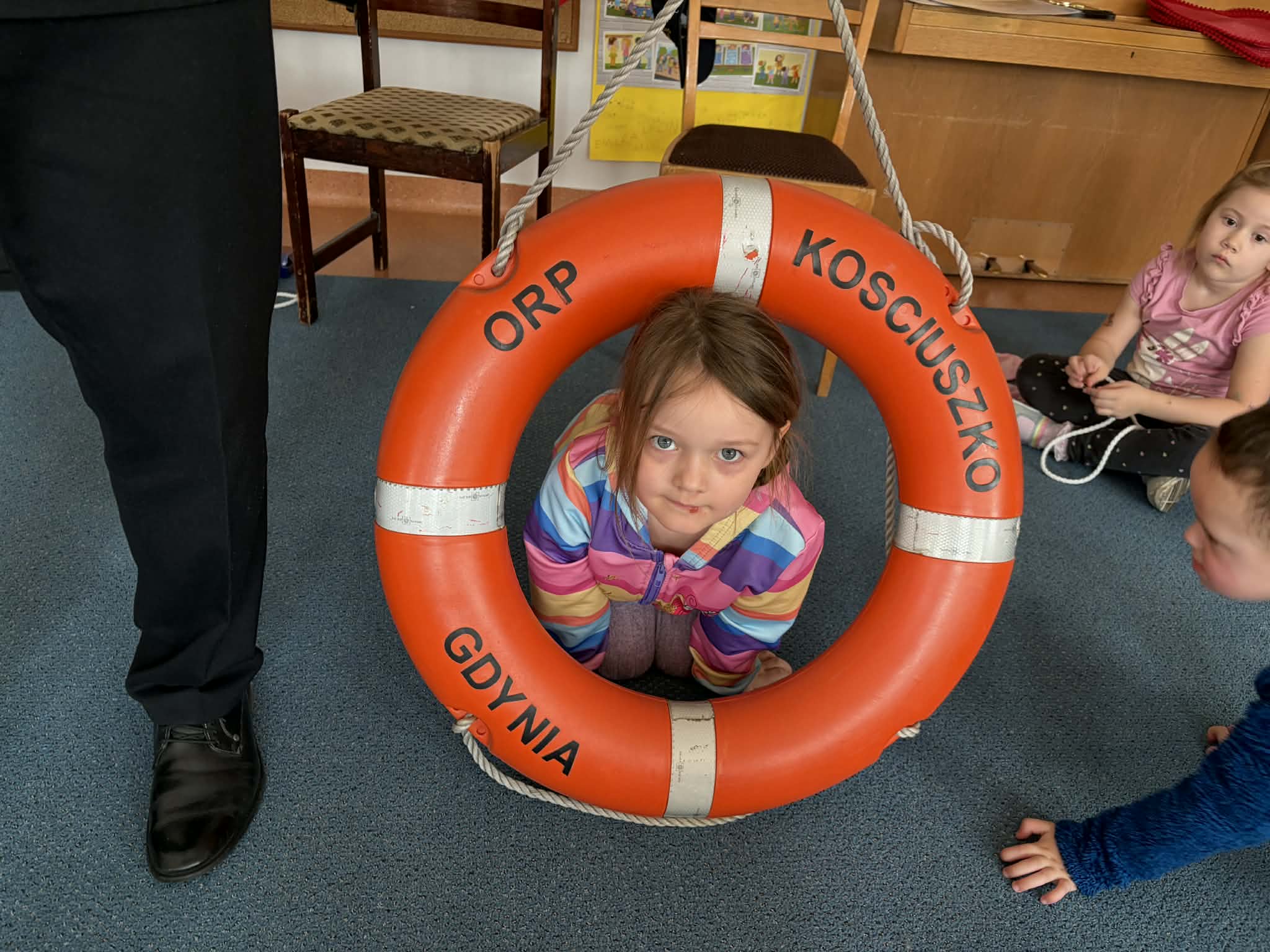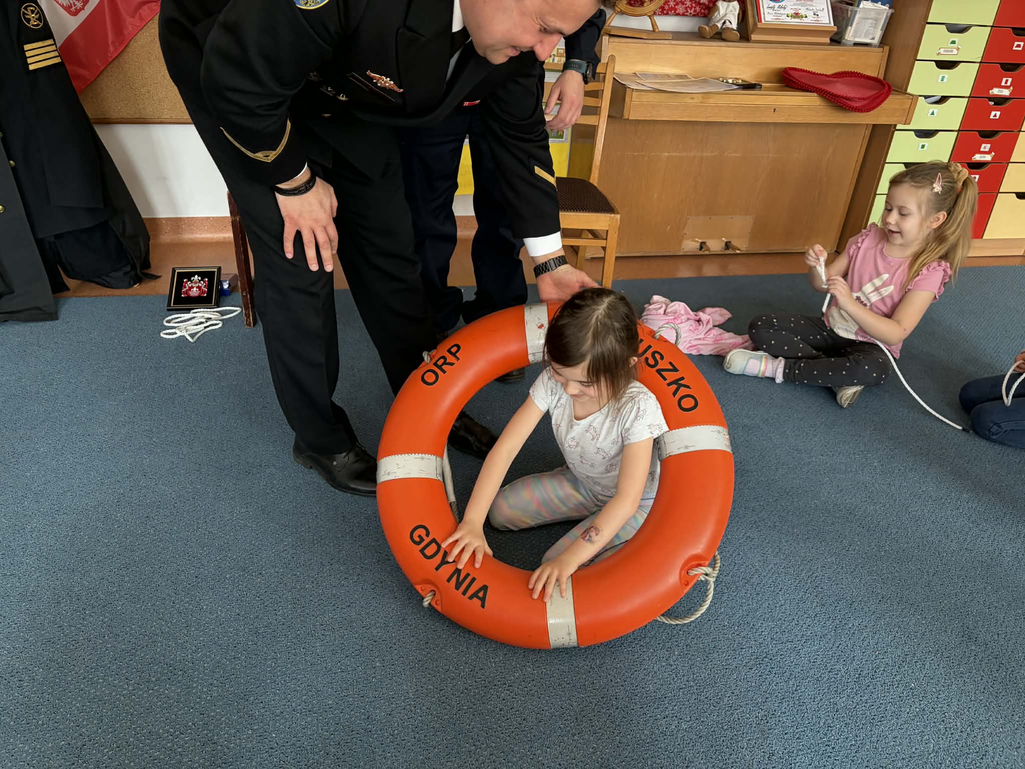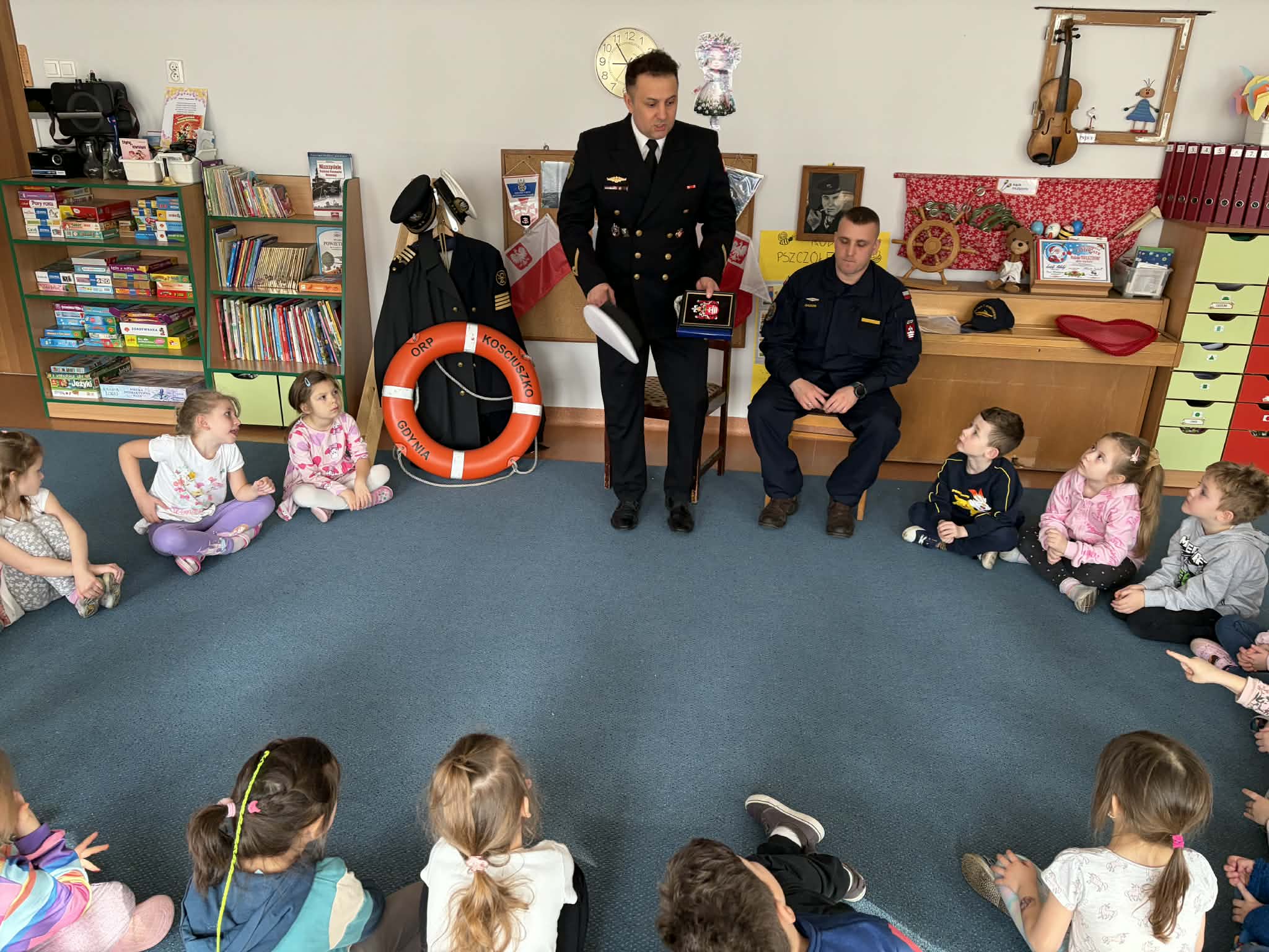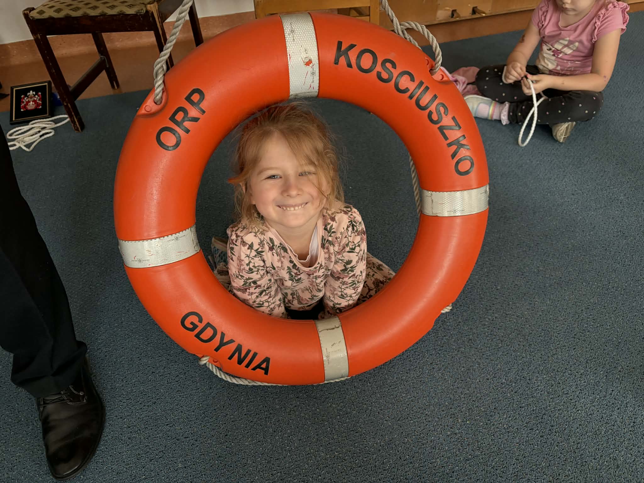 PSZCZÓŁKI MIAŁY OKAZJĘ POZNAĆ ZAŁOGĘ OKRĘTU ORP GEN. TADEUSZ KOŚCIUSZKO, KTÓRA OPOWIEDZIAŁA O SWOJEJ PRACY I SŁUŻBIE NA MORZU. DZIECI DOWIEDZIAŁY SIĘ: JAK WYGLĄDA CODZIENNE ŻYCIE NA OKRĘCIE, CO TO JEST " ŚWIST TRAPOWY", OBEJRZAŁY CIEKAWE FILMY I ZDJĘCIA ORAZ ZOBACZYŁY SPRZĘT RATOWNICZY. PODCZAS SPOTKANIA NAUCZYŁY SIĘ TAKŻE WIĄZAĆ PROSTY WĘZEŁ I WZIĘŁY UDZIAŁ W „CHRZCIE MORSKIM” Z ZABAWAMI, TAKIMI JAK: RZUCANIE DO CELU CZY PRZECIĄGANIE LINY. POZNAŁY RÓWNIEŻ PODSTAWOWE CZĘŚCI OKRĘTU: DZIÓB, RUFA I ŚRÓDOKRĘCIE. SERDECZNIE DZIĘKUJEMY ZAŁODZE ZA POŚWIĘCONY CZAS I INTERESUJĄCE SPOTKANIE.