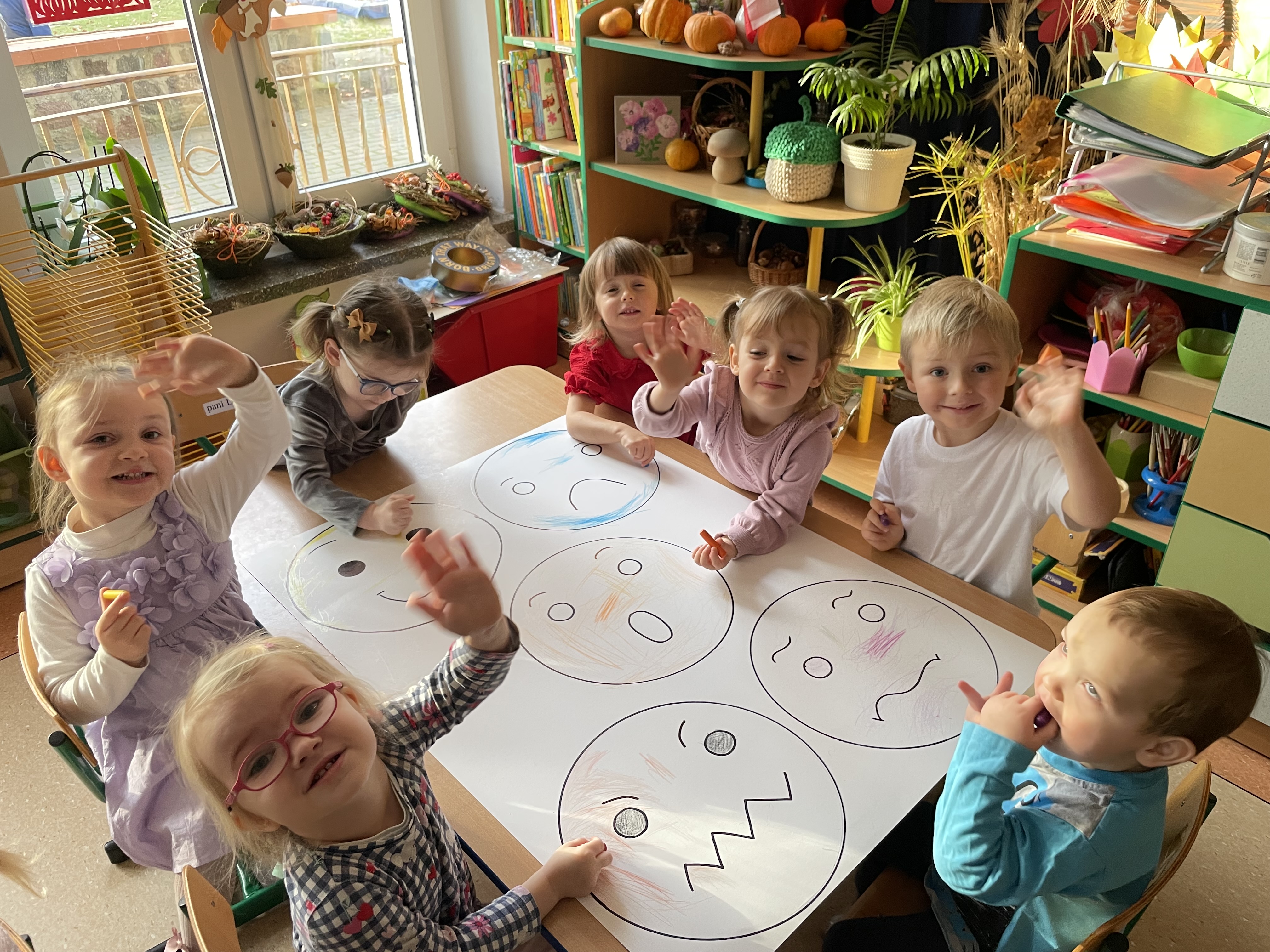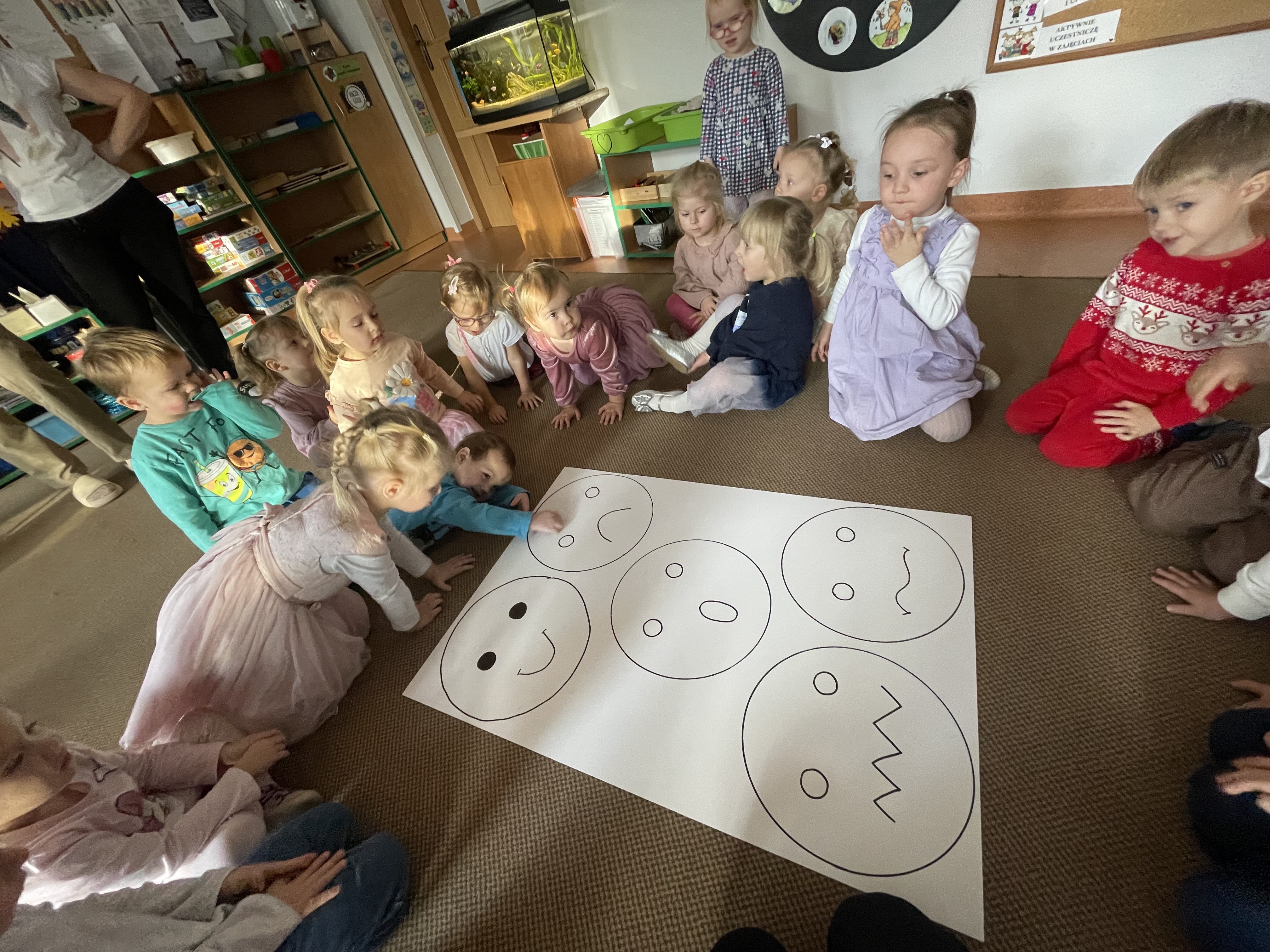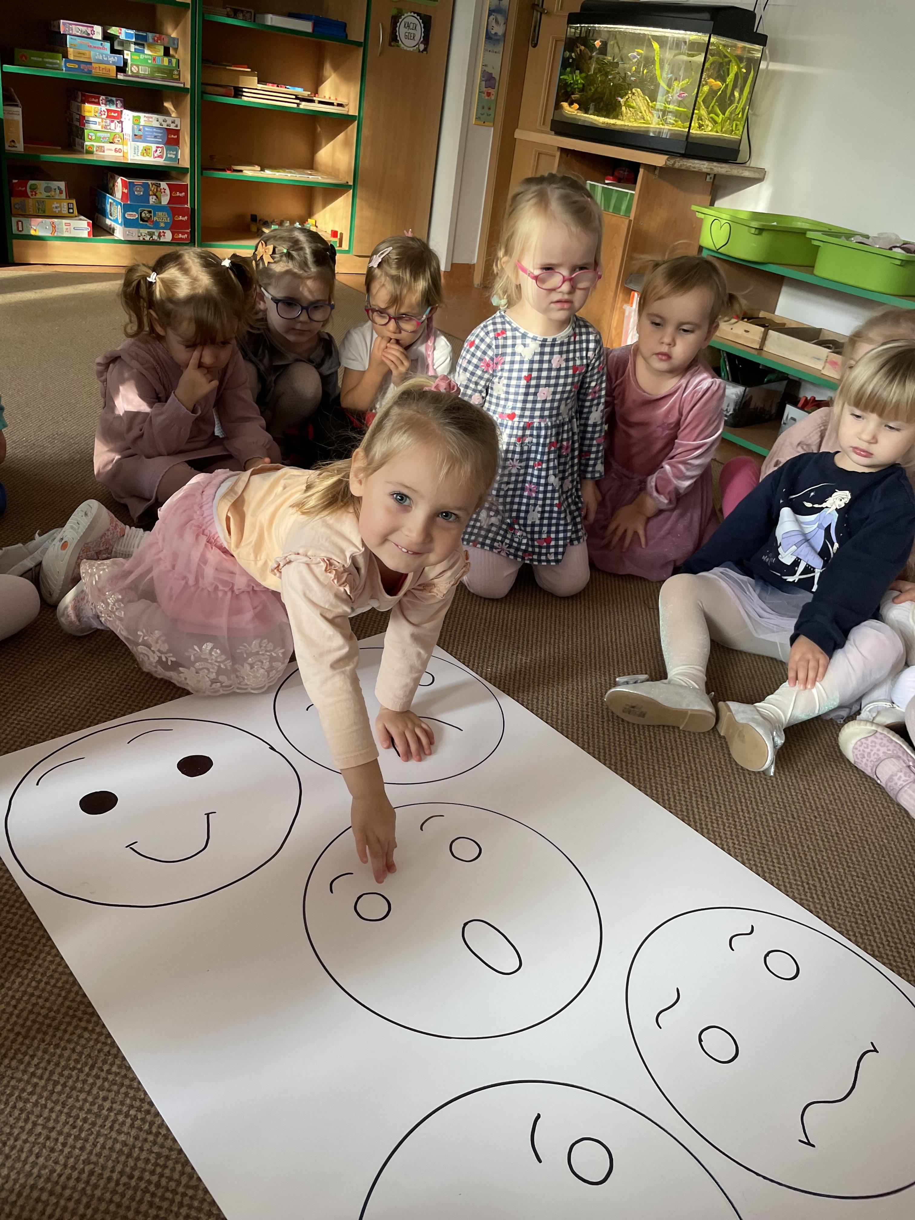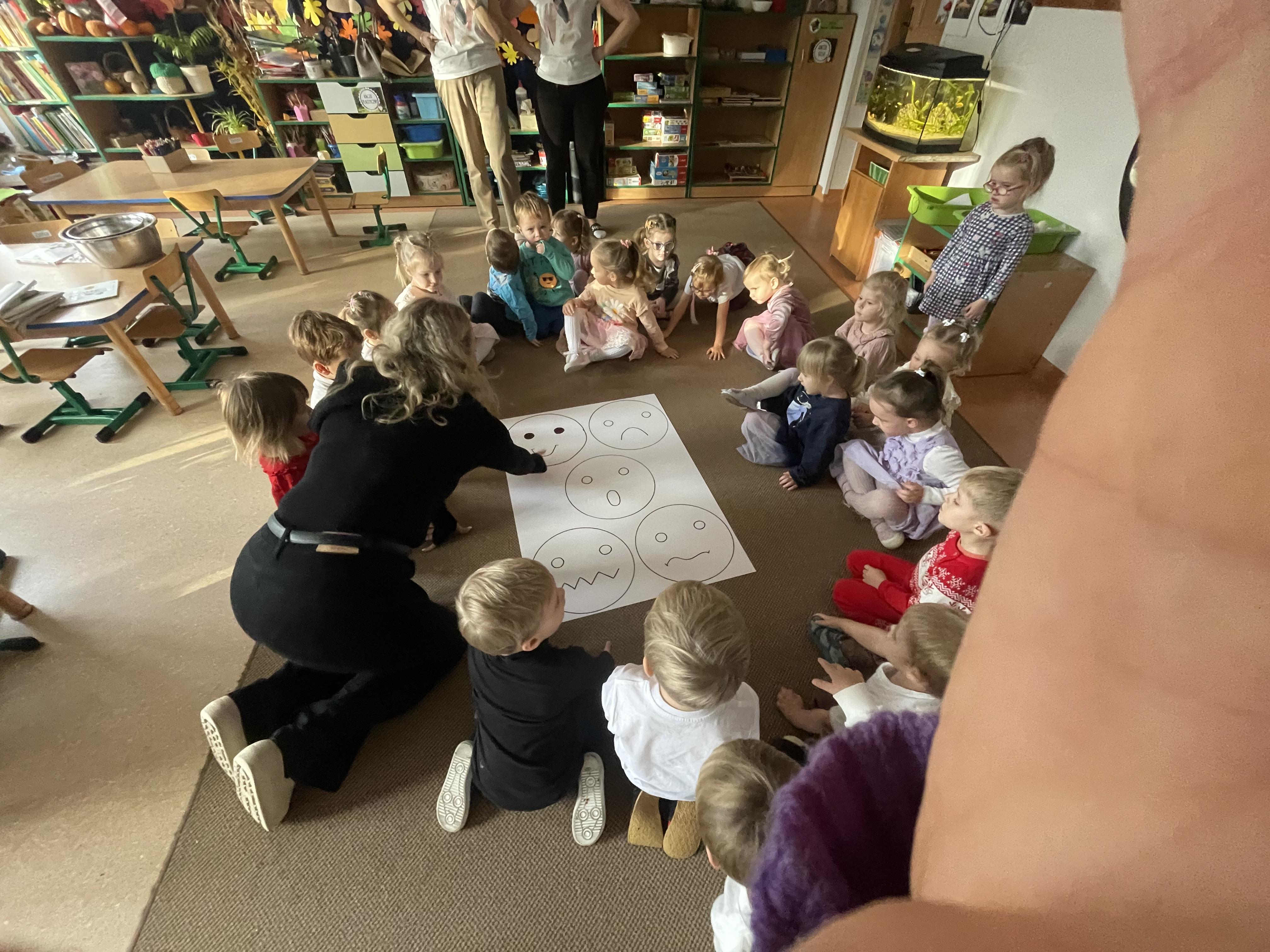 W naszej grupie odbyły się wyjątkowe zajęcia z panią pedagog poświęcone rozpoznawaniu i nazywaniu emocji. Dzieci z dużym zainteresowaniem uczestniczyły w rozmowach i zabawach, które pomagały im lepiej zrozumieć własne uczucia oraz emocje innych osób.