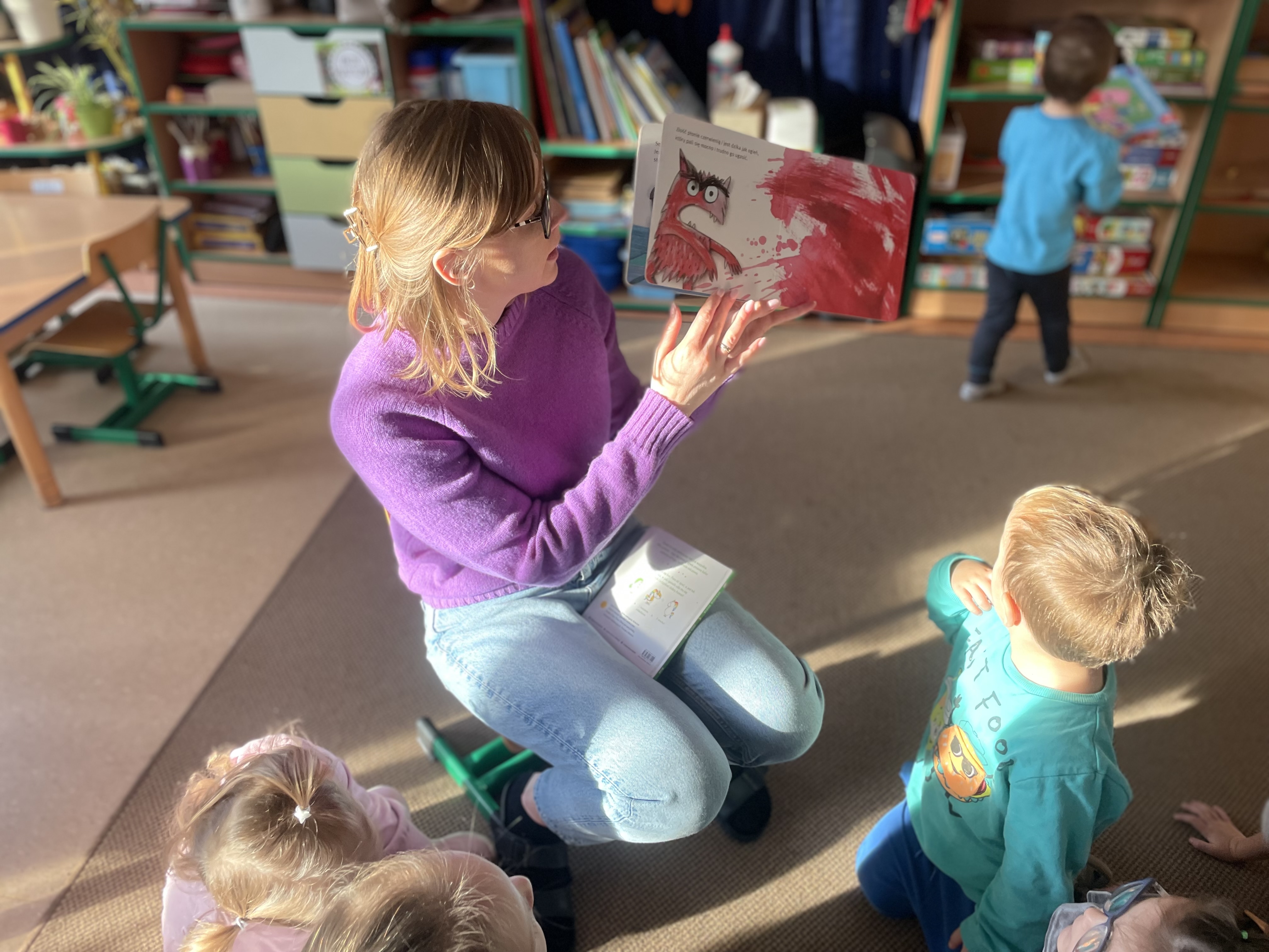Rozpoczęliśmy od wspólnego czytania książki o bohaterach, którzy uczą się radzić sobie ze smutkiem, radością czy złością. Dzięki temu dzieci mogły zobaczyć, że każdy z nas odczuwa różne emocje i że wszystkie są ważne.