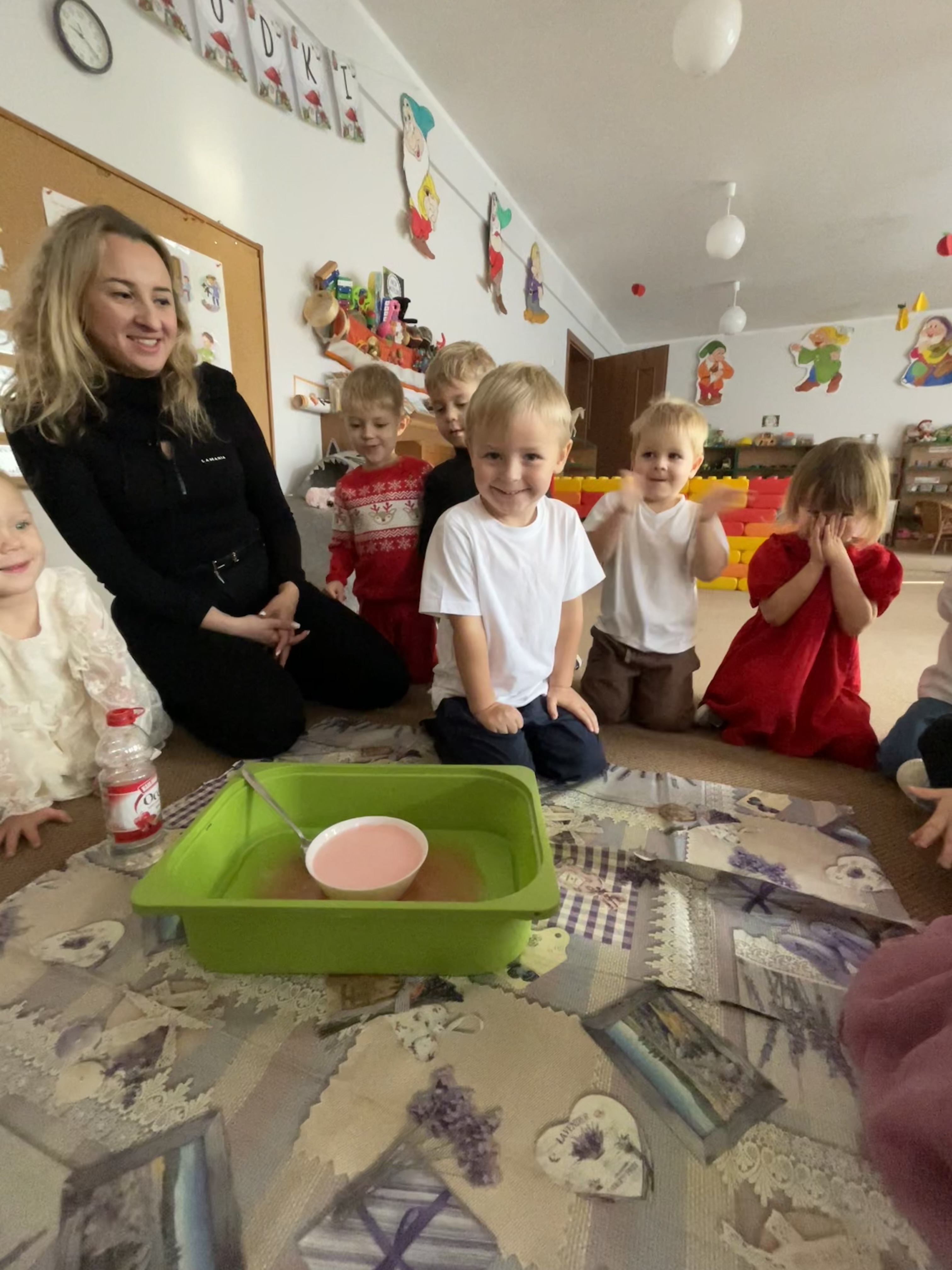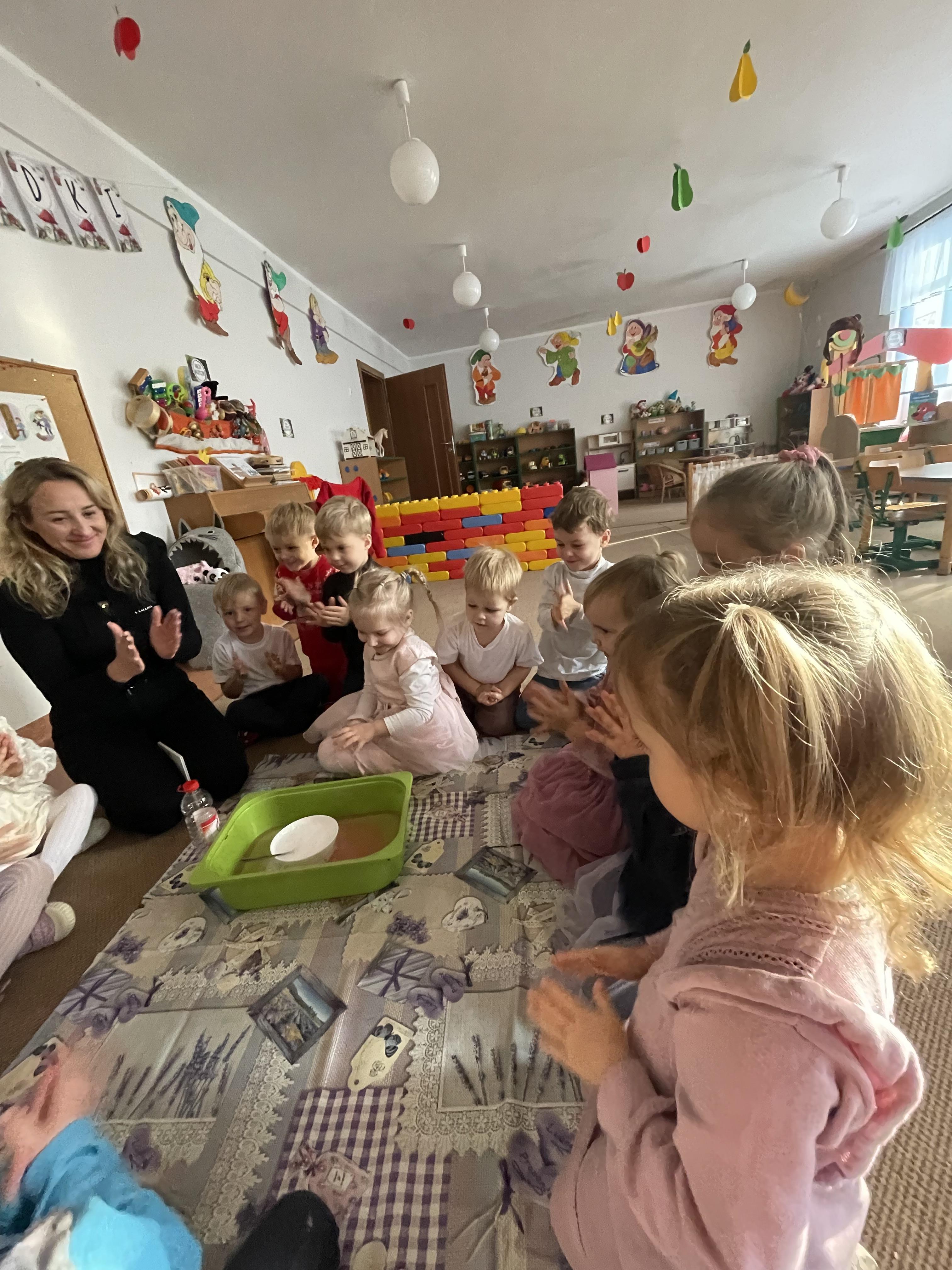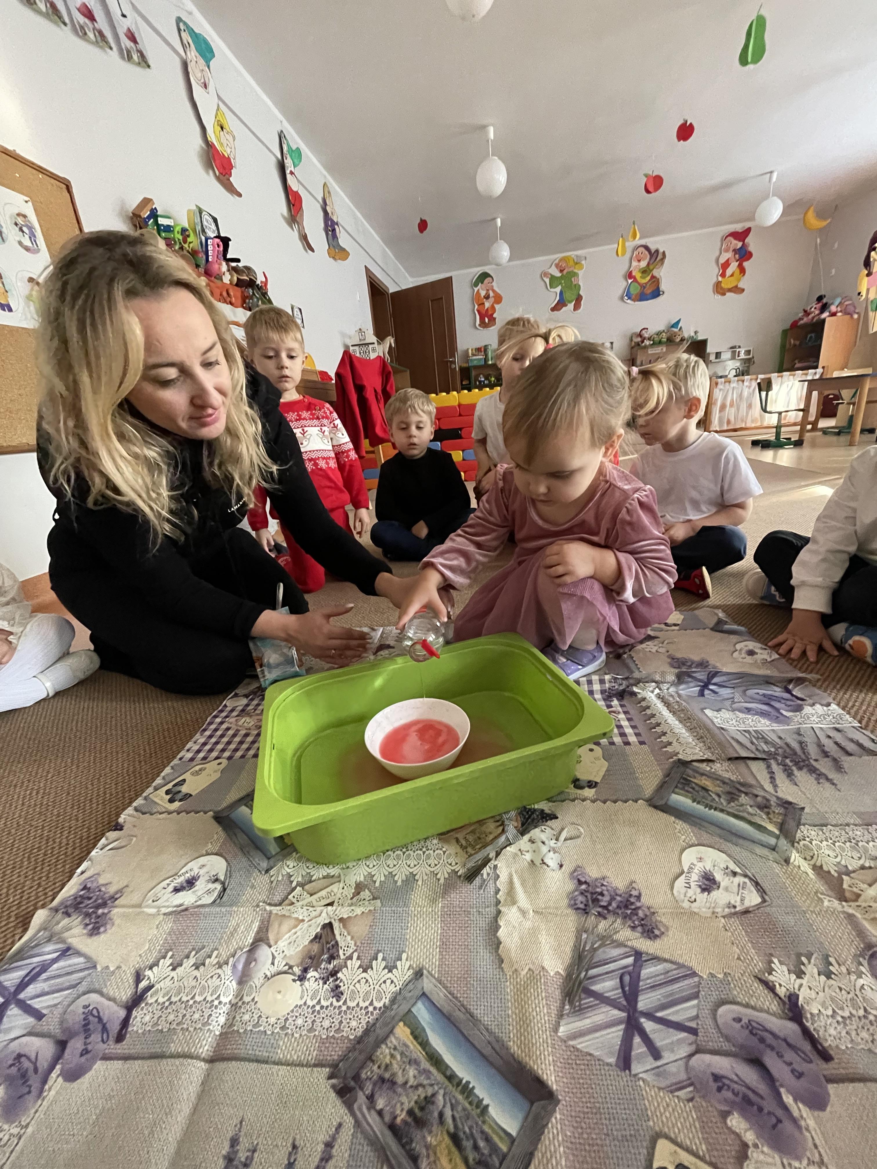 Następnie przeprowadziliśmy eksperyment pokazujący, że nawet największa złość mija — tak jak burza, która po chwili ustępuje miejsca spokojowi. Przedszkolaki z zainteresowaniem obserwowały, jak „złość” stopniowo znika, co stało się okazją do rozmów o tym, jak można się wyciszać i uspokajać.