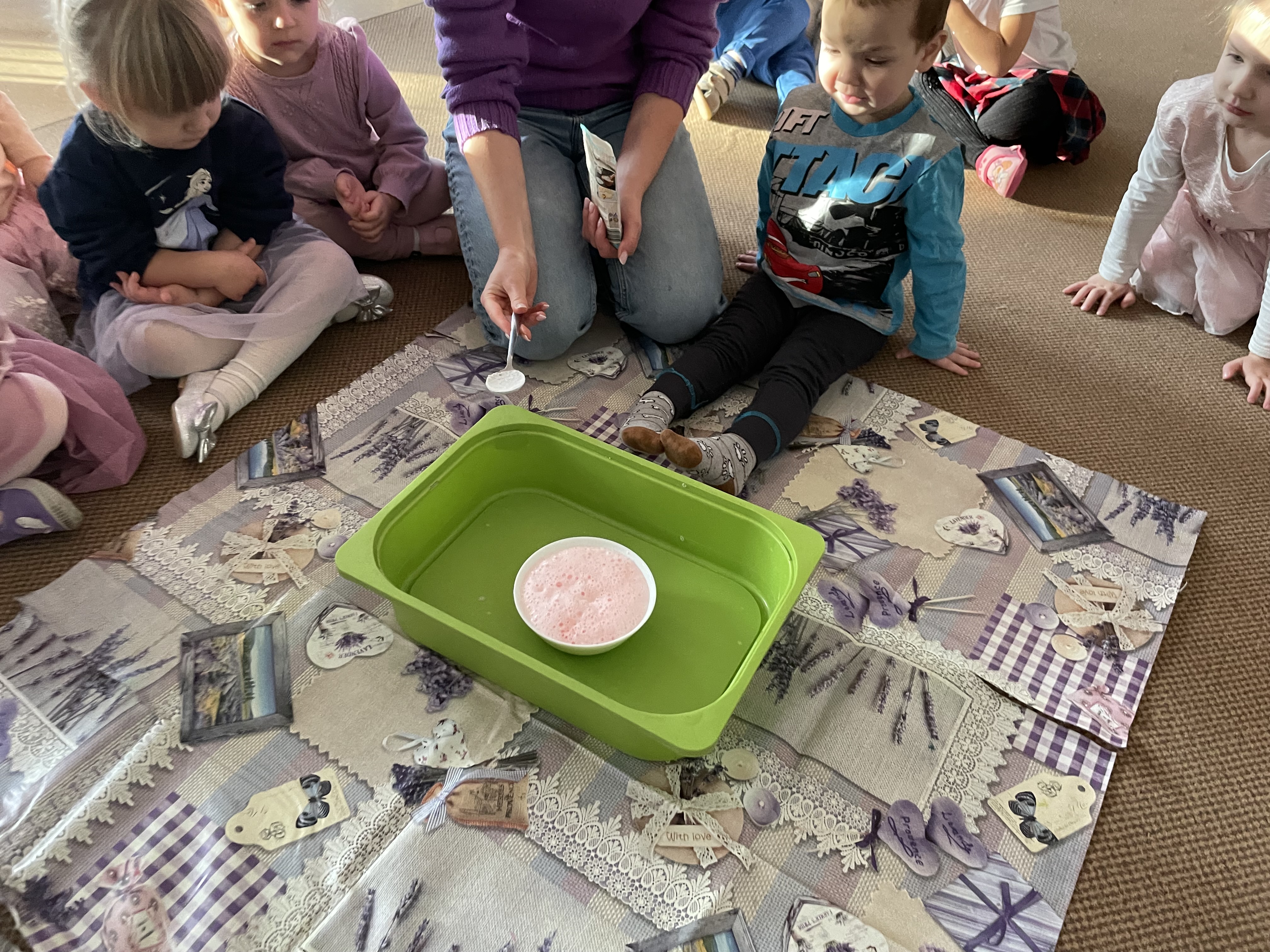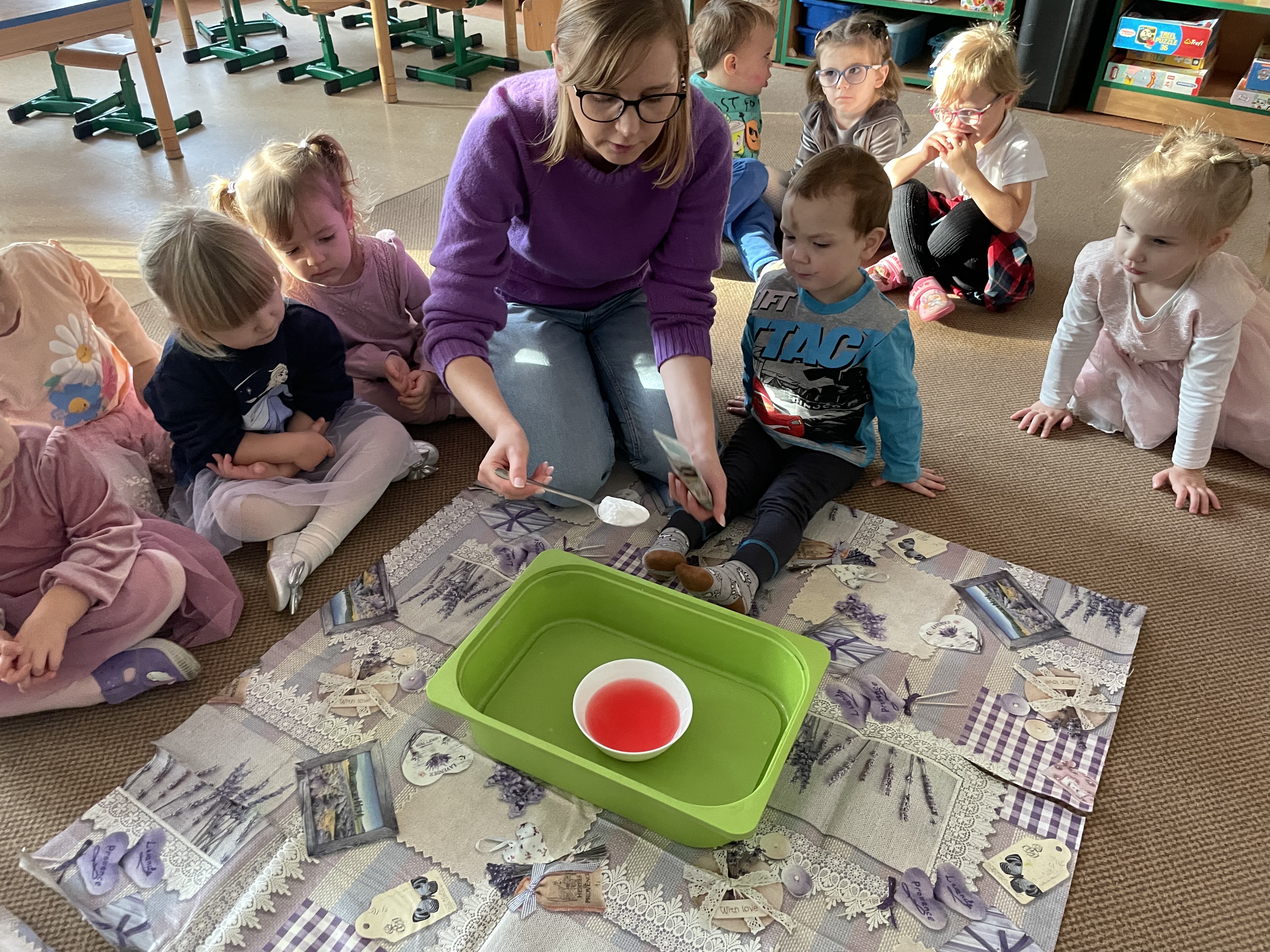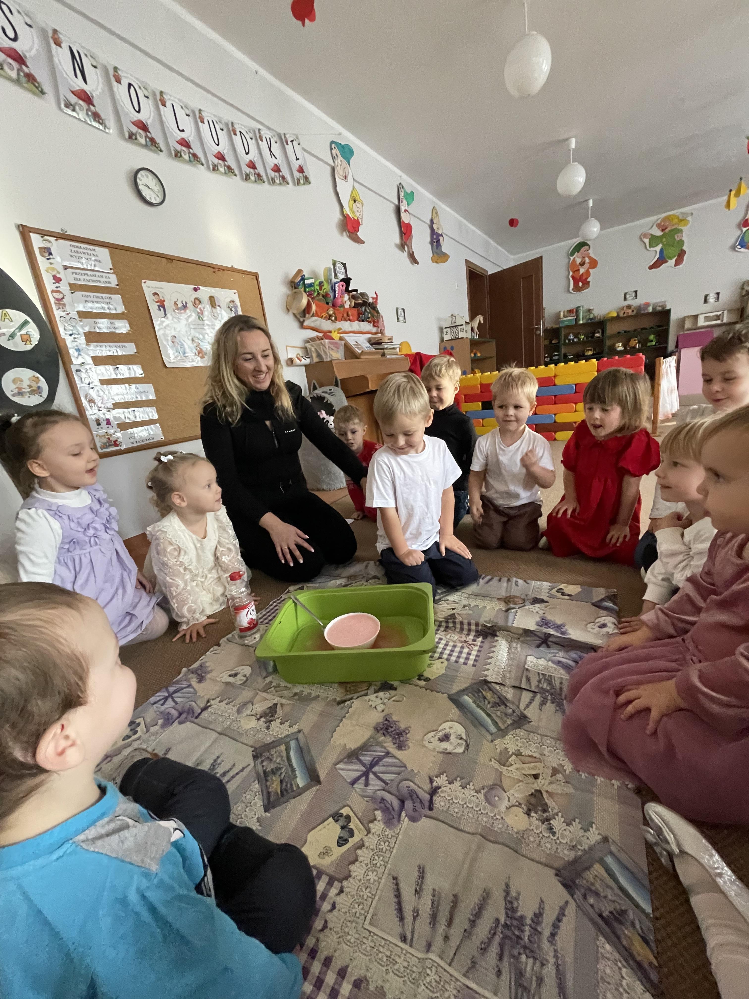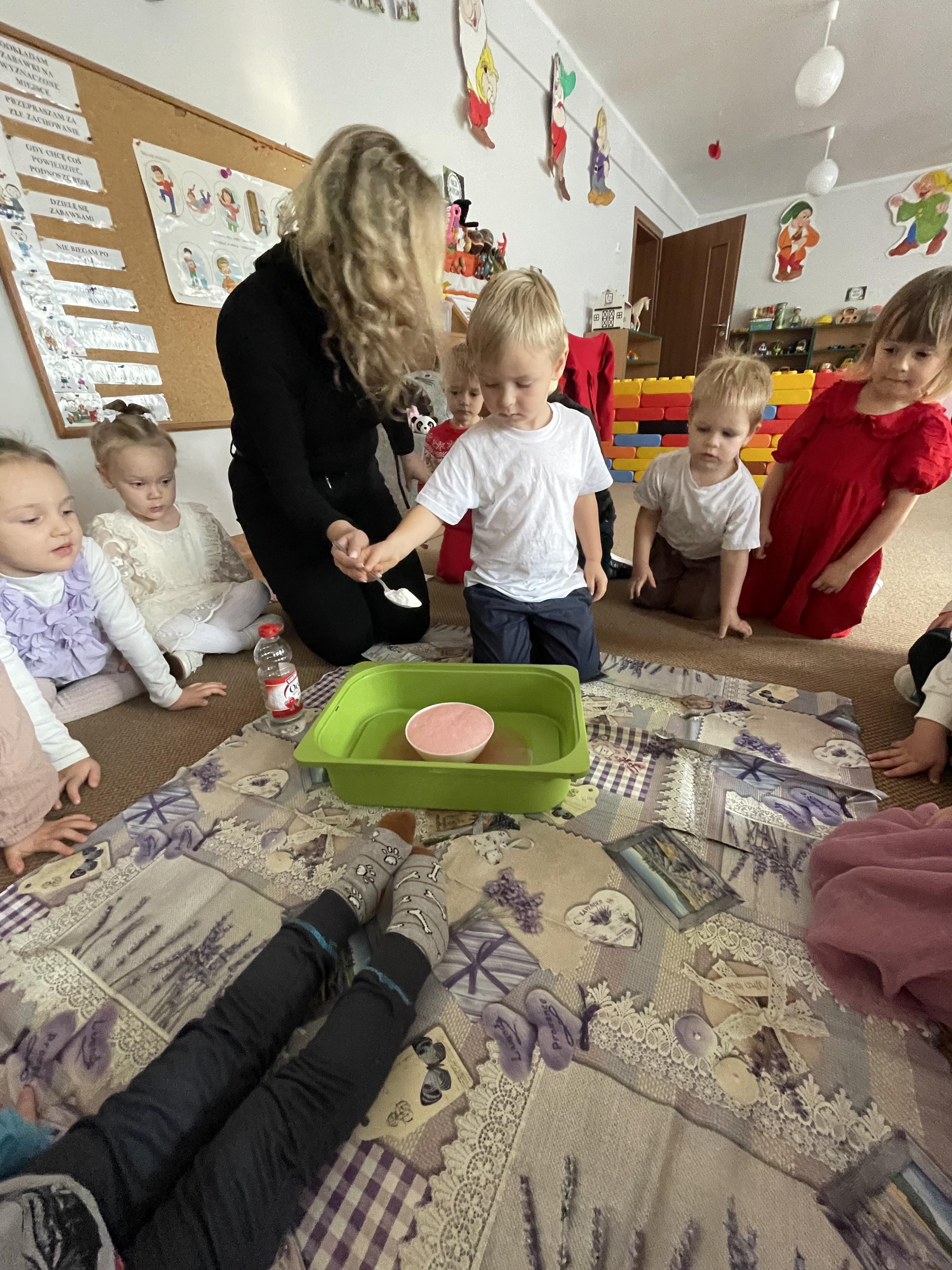 Następnie przeprowadziliśmy eksperyment pokazujący, że nawet największa złość mija — tak jak burza, która po chwili ustępuje miejsca spokojowi. Przedszkolaki z zainteresowaniem obserwowały, jak „złość” stopniowo znika, co stało się okazją do rozmów o tym, jak można się wyciszać i uspokajać.