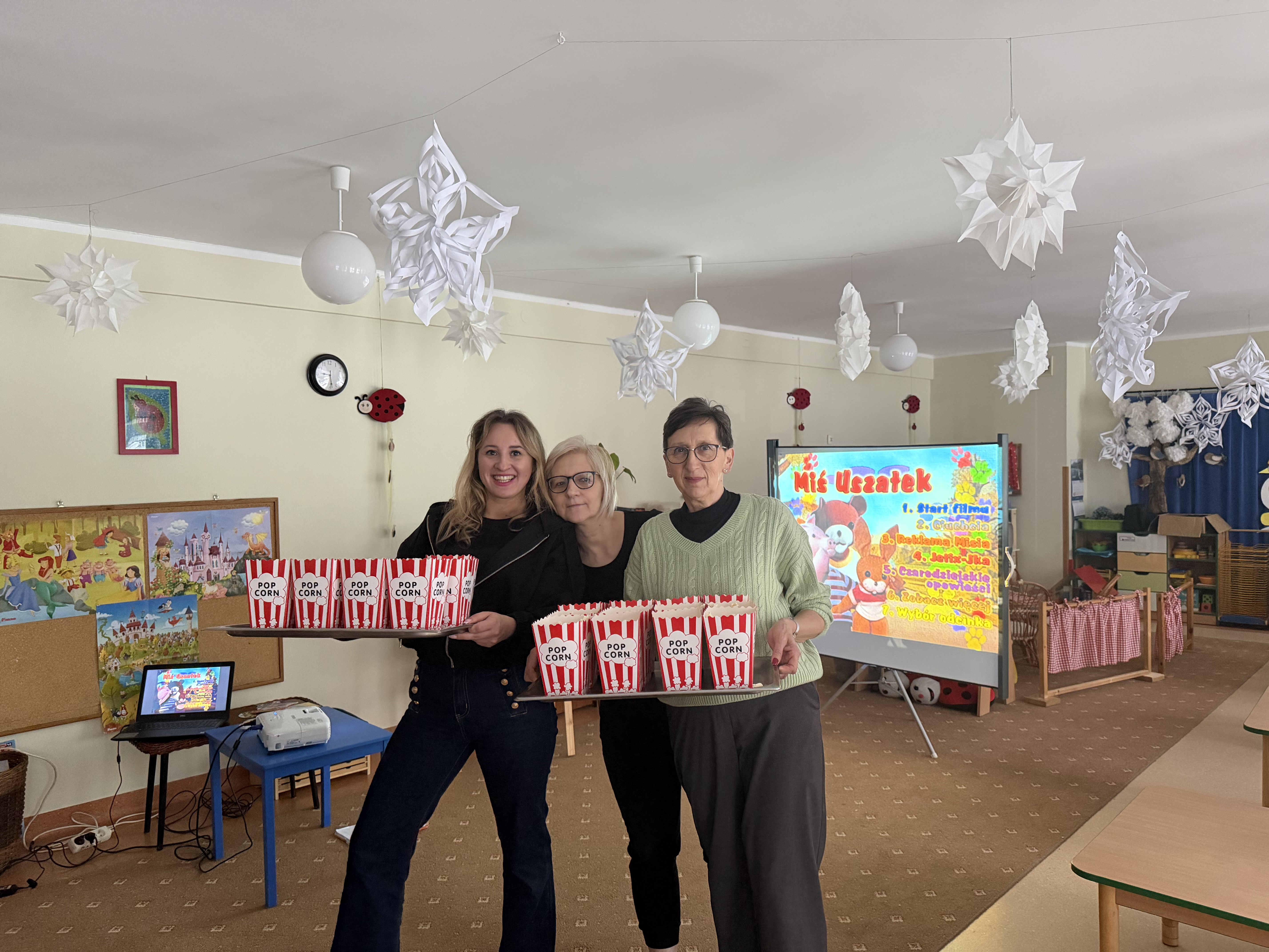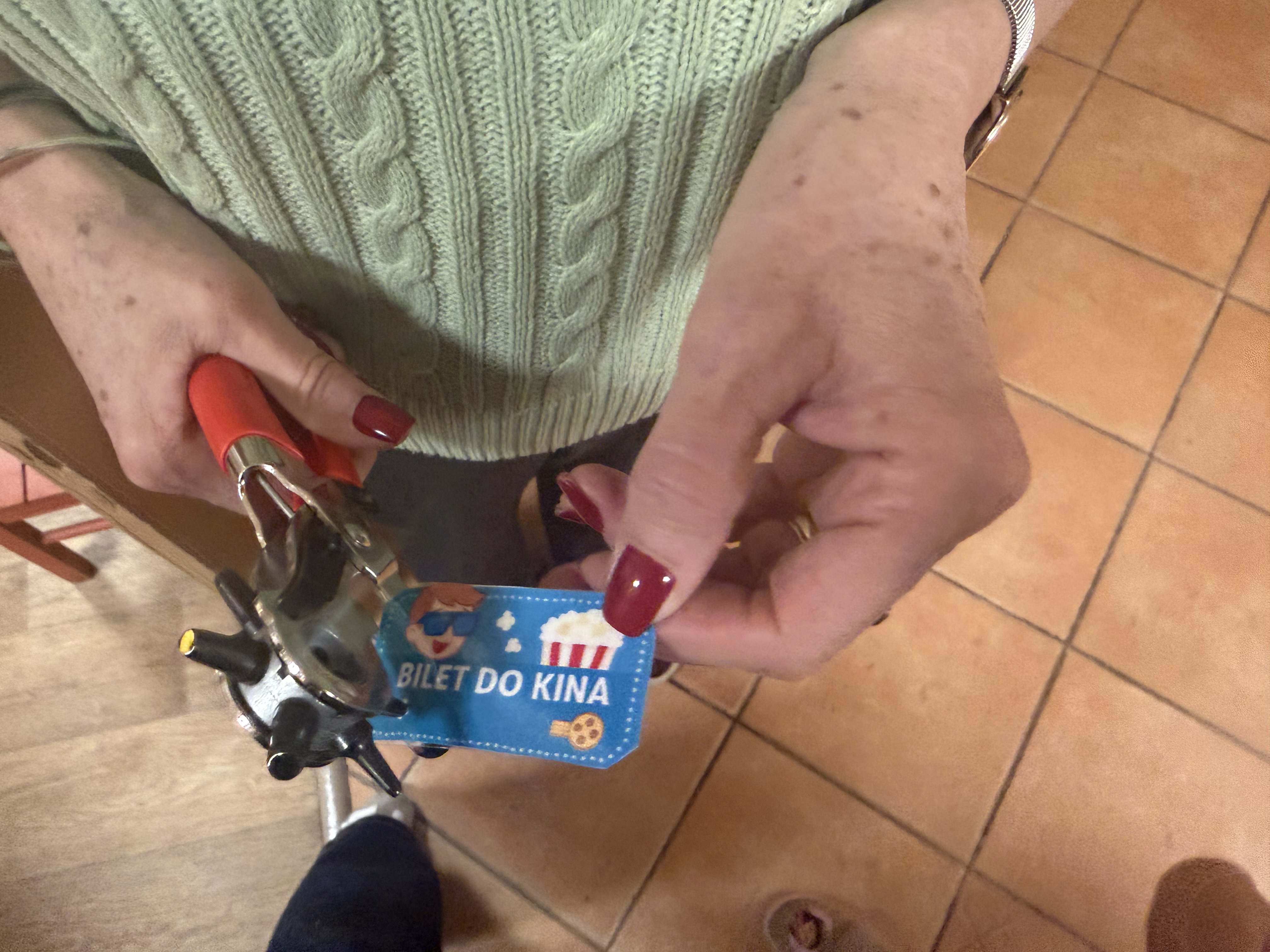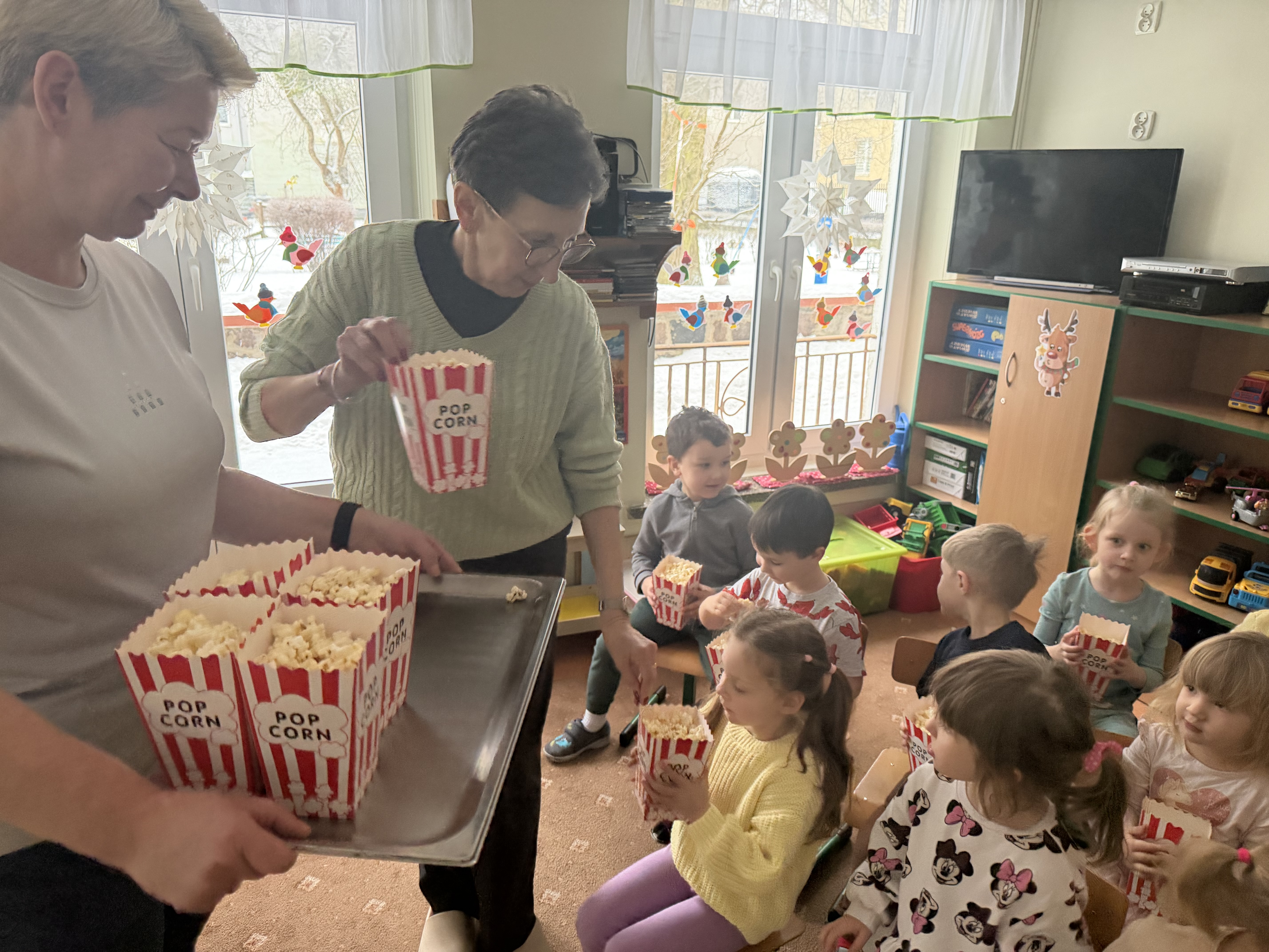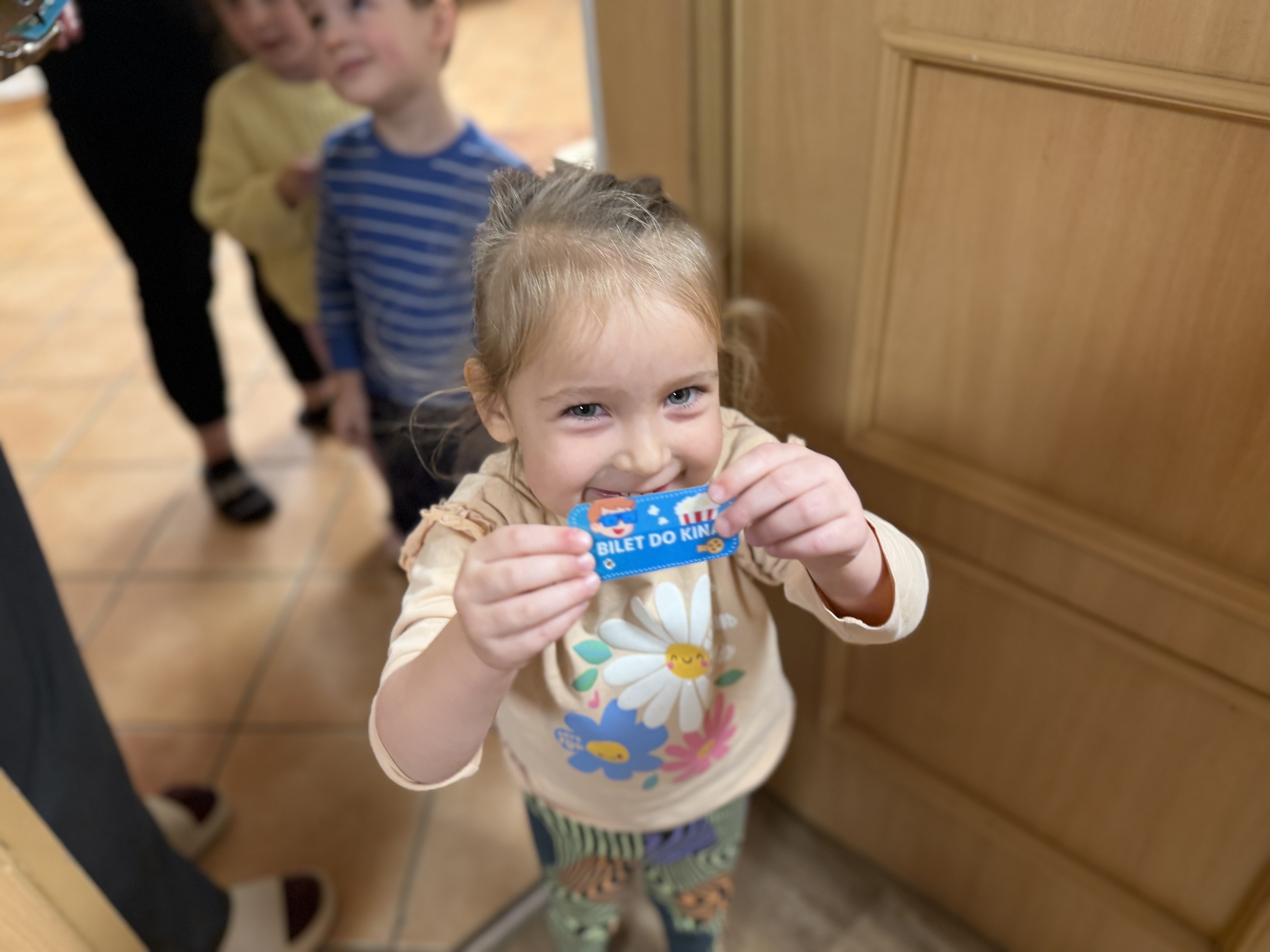 Potem nadszedł najbardziej wyczekiwany moment: Panie rozdawały bilety do kina, które dzieci kasowały, „płaciły” za popcorn i wybierały swoje miejsce na krzesełku. Każdy mógł poczuć się jak prawdziwy widz w kinie.