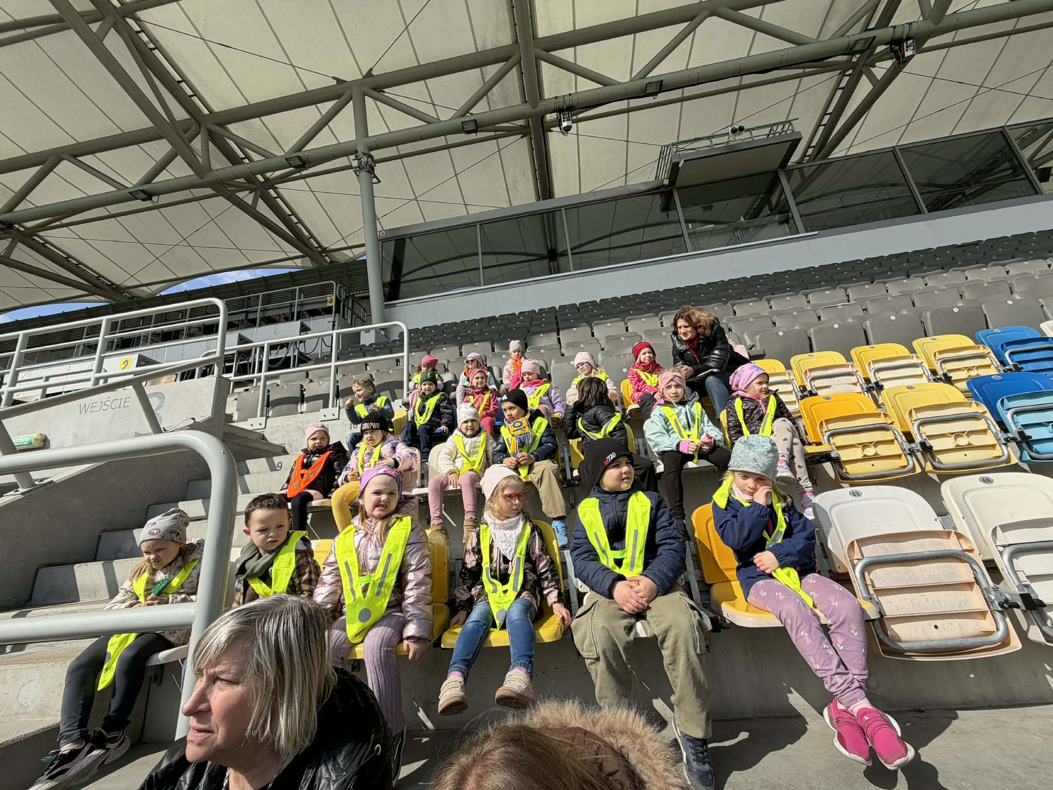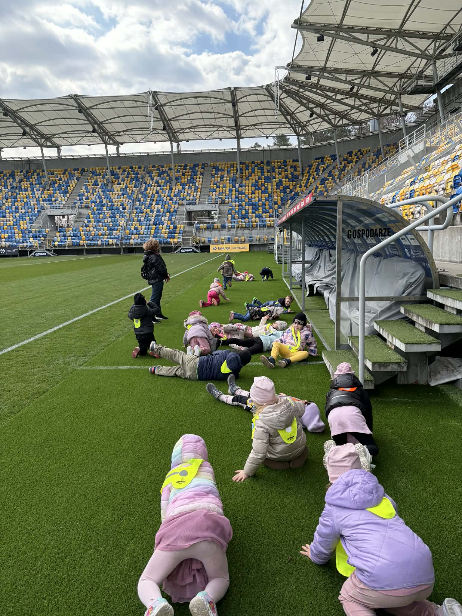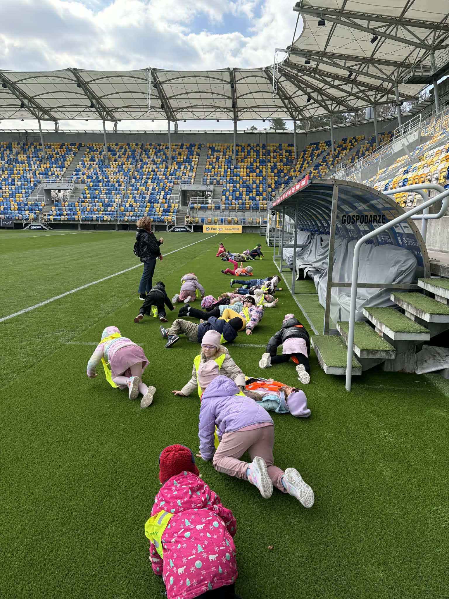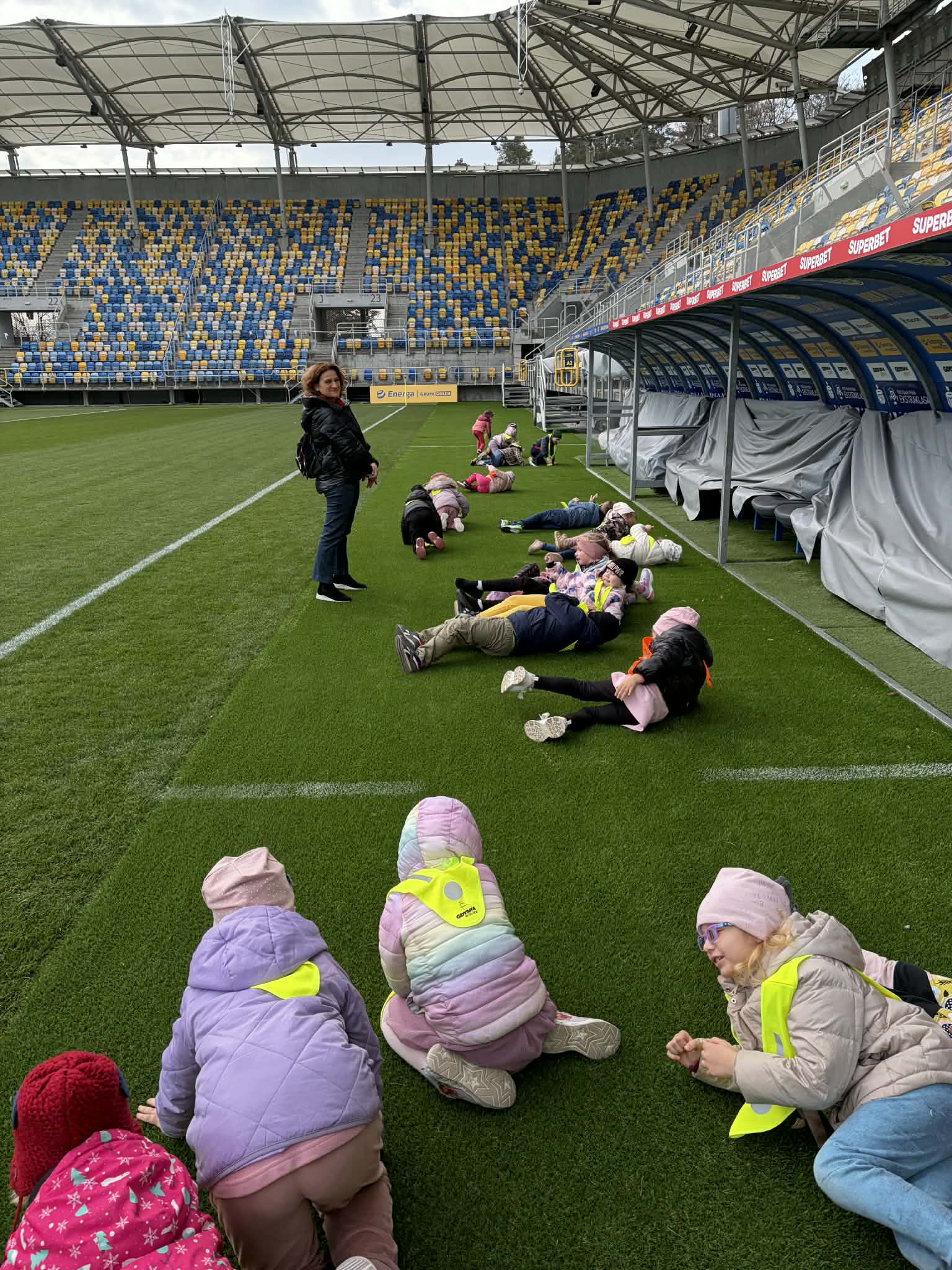 PODCZAS NASZEJ WYCIECZKI, KTÓRA ODBYŁA SIĘ 16 KWIETNIA, MIELIŚMY OKAZJĘ ZWIEDZIĆ STADION MIEJSKI. ZOBACZYLIŚMY RECEPCJĘ, SALĘ KONFERENCYJNĄ ORAZ KORYTARZE Z WYJĄTKOWYMI FOTOGRAFIAMI PRZEDSTAWIAJĄCYMI ETAPY BUDOWY STADIONU. ODWIEDZILIŚMY TAKŻE SZATNIĘ PIŁKARZY GOŚCI, SIŁOWNIĘ I TRYBUNĘ VIP, Z KTÓREJ BYŁ ŚWIETNY WIDOK NA STADION. JAKO KIBICE MOGLIŚMY OBEJRZEĆ TRENING PIŁKARZY, A NAWET WEJŚĆ NA MURAWĘ — NAJWIĘKSZĄ ATRAKCJĄ BYŁO TURLANIE SIĘ PO NIEJ. NA KONIEC UDAŁO NAM SIĘ ZROBIĆ ZDJĘCIE Z DAWIDEM GOJNĄ- KAPITANEM DRUŻYNY.