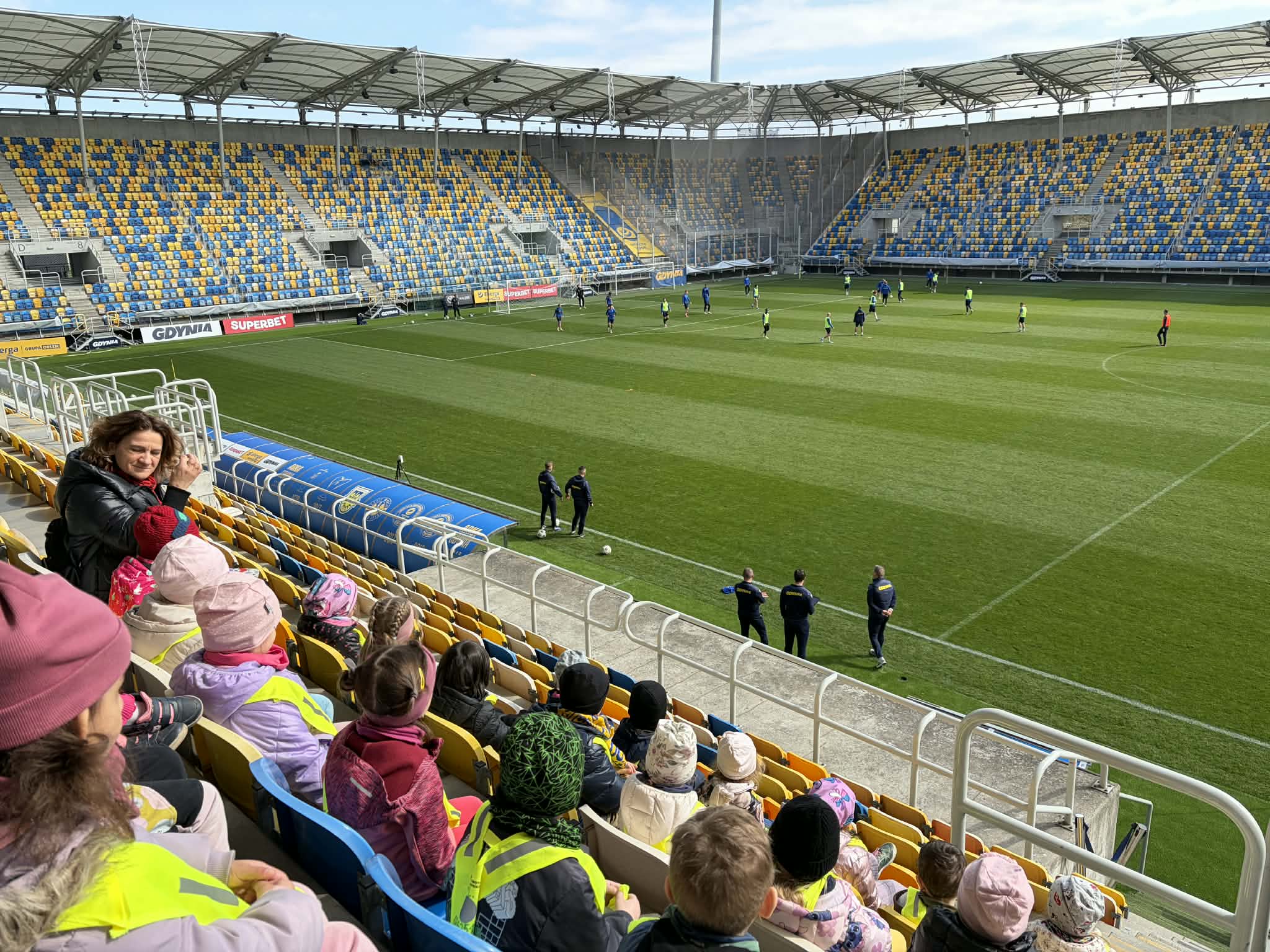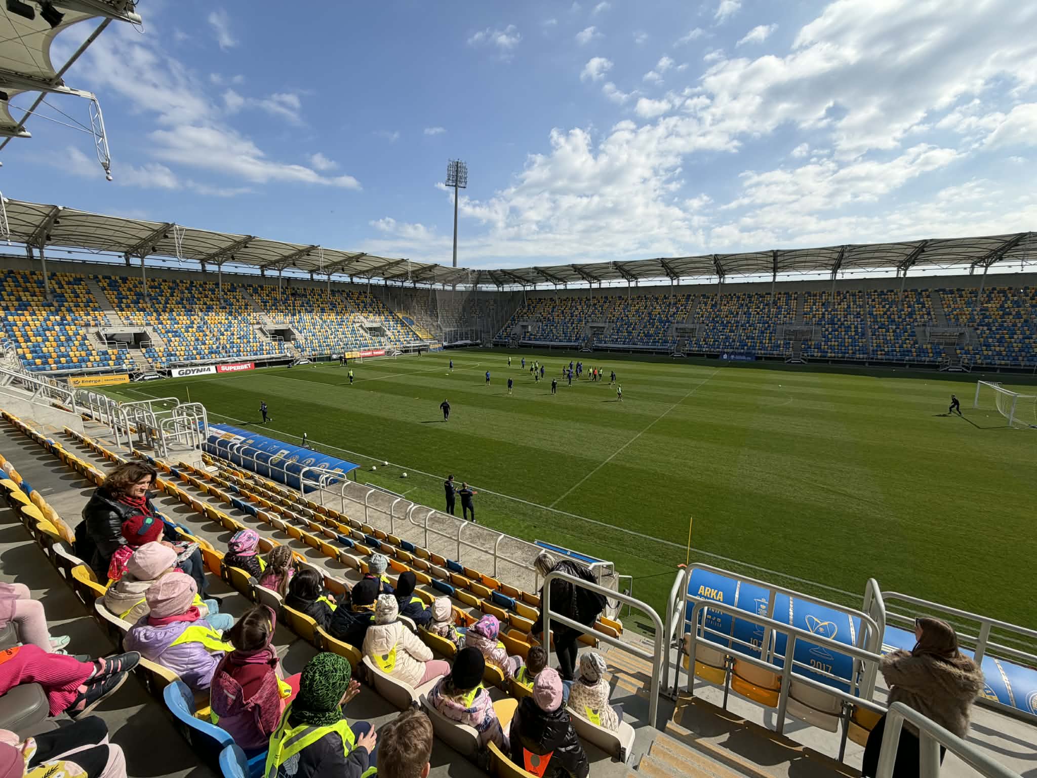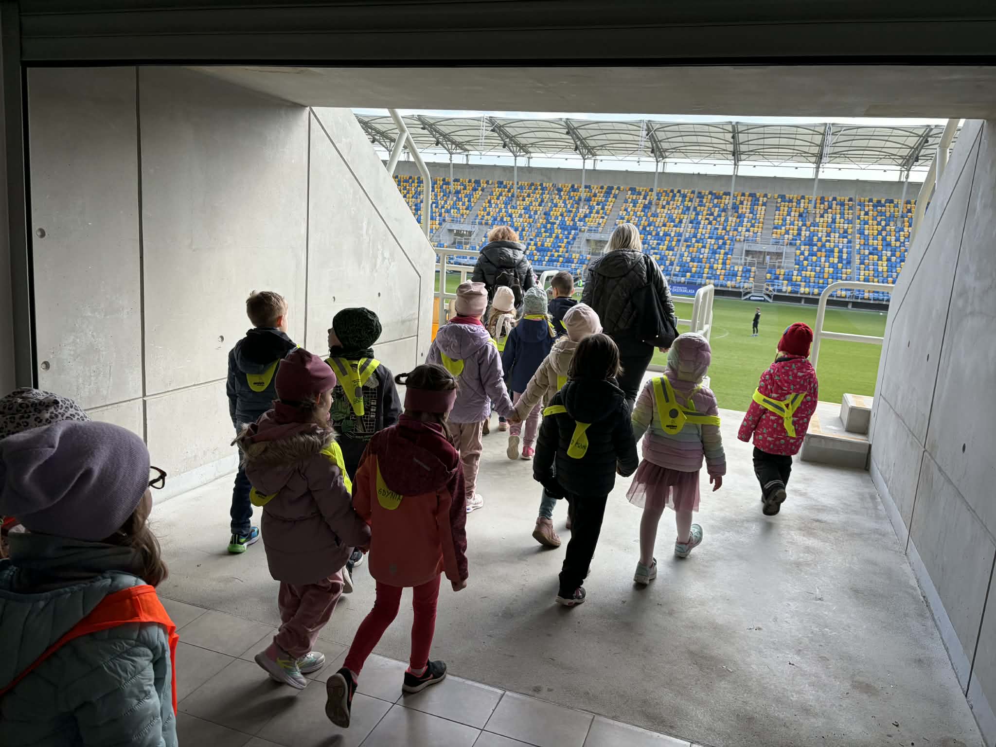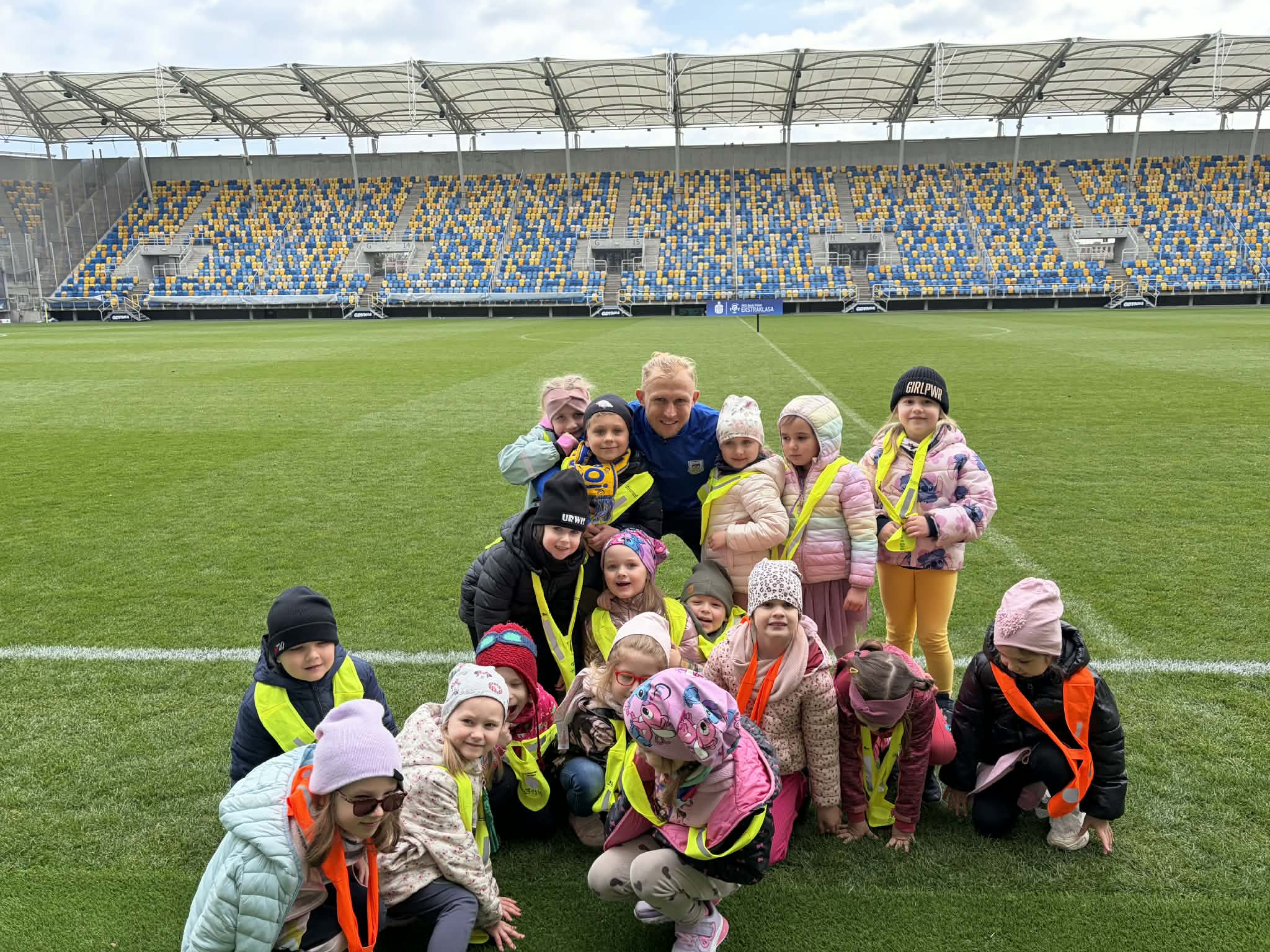 PODCZAS NASZEJ WYCIECZKI, KTÓRA ODBYŁA SIĘ 16 KWIETNIA, MIELIŚMY OKAZJĘ ZWIEDZIĆ STADION MIEJSKI. ZOBACZYLIŚMY RECEPCJĘ, SALĘ KONFERENCYJNĄ ORAZ KORYTARZE Z WYJĄTKOWYMI FOTOGRAFIAMI PRZEDSTAWIAJĄCYMI ETAPY BUDOWY STADIONU. ODWIEDZILIŚMY TAKŻE SZATNIĘ PIŁKARZY GOŚCI, SIŁOWNIĘ I TRYBUNĘ VIP, Z KTÓREJ BYŁ ŚWIETNY WIDOK NA STADION. JAKO KIBICE MOGLIŚMY OBEJRZEĆ TRENING PIŁKARZY, A NAWET WEJŚĆ NA MURAWĘ — NAJWIĘKSZĄ ATRAKCJĄ BYŁO TURLANIE SIĘ PO NIEJ. NA KONIEC UDAŁO NAM SIĘ ZROBIĆ ZDJĘCIE Z DAWIDEM GOJNĄ- KAPITANEM DRUŻYNY.