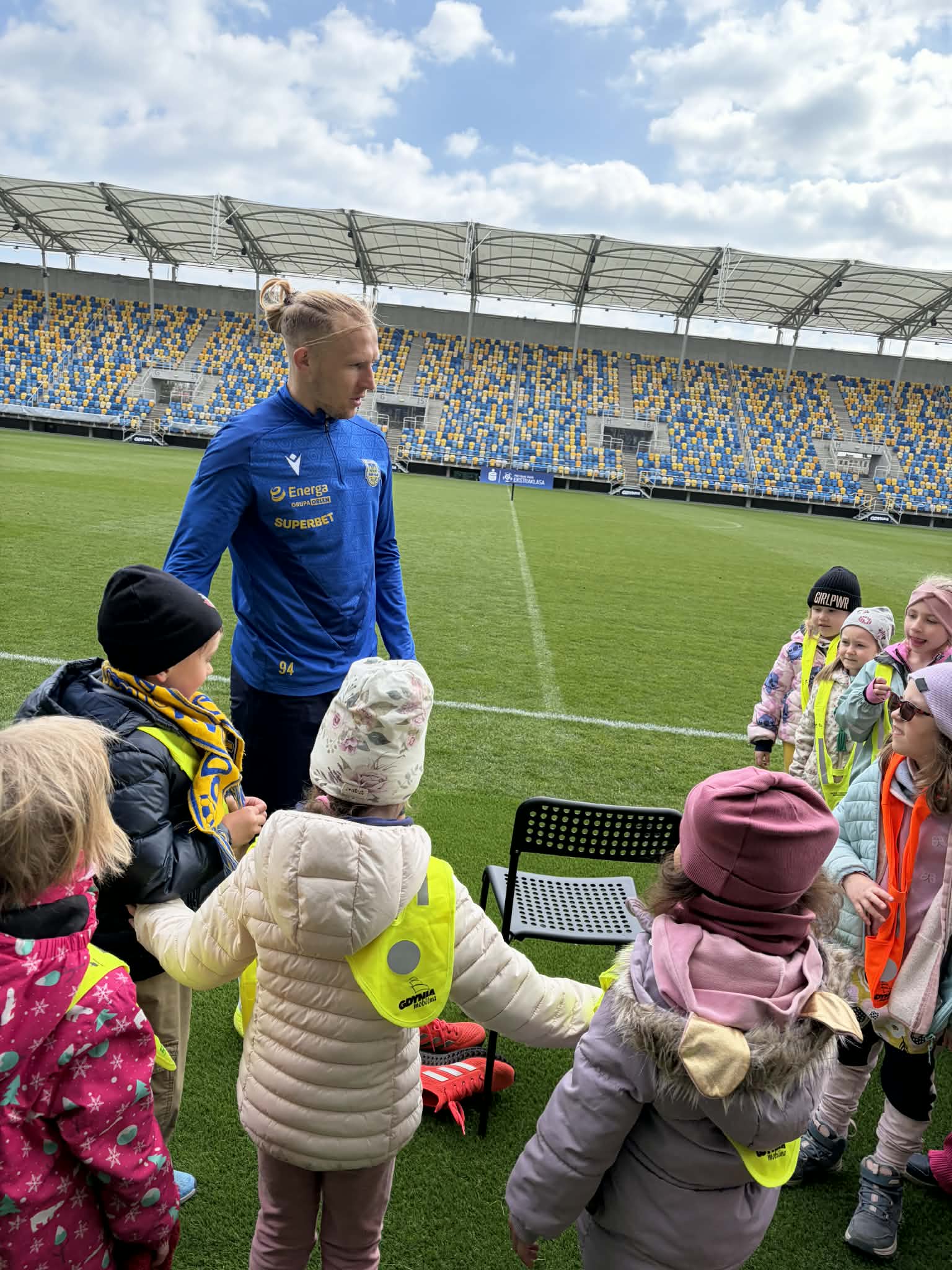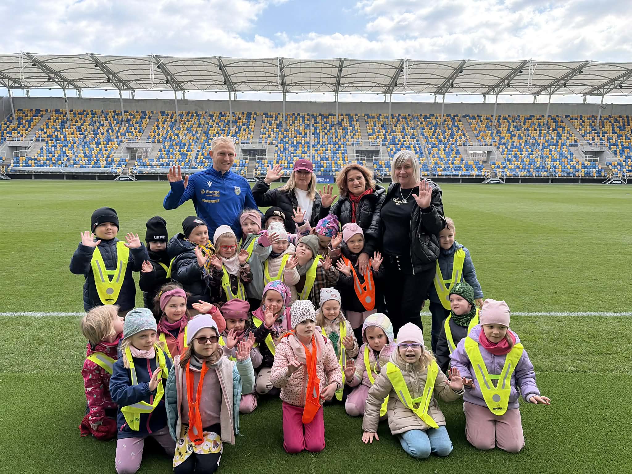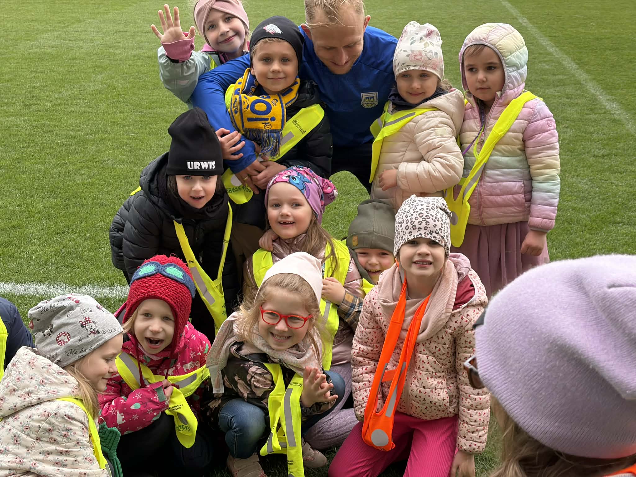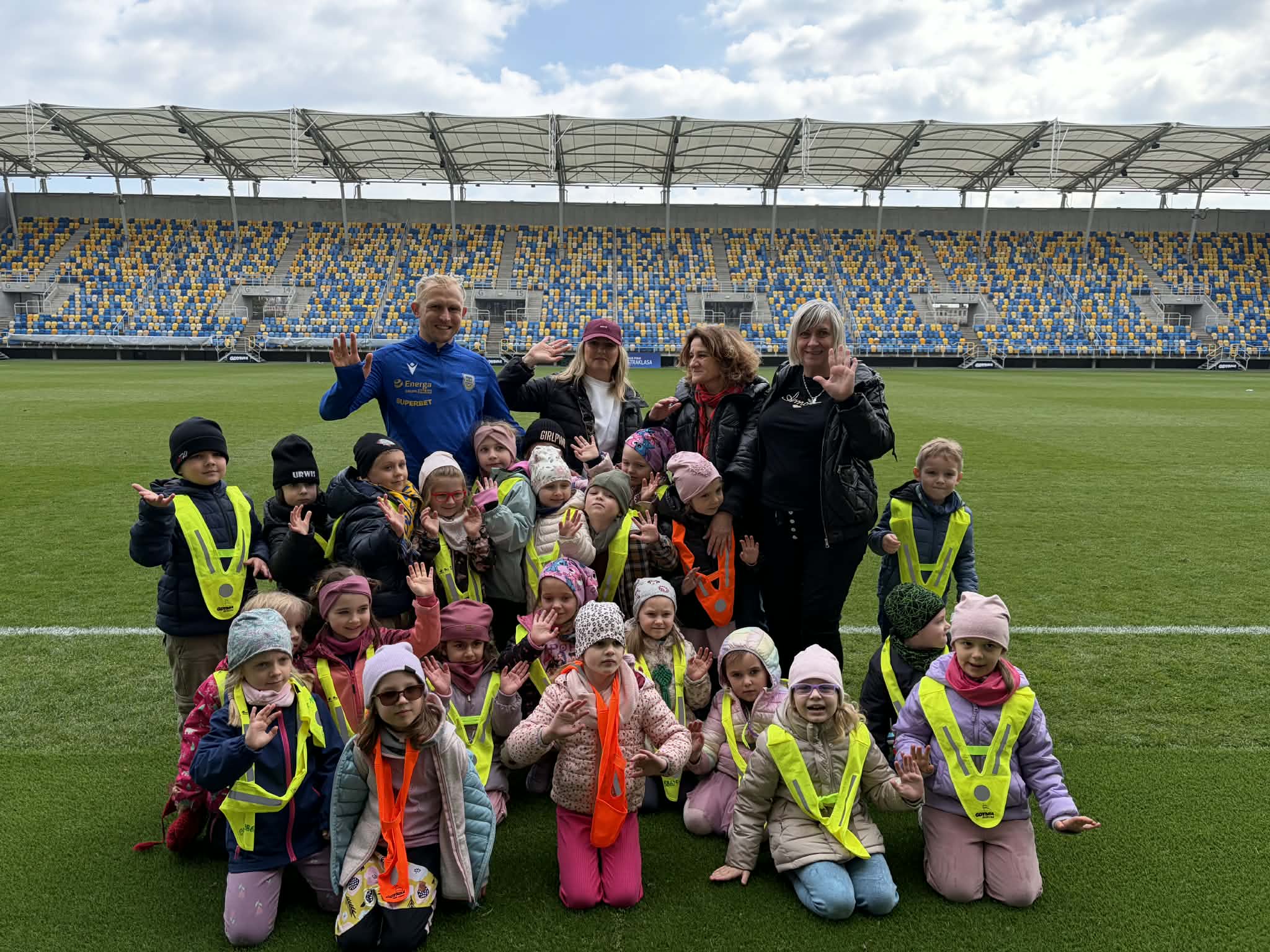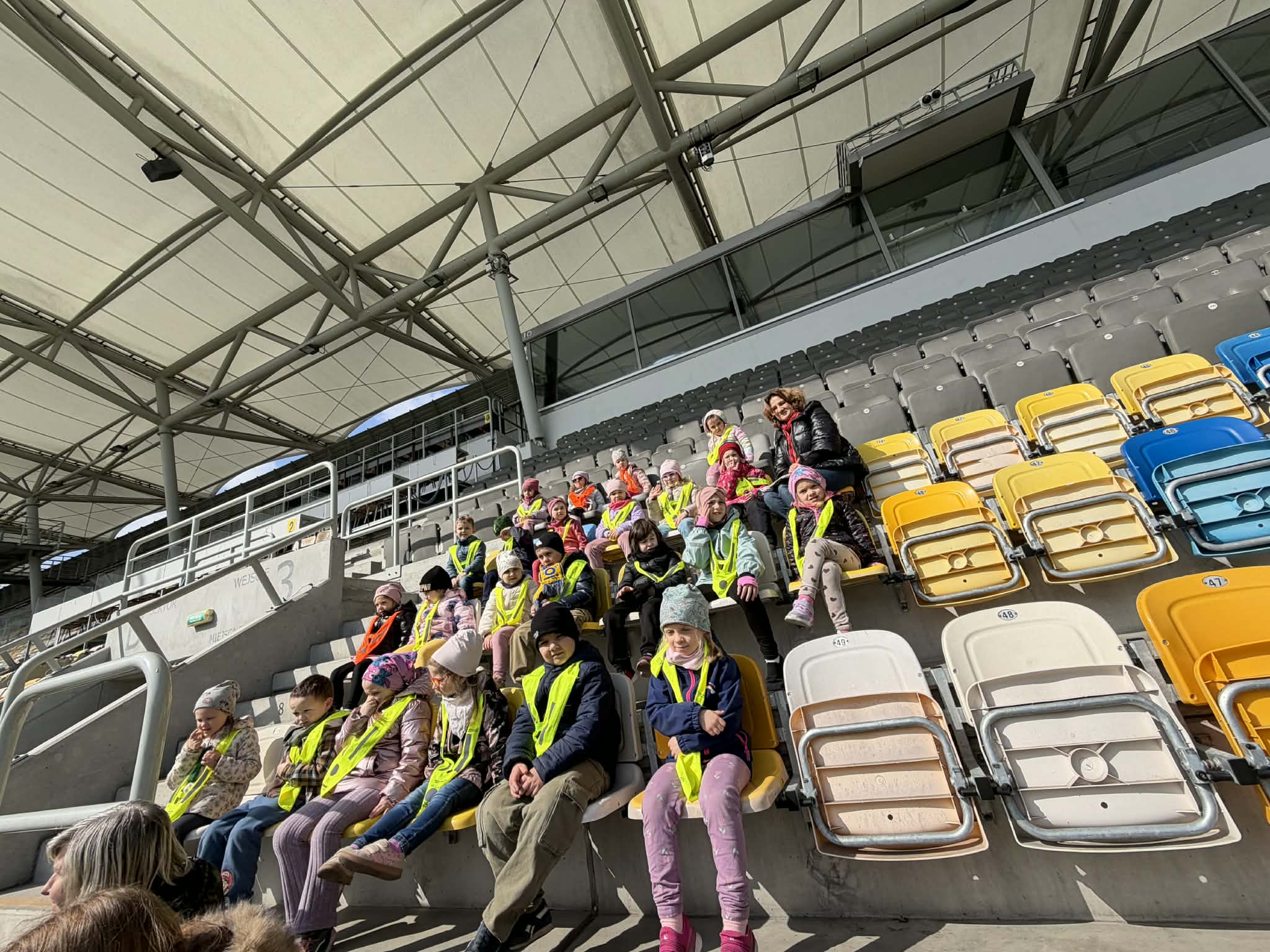 PODCZAS NASZEJ WYCIECZKI, KTÓRA ODBYŁA SIĘ 16 KWIETNIA, MIELIŚMY OKAZJĘ ZWIEDZIĆ STADION MIEJSKI. ZOBACZYLIŚMY RECEPCJĘ, SALĘ KONFERENCYJNĄ ORAZ KORYTARZE Z WYJĄTKOWYMI FOTOGRAFIAMI PRZEDSTAWIAJĄCYMI ETAPY BUDOWY STADIONU. ODWIEDZILIŚMY TAKŻE SZATNIĘ PIŁKARZY GOŚCI, SIŁOWNIĘ I TRYBUNĘ VIP, Z KTÓREJ BYŁ ŚWIETNY WIDOK NA STADION. JAKO KIBICE MOGLIŚMY OBEJRZEĆ TRENING PIŁKARZY, A NAWET WEJŚĆ NA MURAWĘ — NAJWIĘKSZĄ ATRAKCJĄ BYŁO TURLANIE SIĘ PO NIEJ. NA KONIEC UDAŁO NAM SIĘ ZROBIĆ ZDJĘCIE Z DAWIDEM GOJNĄ- KAPITANEM DRUŻYNY.
