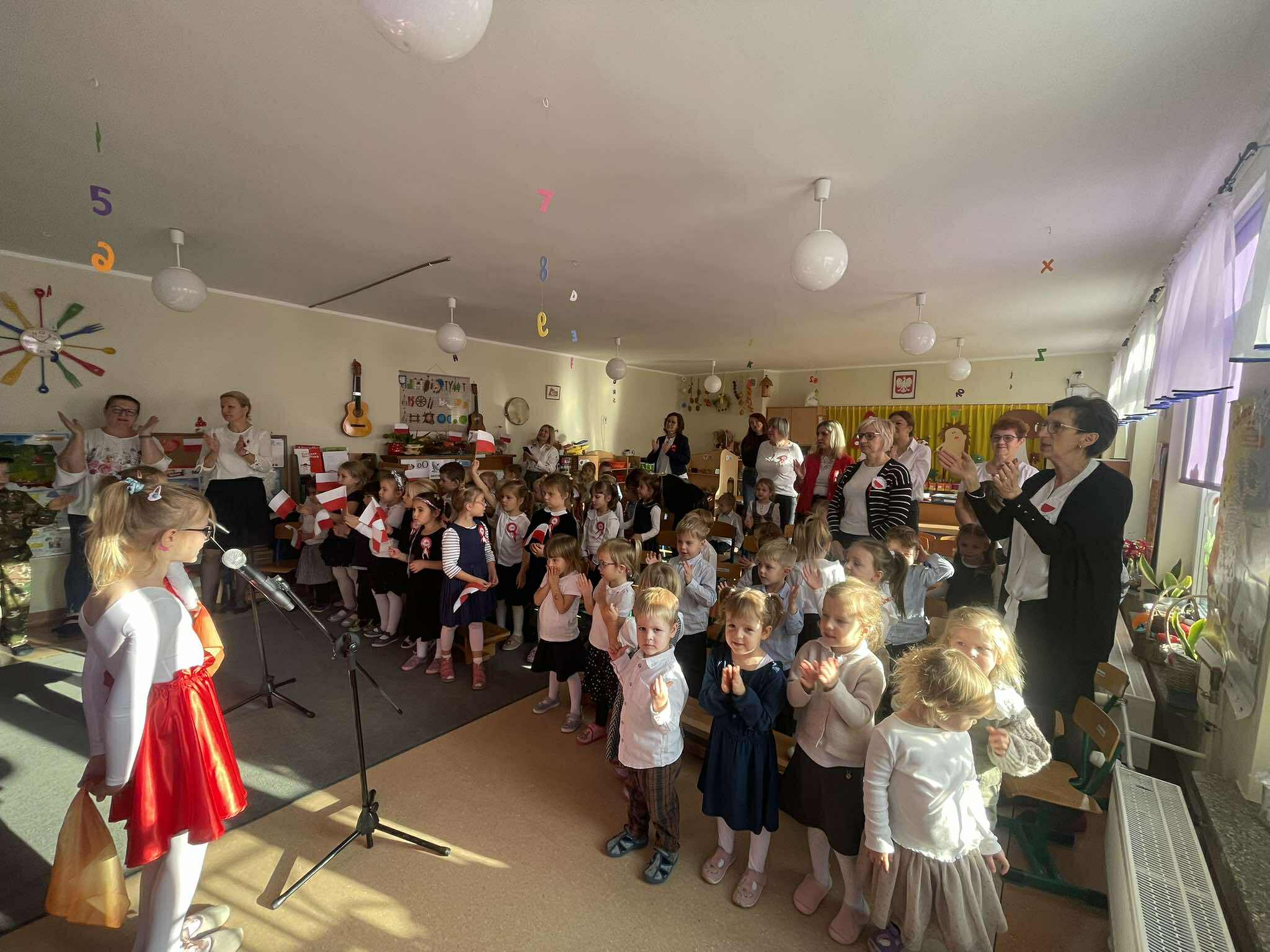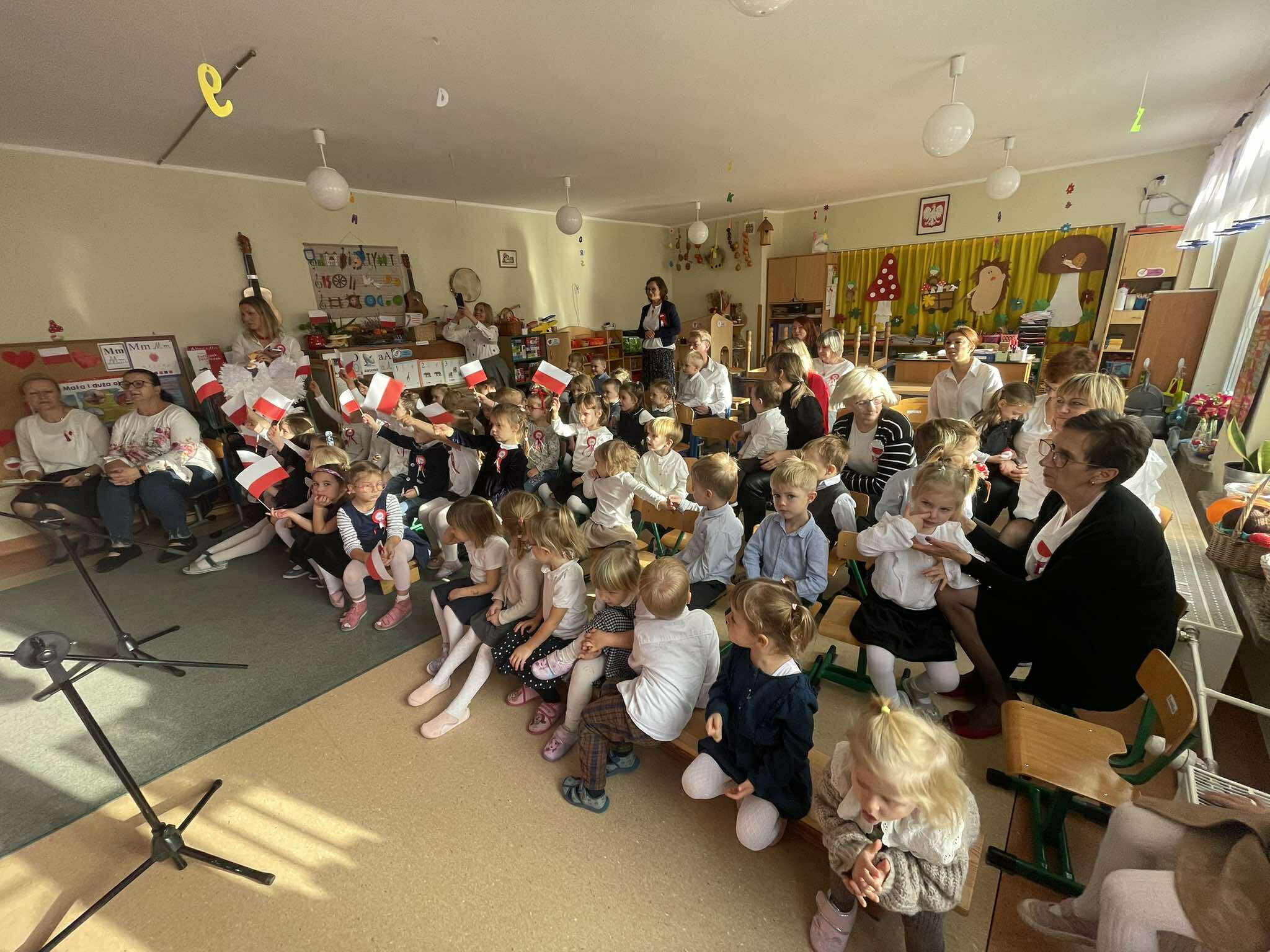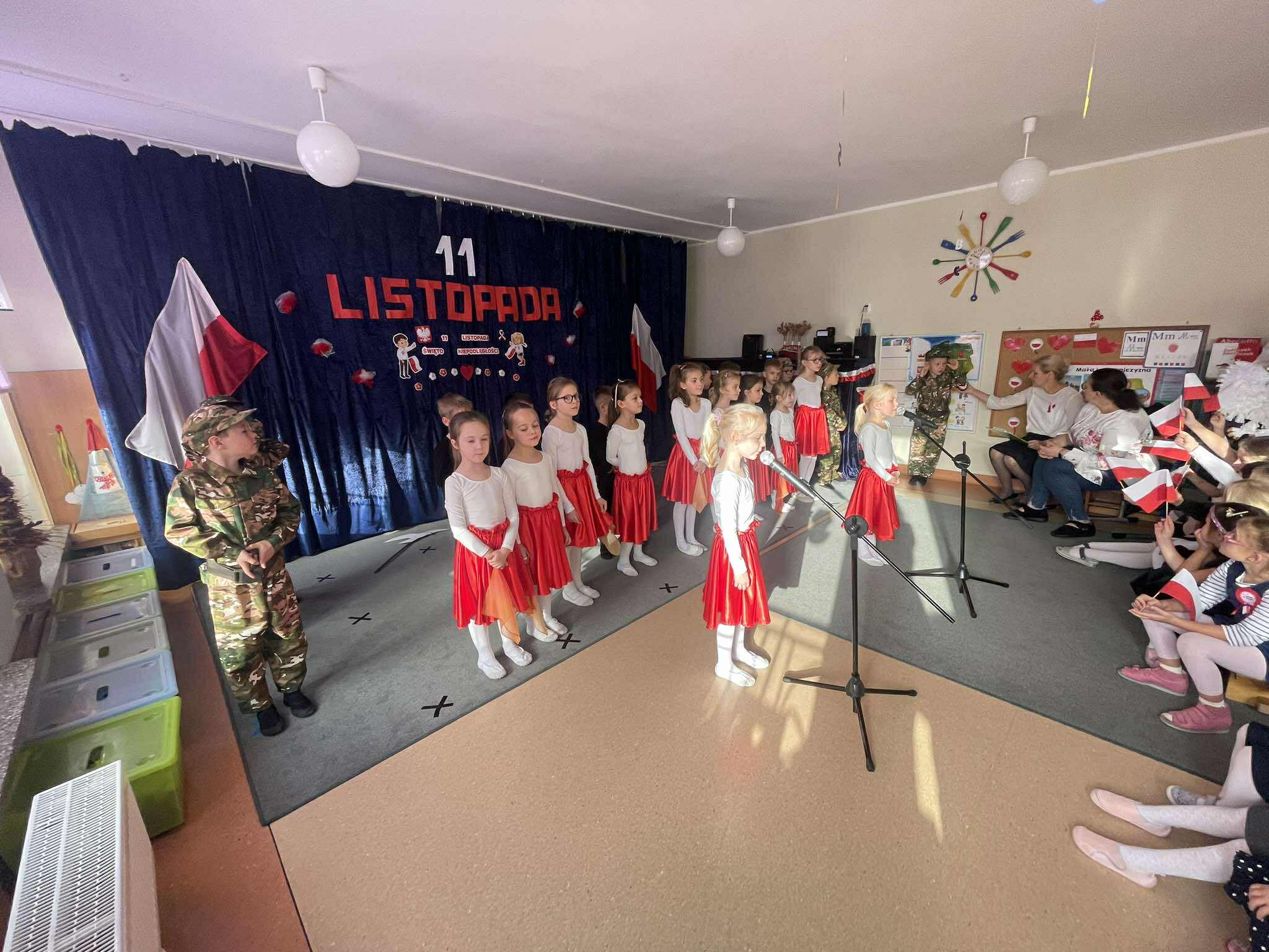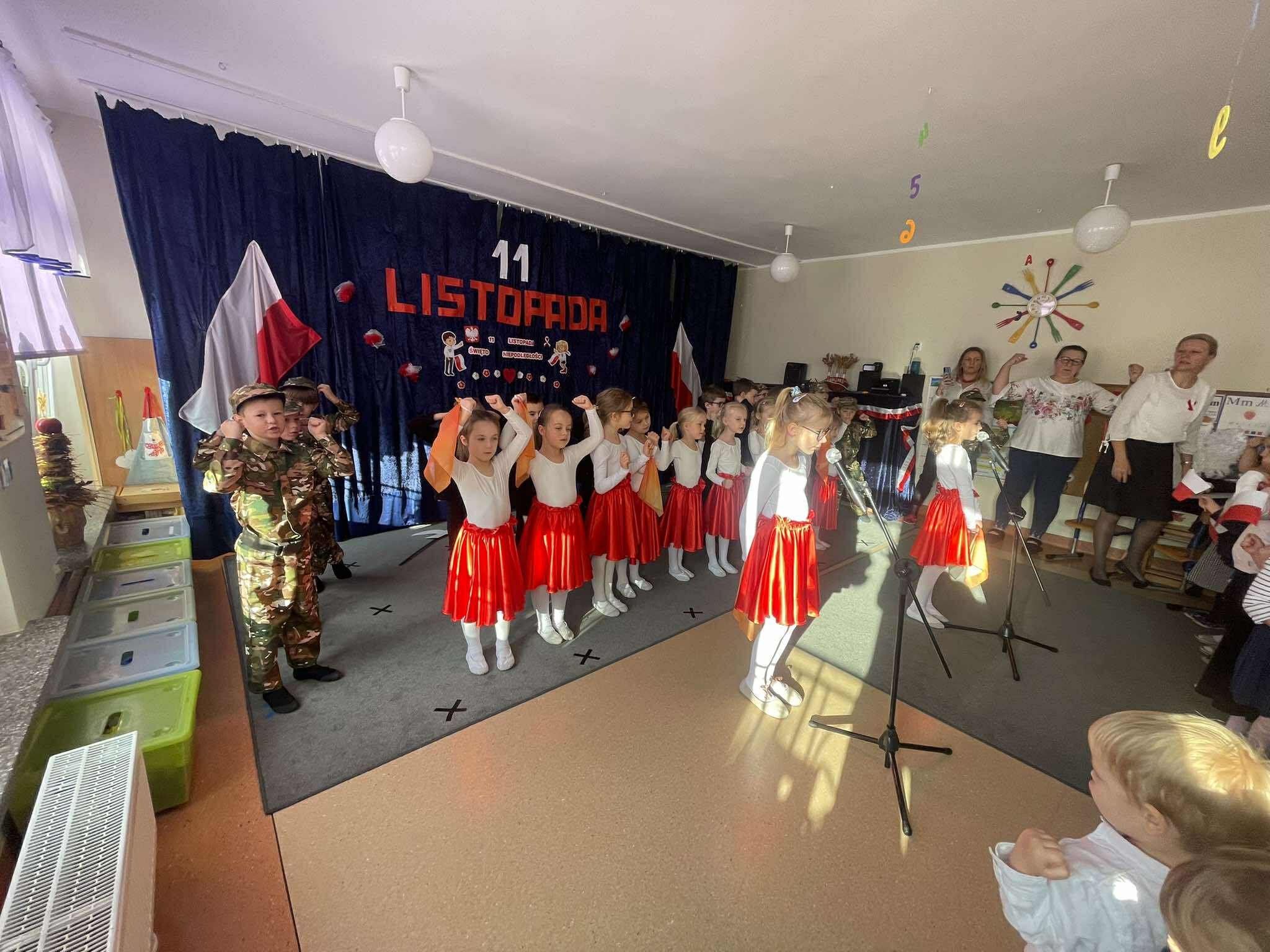 W piątek 7 listopada obchodziliśmy w przedszkolu Dzień odzyskania niepodległości przez Polskę. Grupa Muchomorków wystąpiła przed wszystkimi dziećmi przedszkolnymi z programem patriotycznym. Znalazły się w nim piosenki z Przeglądu Piosenki Patriotycznej z zeszłego roku oraz piosenki przygotowywane na tegoroczne widowisko w kinie Grom. Potem wystąpiły z krótkim programem artystycznym dzieci z innych grup. Na koniec wszyscy razem zaśpiewaliśmy 4 zwrotki Mazurka Dąbrowskiego.