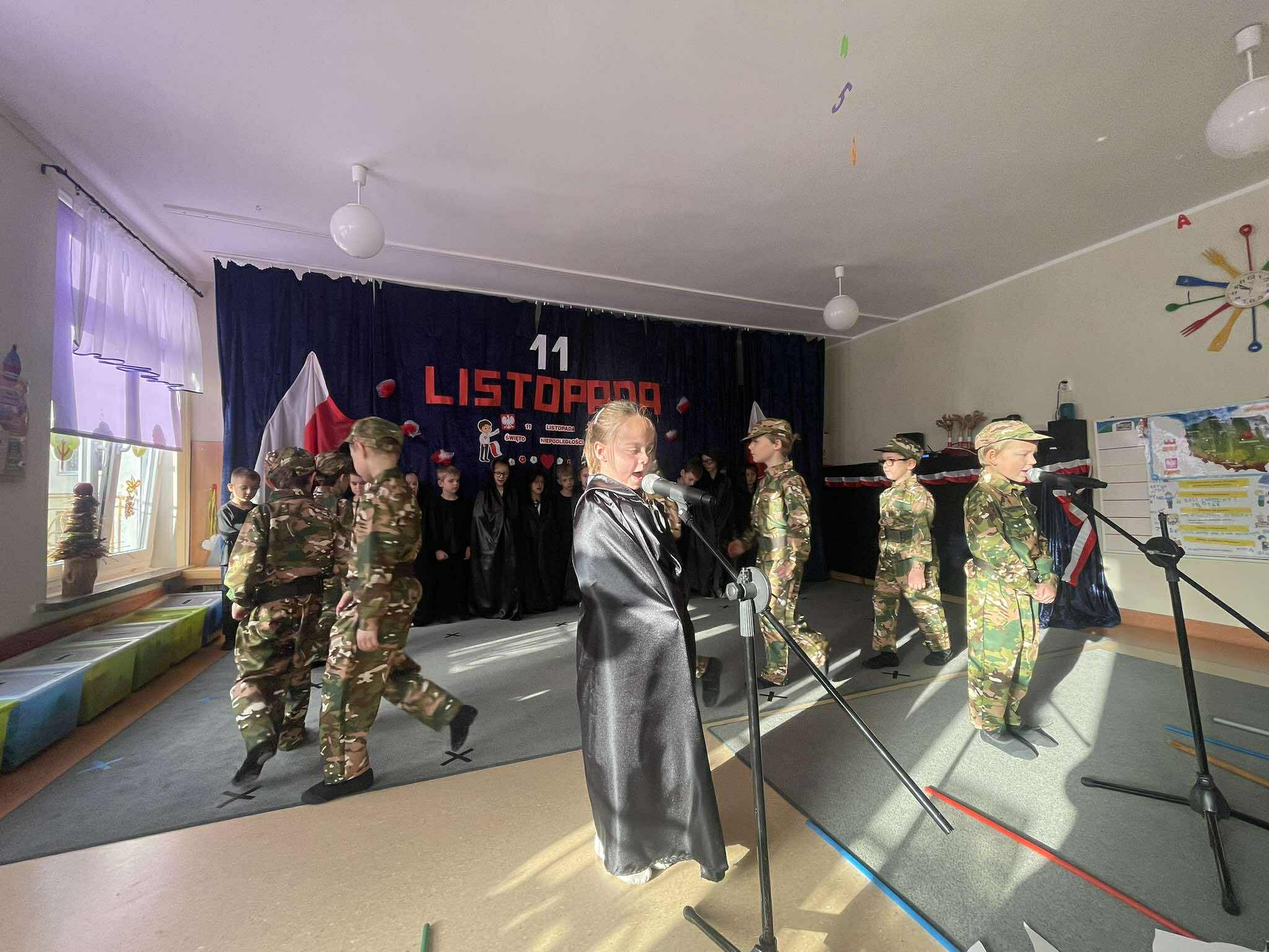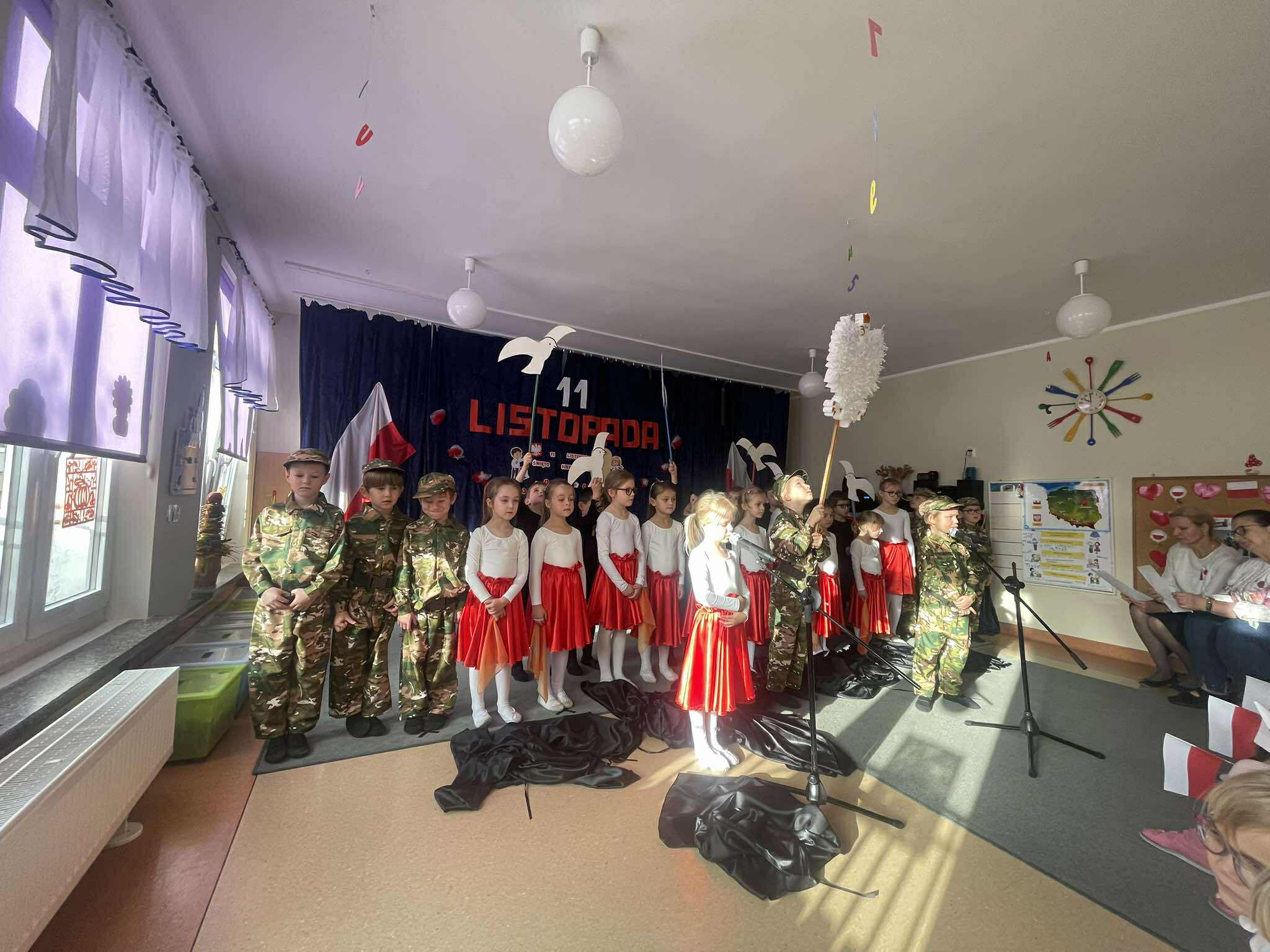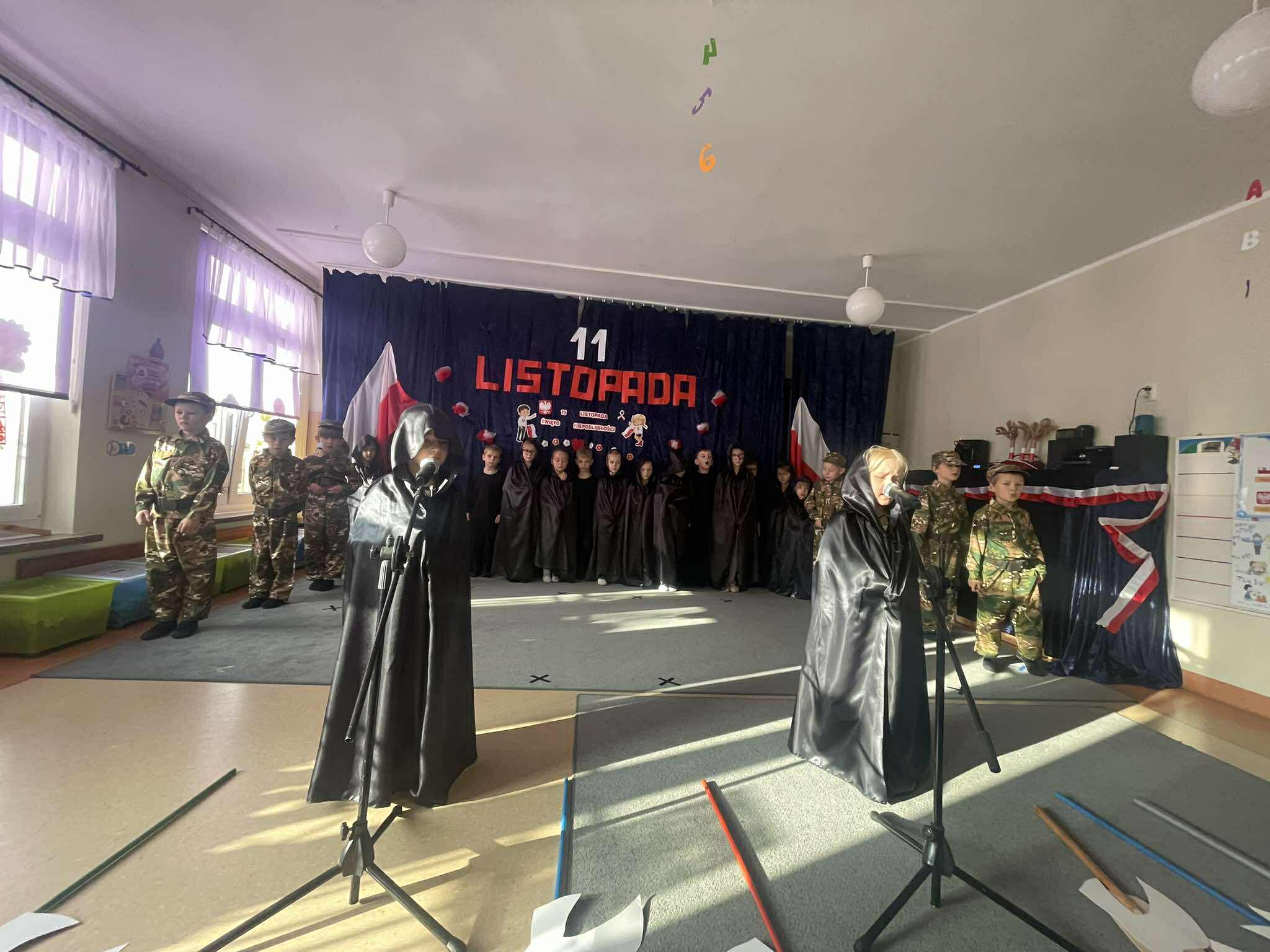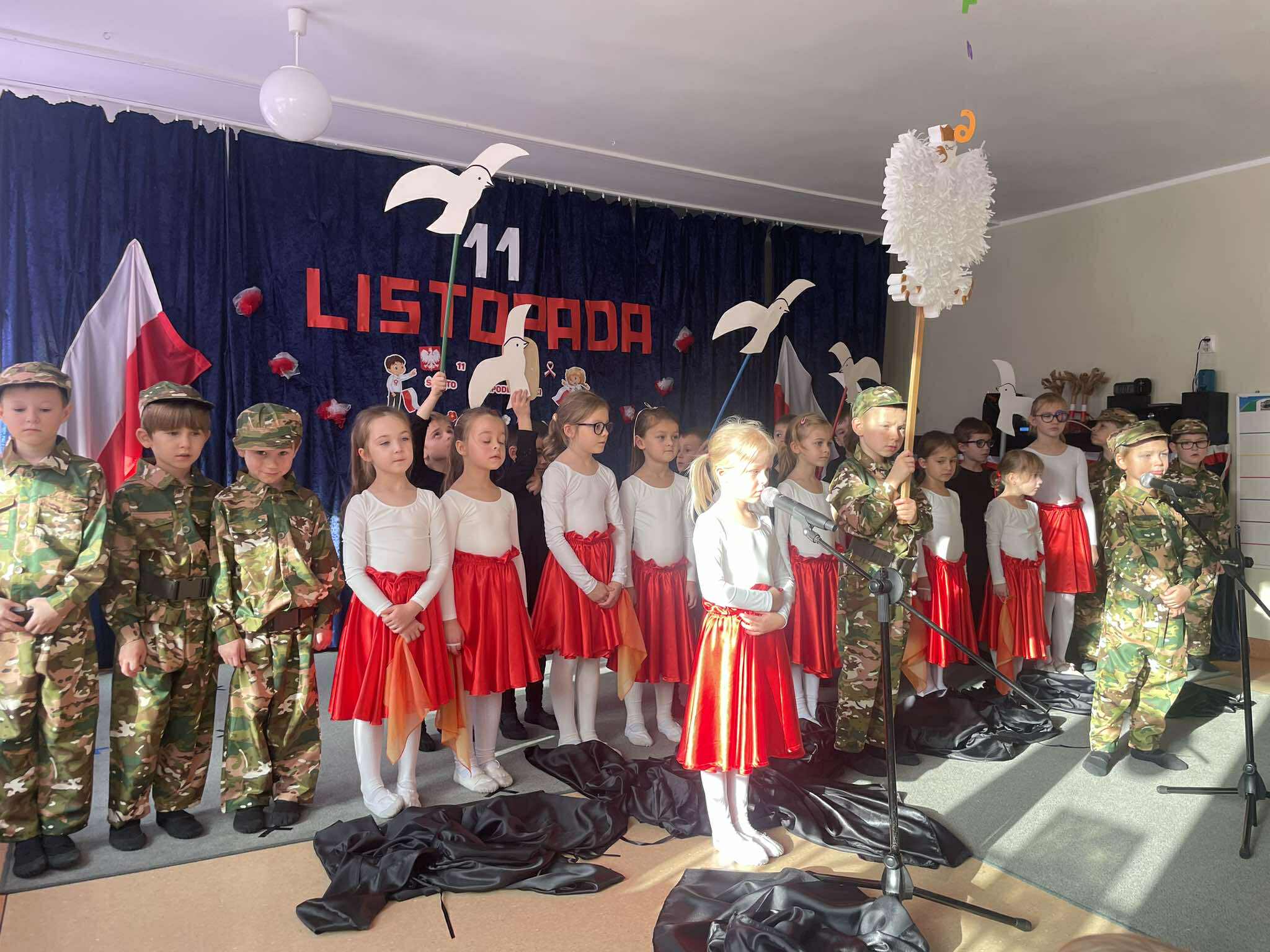 W piątek 7 listopada obchodziliśmy w przedszkolu Dzień odzyskania niepodległości przez Polskę. Grupa Muchomorków wystąpiła przed wszystkimi dziećmi przedszkolnymi z programem patriotycznym. Znalazły się w nim piosenki z Przeglądu Piosenki Patriotycznej z zeszłego roku oraz piosenki przygotowywane na tegoroczne widowisko w kinie Grom. Potem wystąpiły z krótkim programem artystycznym dzieci z innych grup. Na koniec wszyscy razem zaśpiewaliśmy 4 zwrotki Mazurka Dąbrowskiego.
