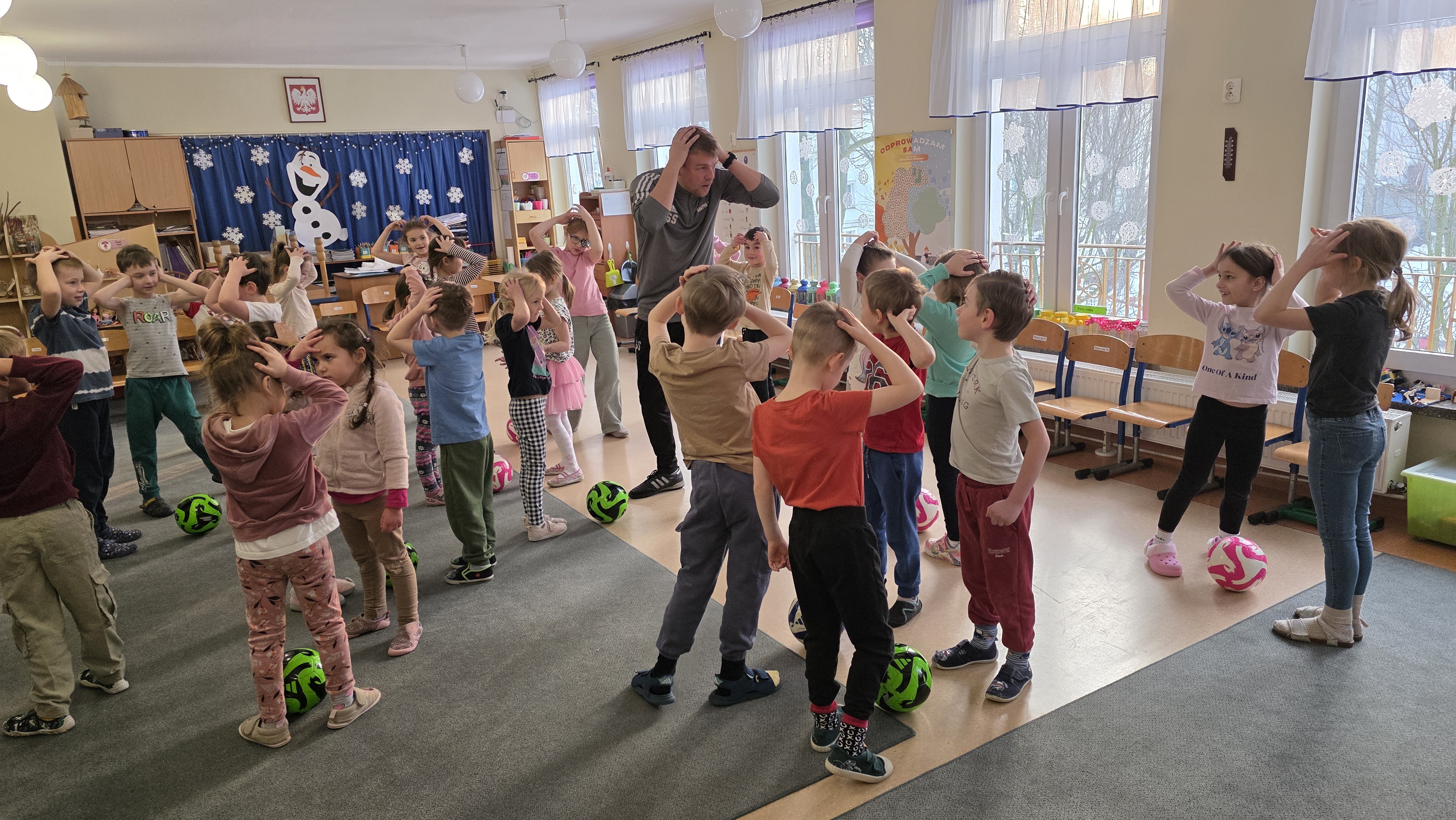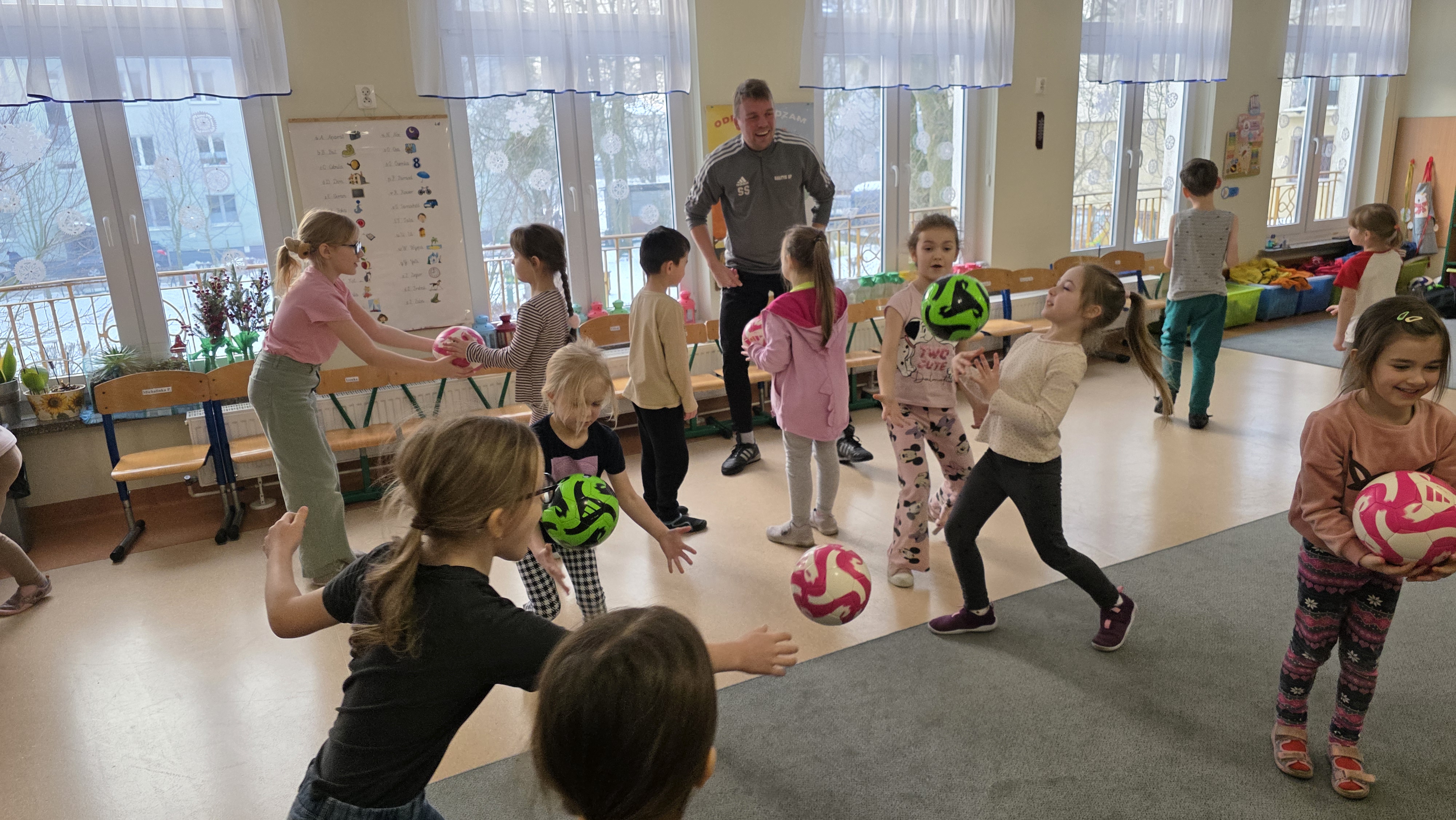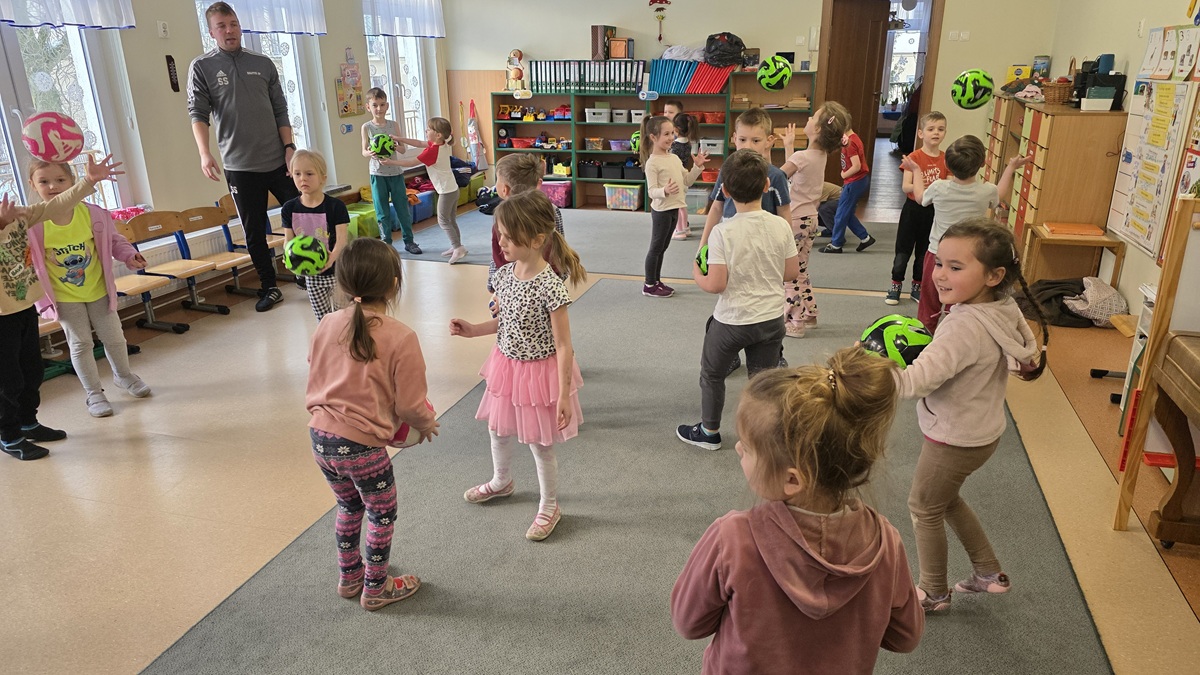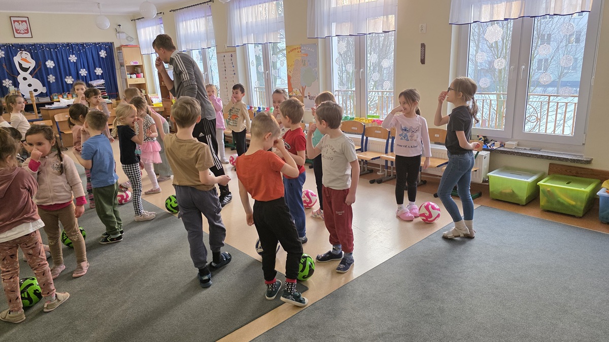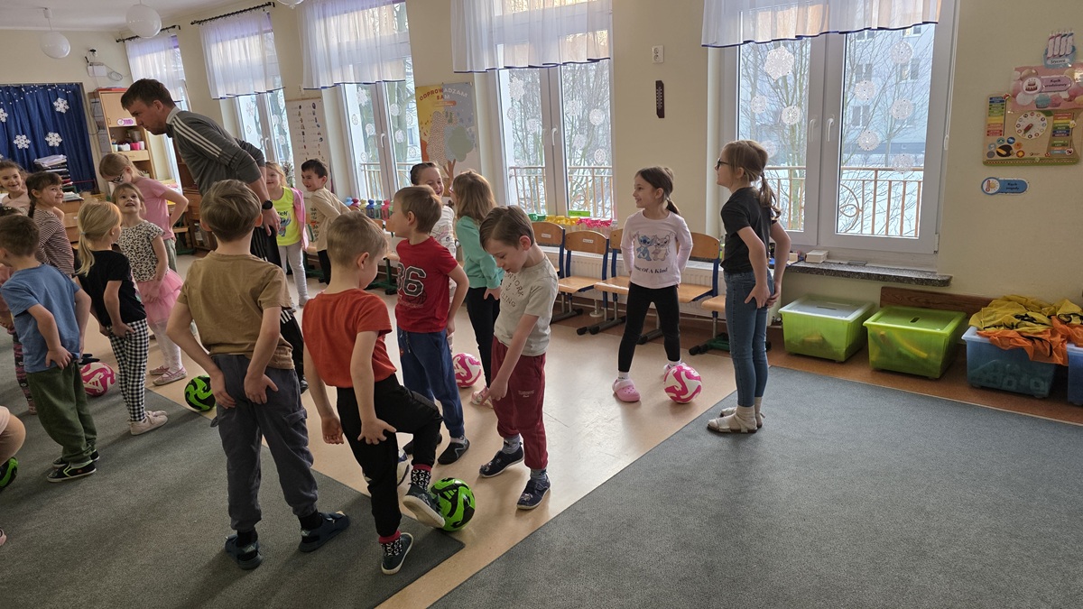 Dzisiaj odwiedził nas p. Szymon - instruktor akademii piłkarskiej "Bałtyk"Gdynia. Najpierw poprowadził krótką rozgrzewkę, która wprowadziła dzieci w dobry nastrój a potem wszyscy mieli okazję do różnorodnych ćwiczeń z piłką.